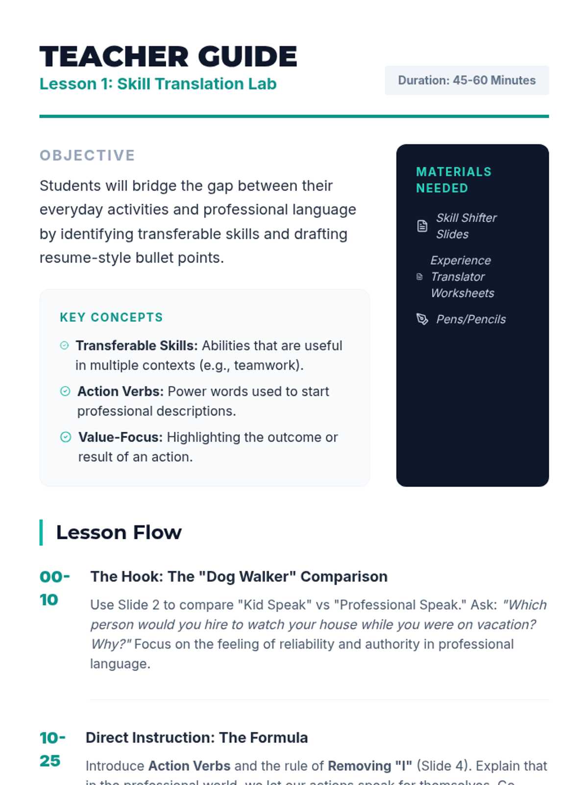 This sequence guides seventh-grade students through the foundational process of constructing their first professional resume. It covers identifying transferable skills, using action-oriented language, and mastering professional formatting through interactive workshops and simulations.