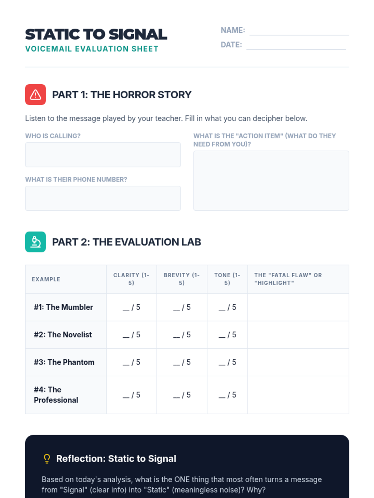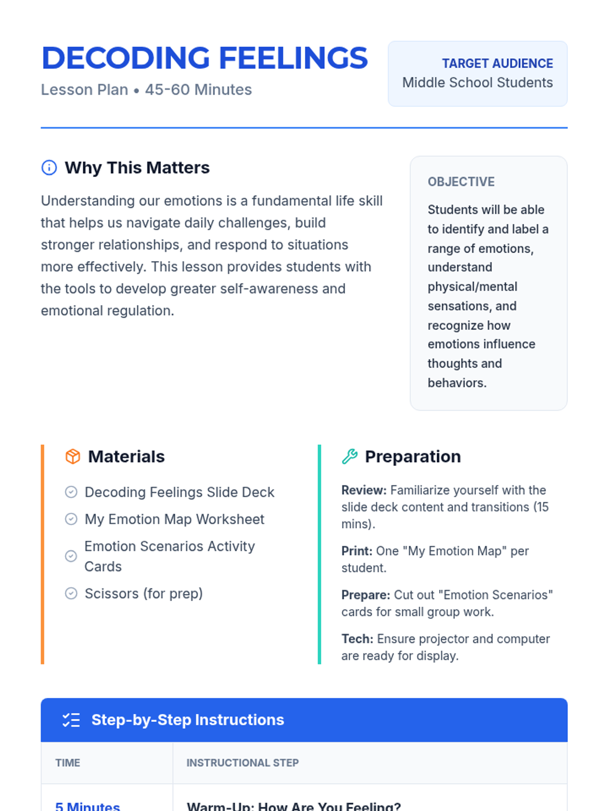 A 5-day communication and emotional intelligence unit for 8th graders. Using the metaphor of radio signals, students learn to identify emotional "static," regulate their "frequency," and broadcast "clear signals" in collaborative environments.