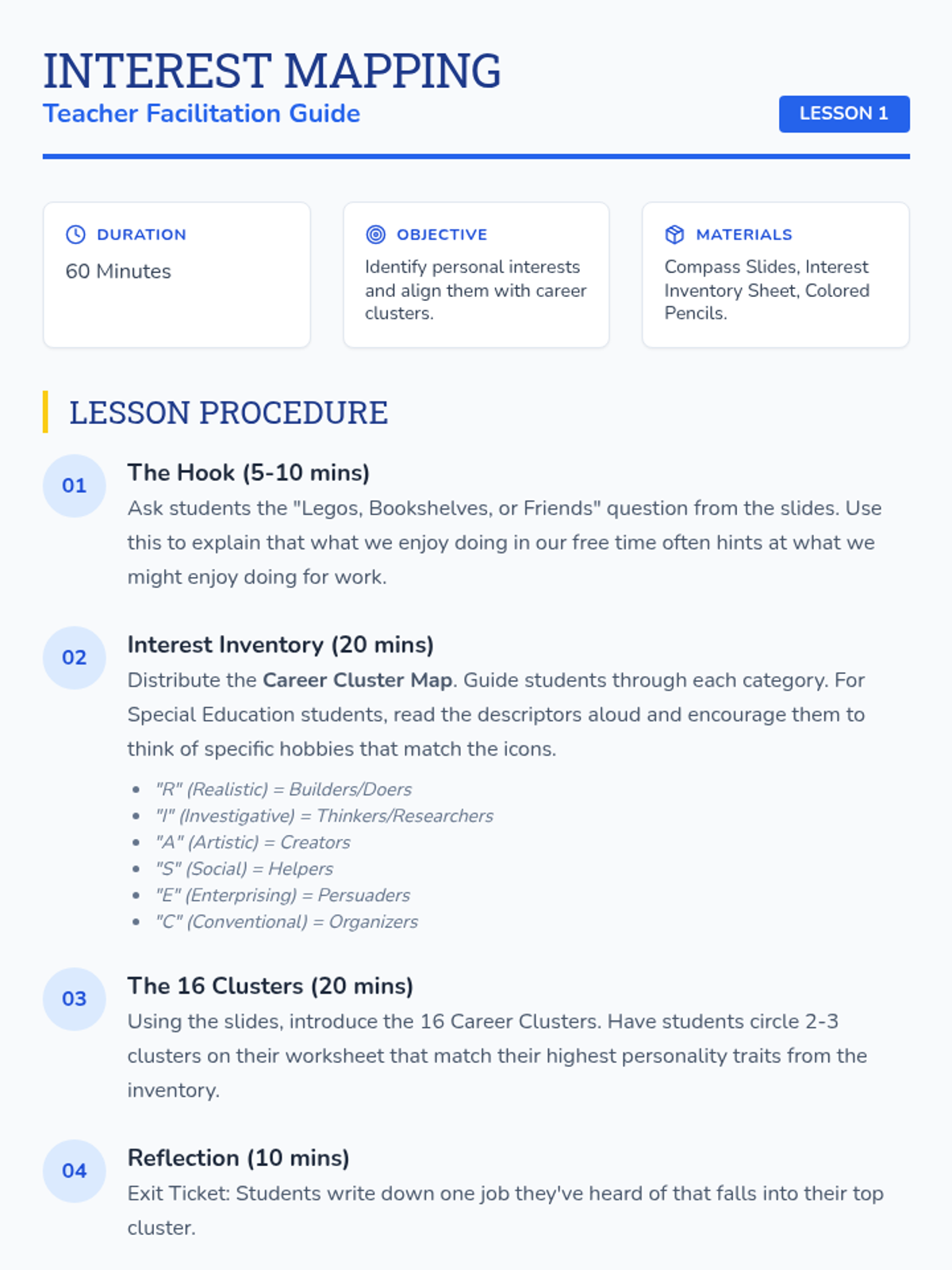This sequence guides 8th-grade students through self-discovery and career exploration, helping them bridge the gap between their current interests and future professional opportunities. Students will explore career clusters, identify employability skills, conduct job research, and practice professional communication.