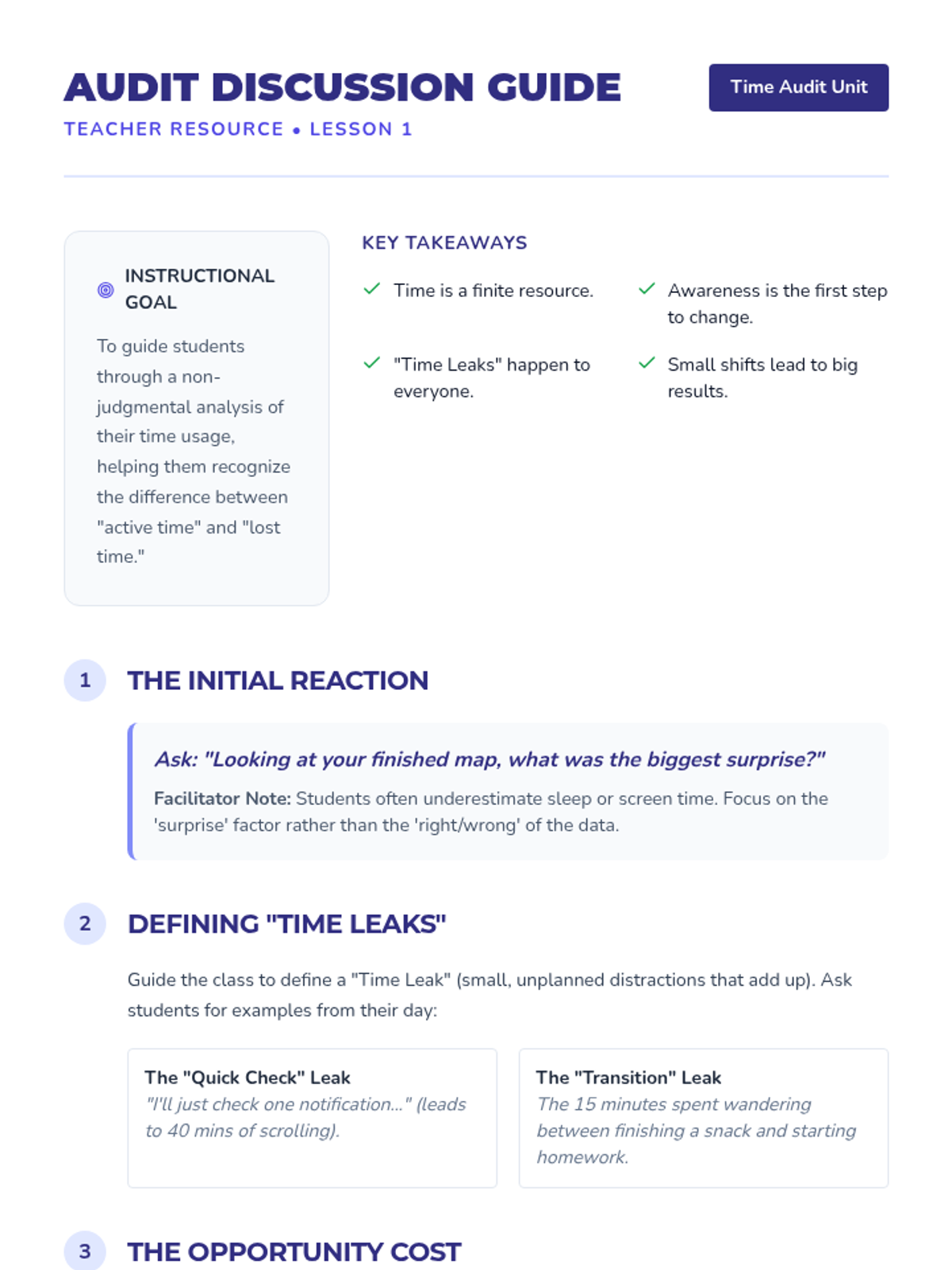 A game-based simulation sequence for 8th-grade students to master time and energy management. Students treat time as a finite currency, navigate trade-offs through opportunity cost simulations, and design a sustainable weekly schedule.