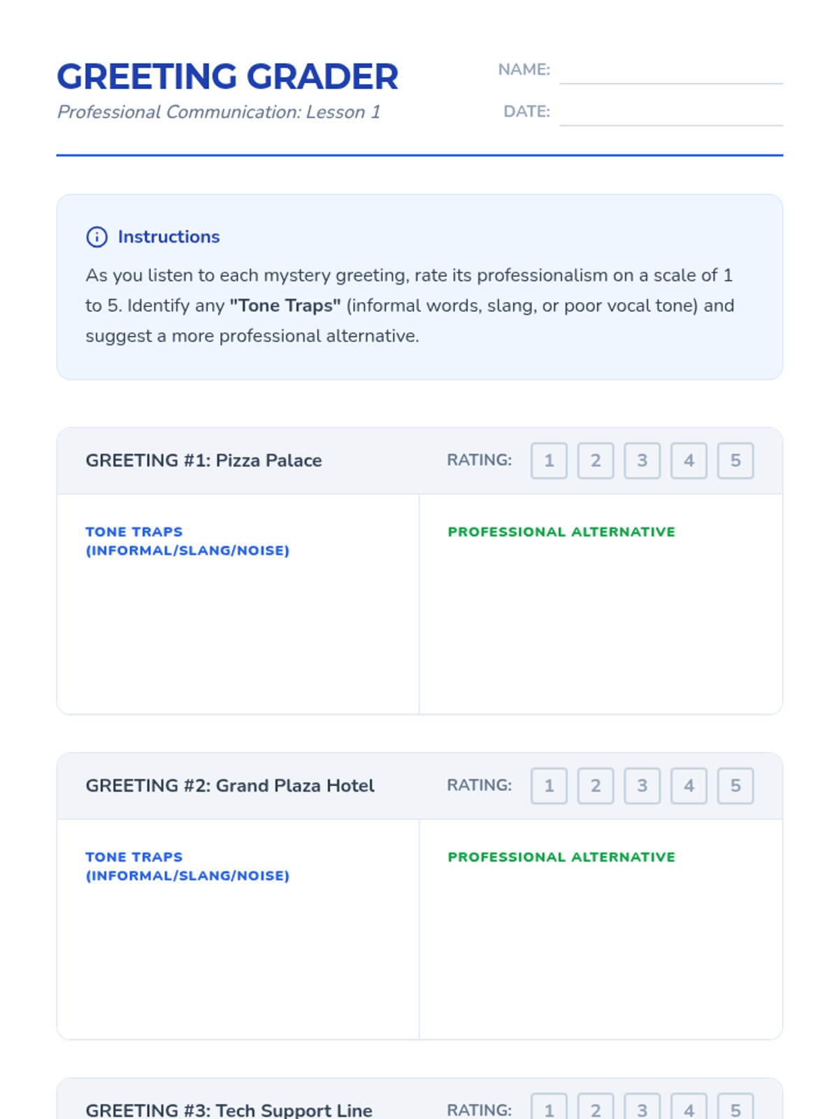 A game-based sequence focusing on the vocal mechanics of phone communication, including enunciation, pacing, volume, and emotional tone. Students build professional audio communication skills through interactive drills and simulations.