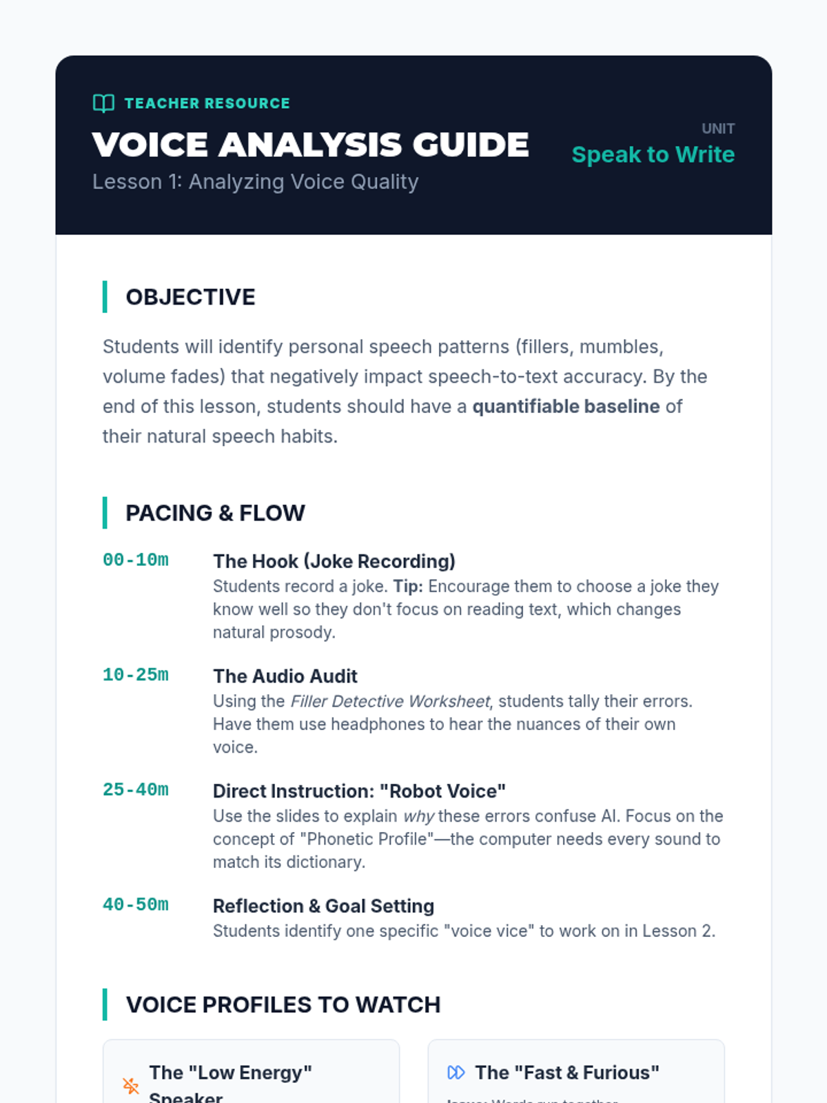 A sequence focused on the cognitive and linguistic aspects of dictation: fluency, pacing, and enunciation. Designed for 8th-grade students to improve speech clarity and mental composition for better speech-to-text accuracy.