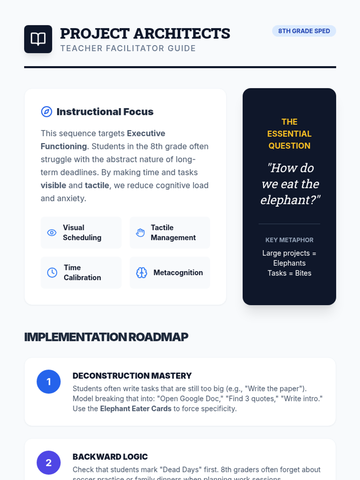 A specialized sequence for 8th-grade students focusing on executive functioning skills related to project management. Students learn to deconstruct complex assignments, plan backwards from deadlines, visualize overlapping tasks using Gantt charts, and adjust plans when setbacks occur.