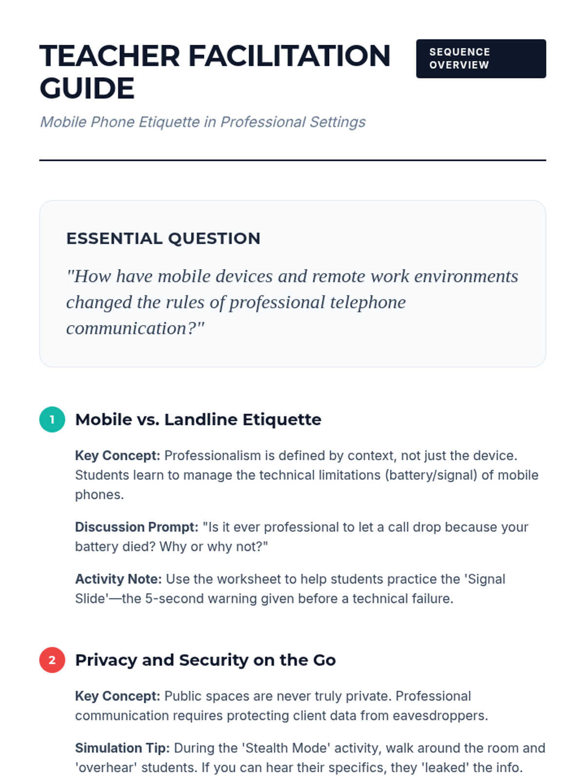 This inquiry-based sequence explores how mobile technology changes professional communication rules for 8th-grade students. They investigate etiquette for personal devices, privacy, speakerphone usage, and the decision between texting and calling, culminating in the creation of a workplace mobile usage policy.