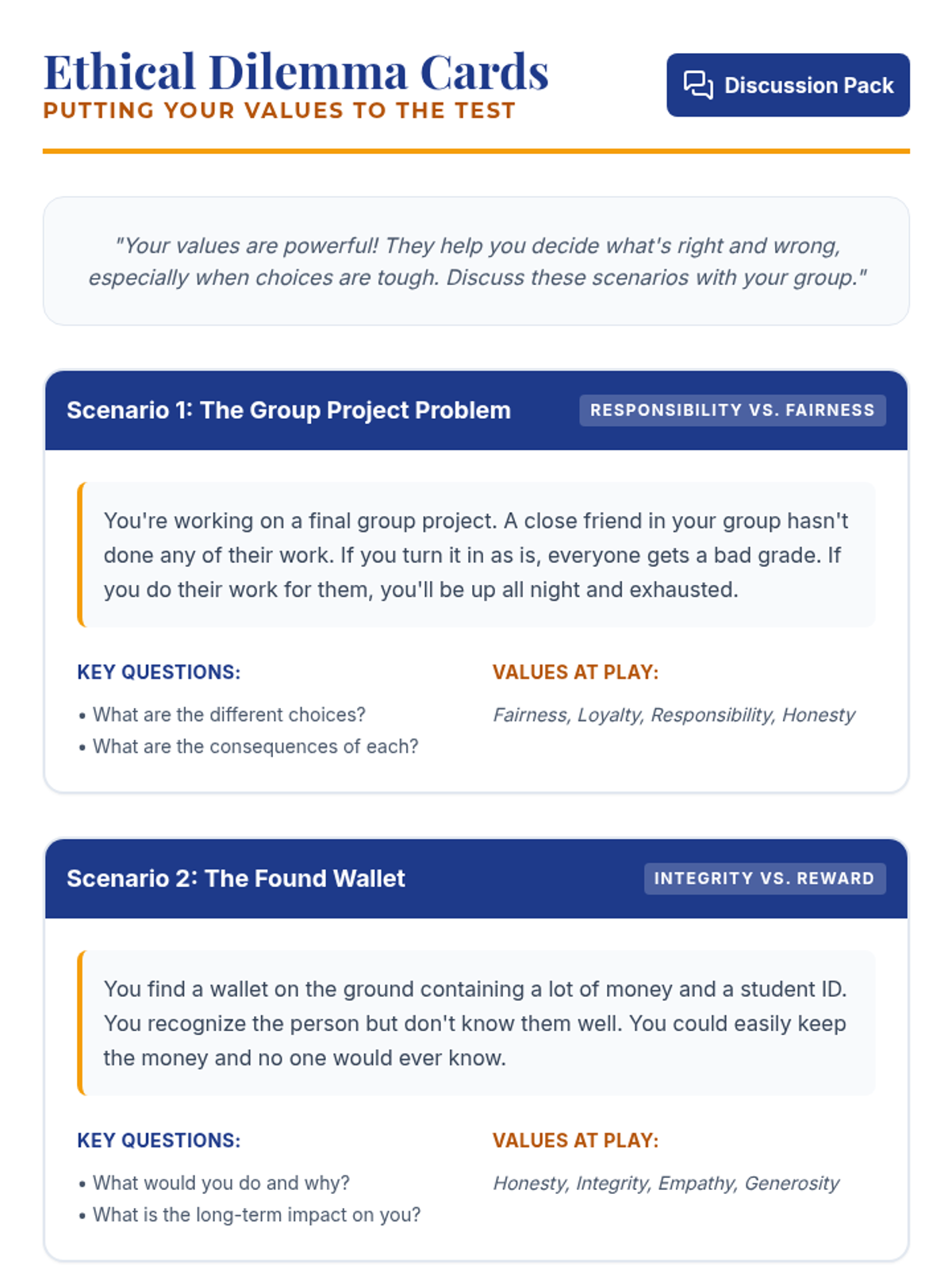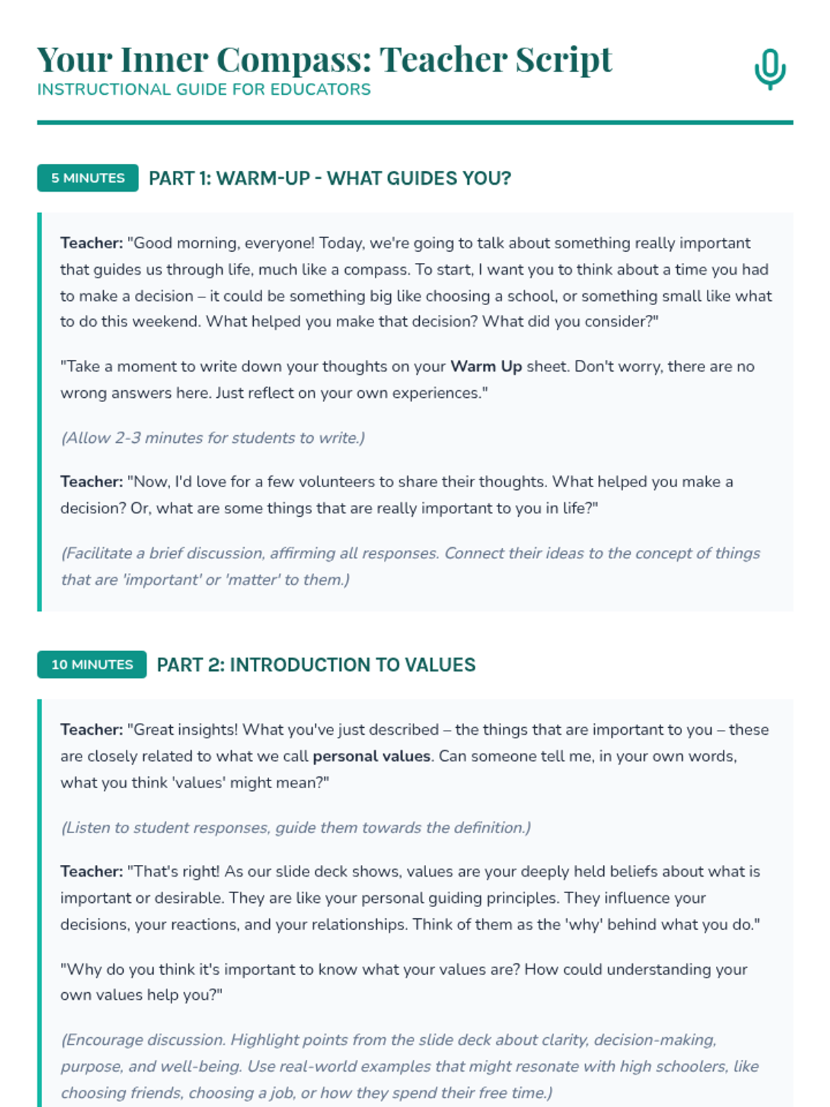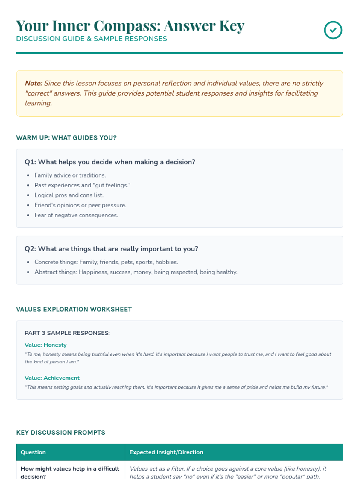 A multi-session series for middle school students to explore personal values and how they act as an 'inner compass' for ethical decision-making.
