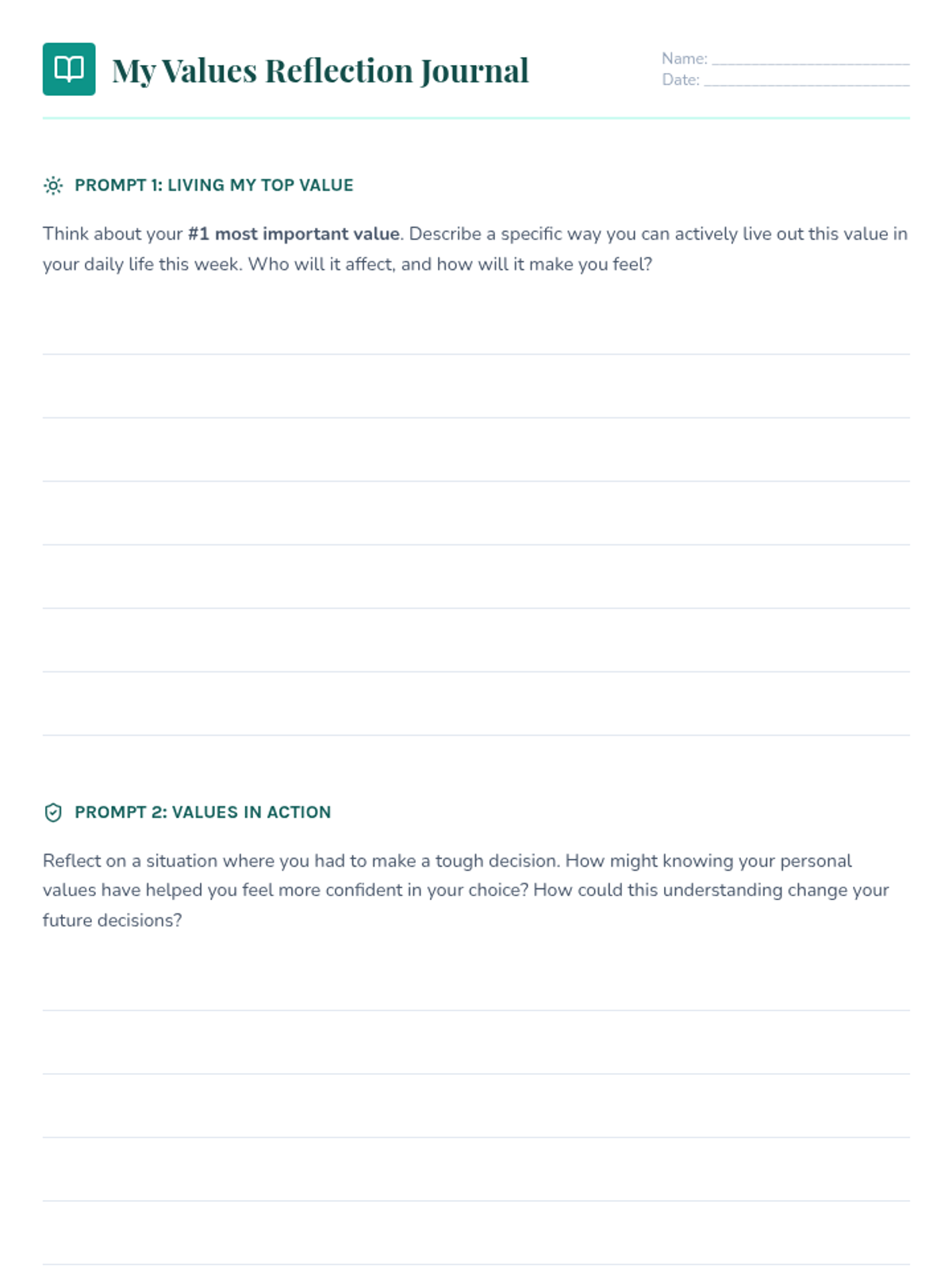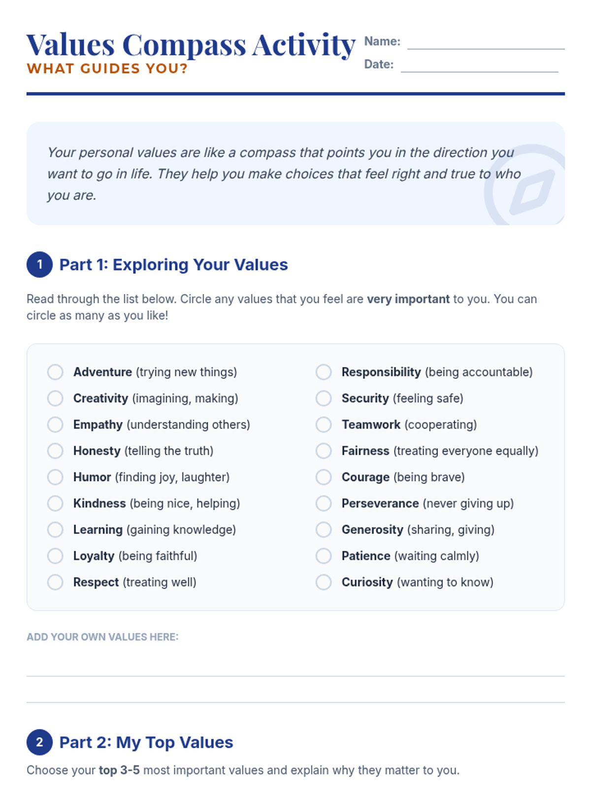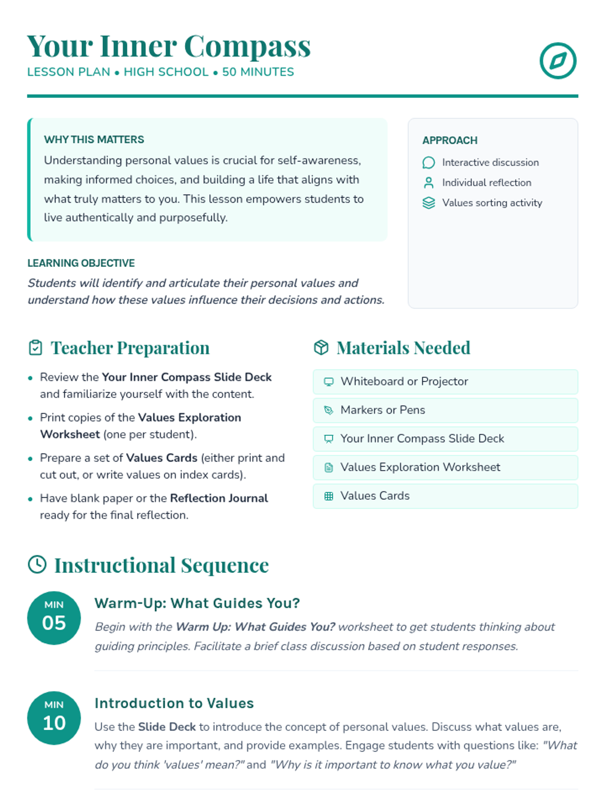 A series of self-discovery lessons designed to help students navigate their personal identity, from identifying core values in high school to building self-esteem in middle school.