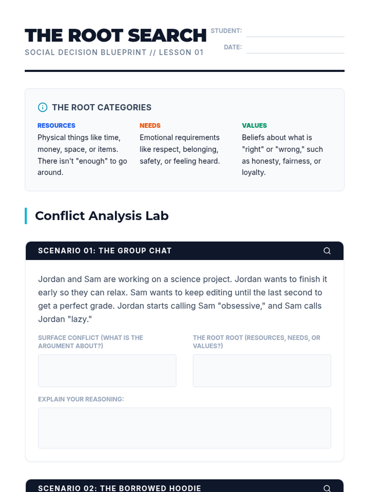 A comprehensive 6th-grade sequence on conflict navigation, teaching students to identify root causes, recognize personal conflict styles, practice perspective-taking, understand escalation, and diagnose complex disputes.