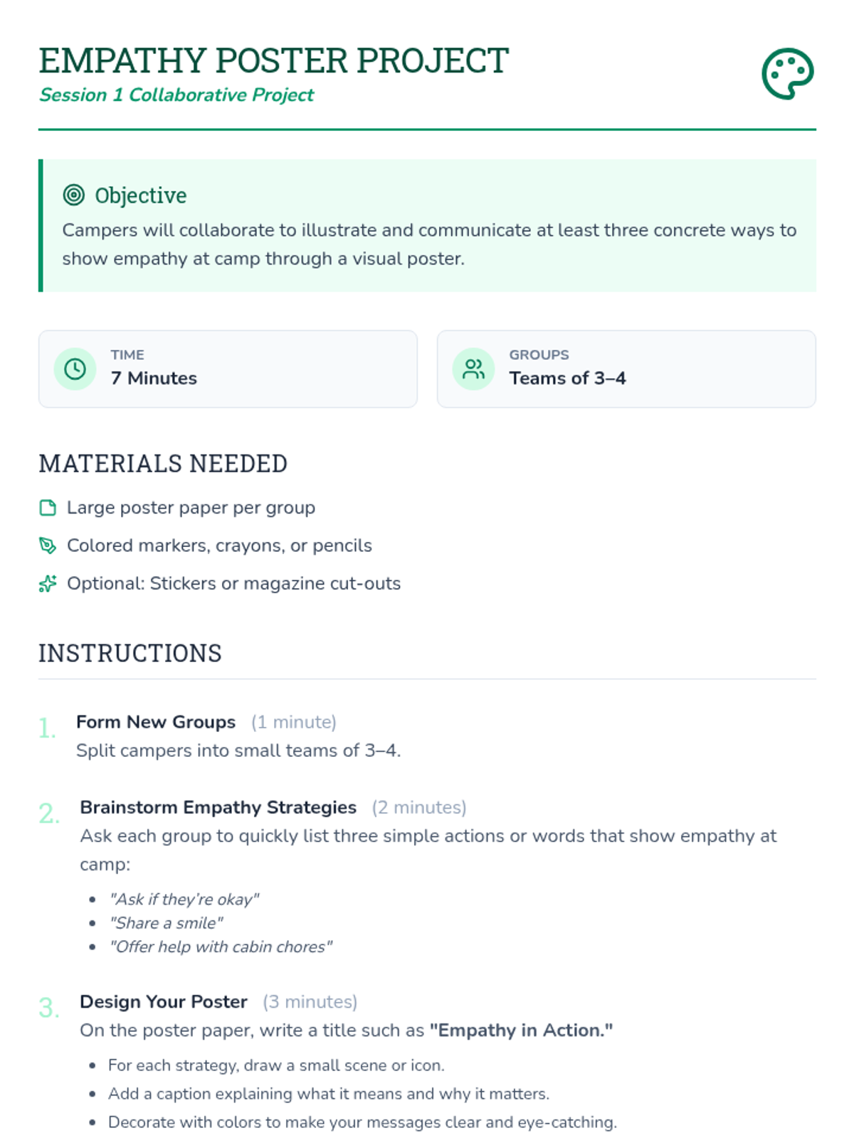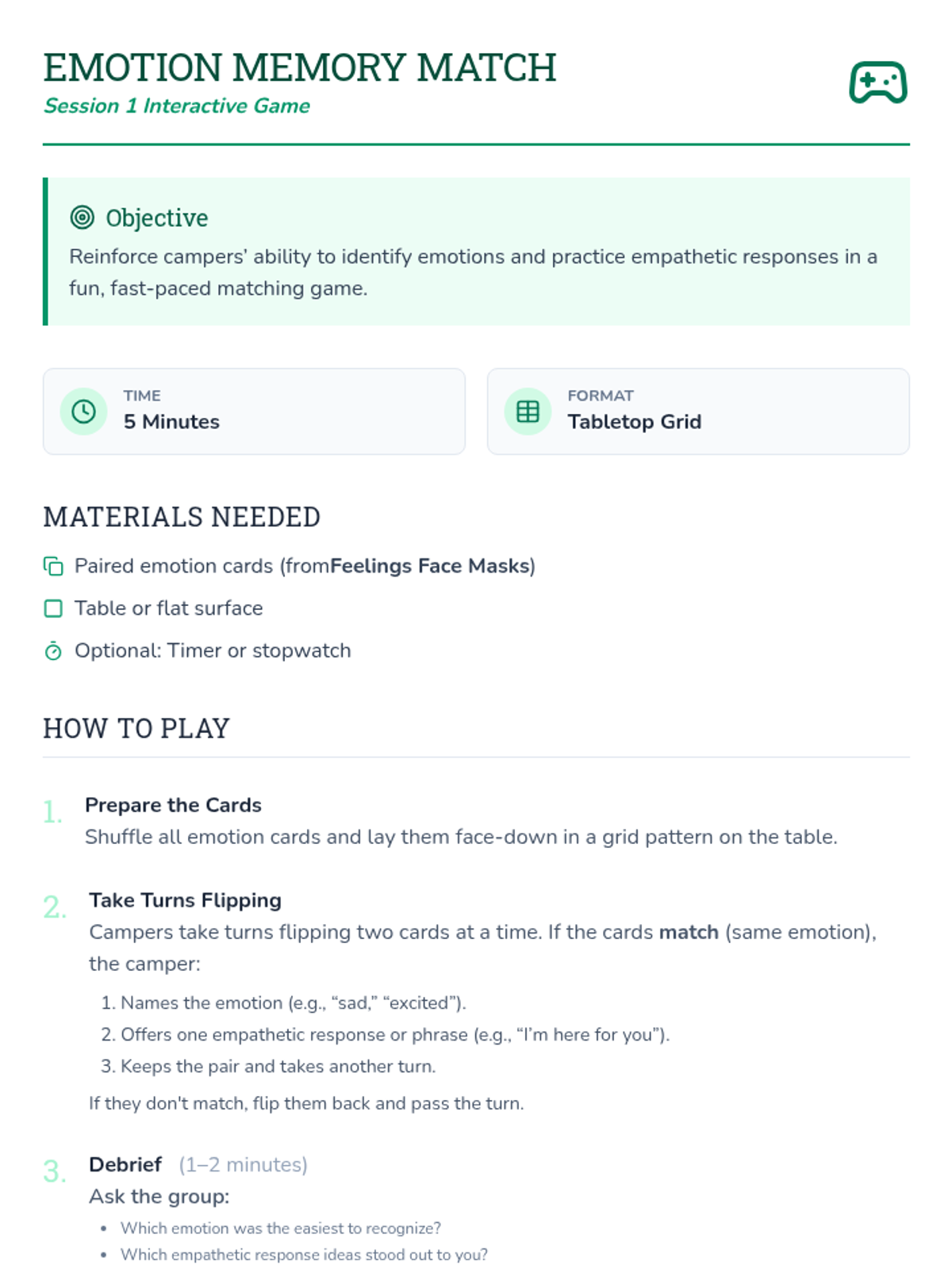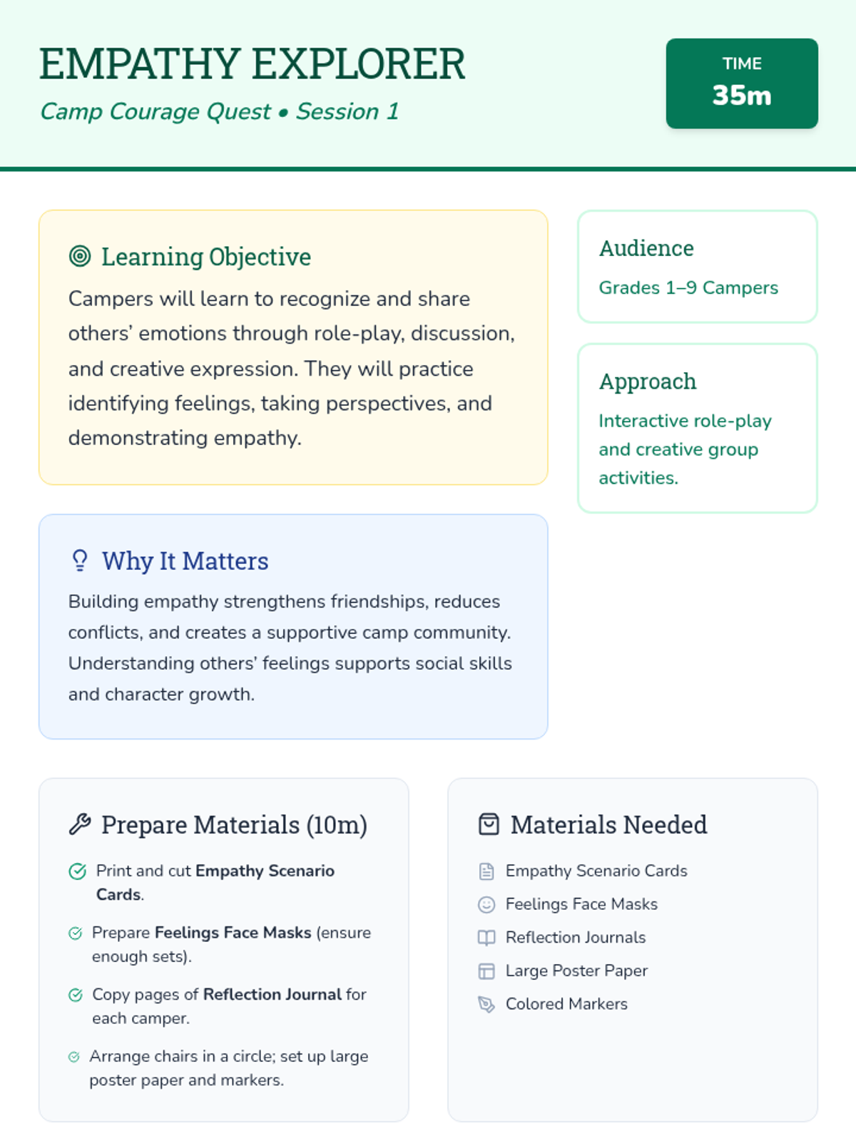 A 4-session character development curriculum for campers in grades 1–9 focusing on empathy, resilience, teamwork, and integrity through interactive group activities.