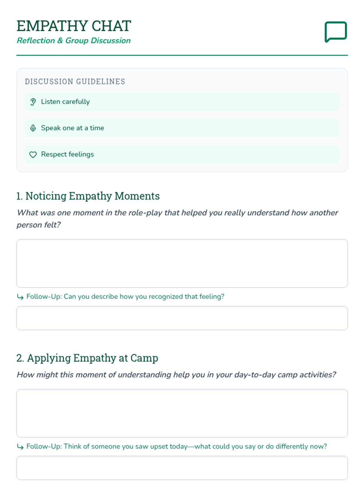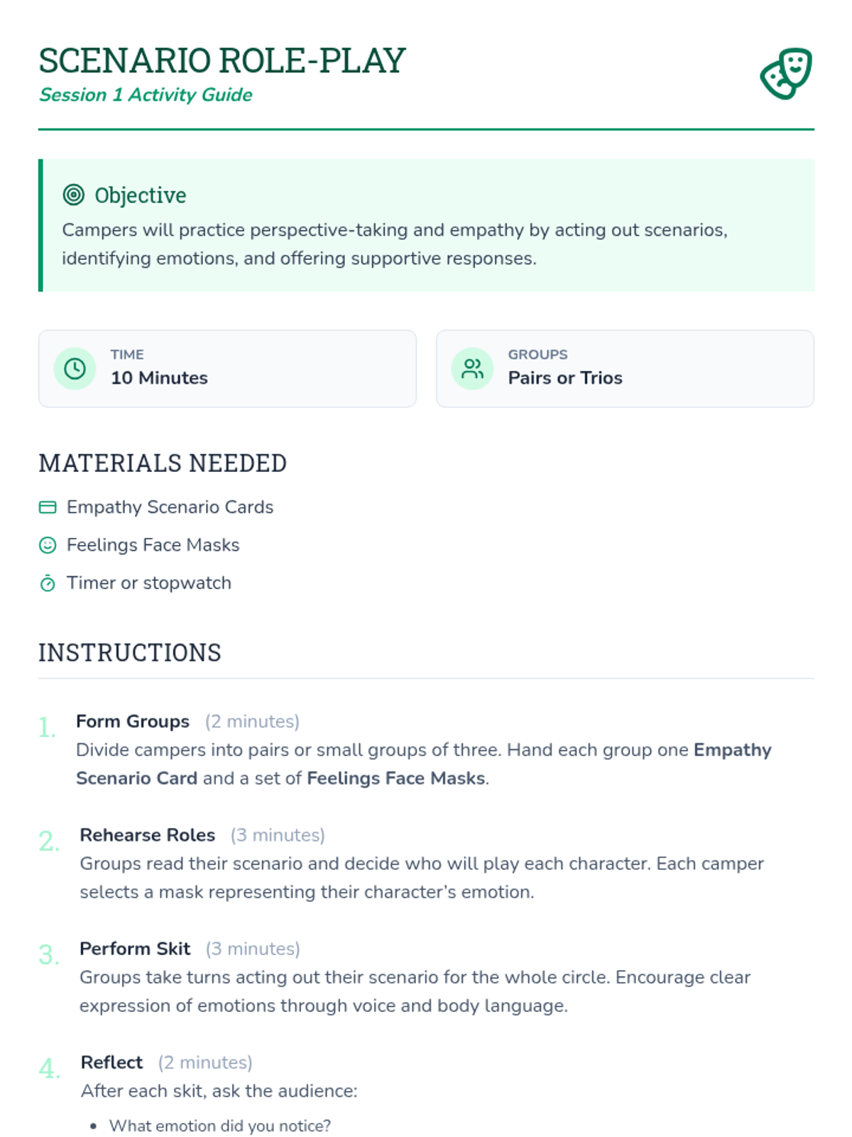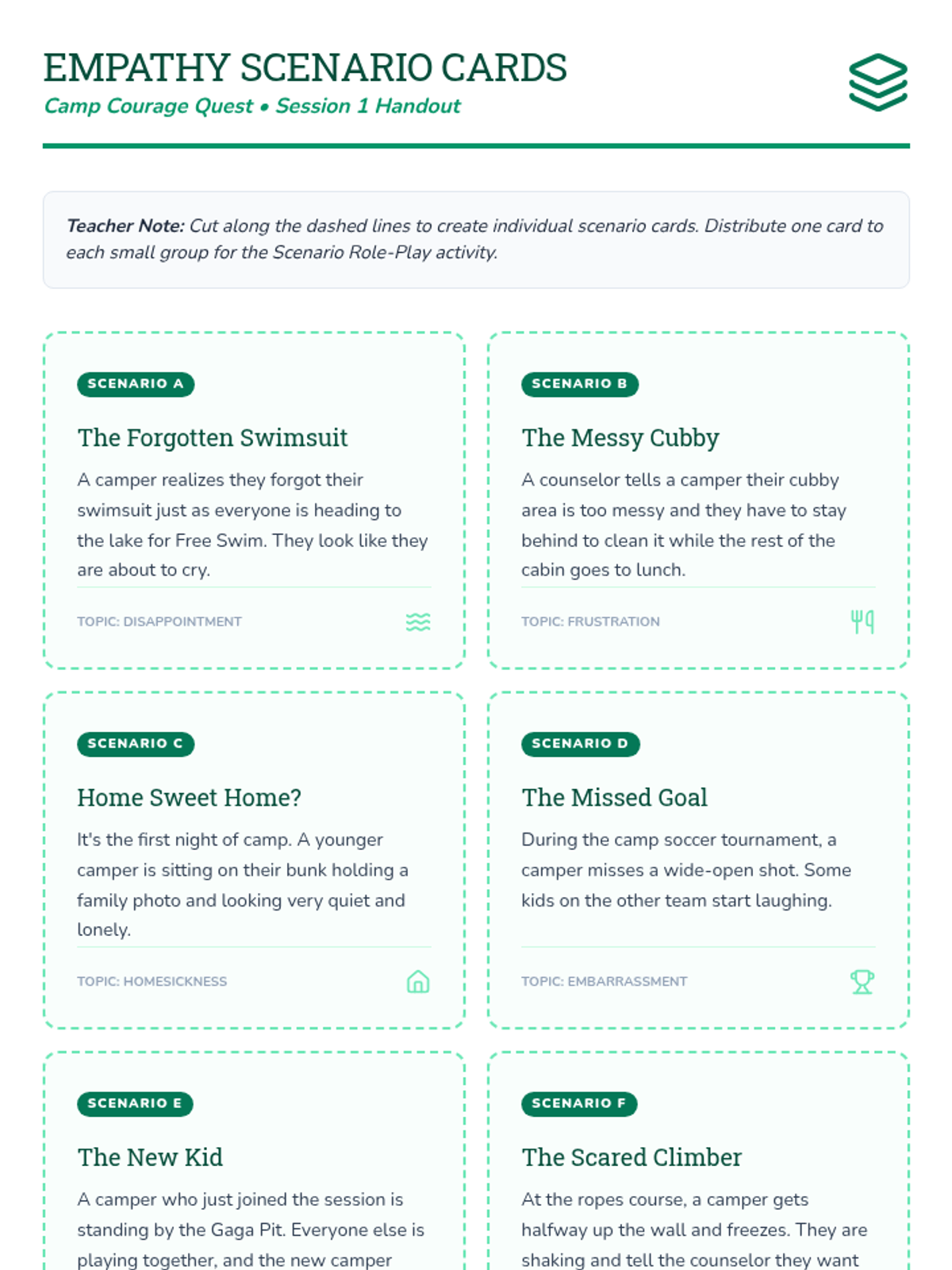 A 4-session character development curriculum for campers in grades 1–9 focusing on empathy, resilience, teamwork, and integrity through interactive group activities.