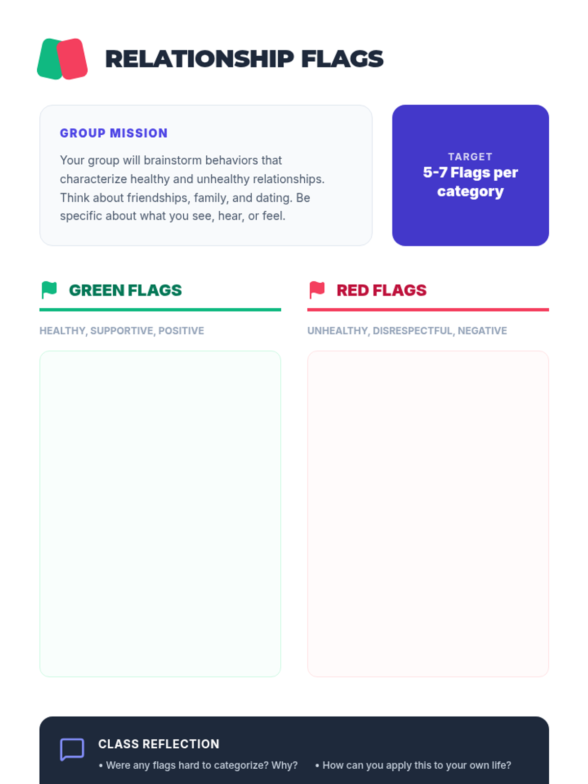 This project-based sequence explores emotional safety and decision-making in relationships. Students learn to balance friendships with romantic interests, trust their intuition, build resilience through rejection, and advocate for equality in their connections, culminating in a personal 'Relationship Rights' zine.