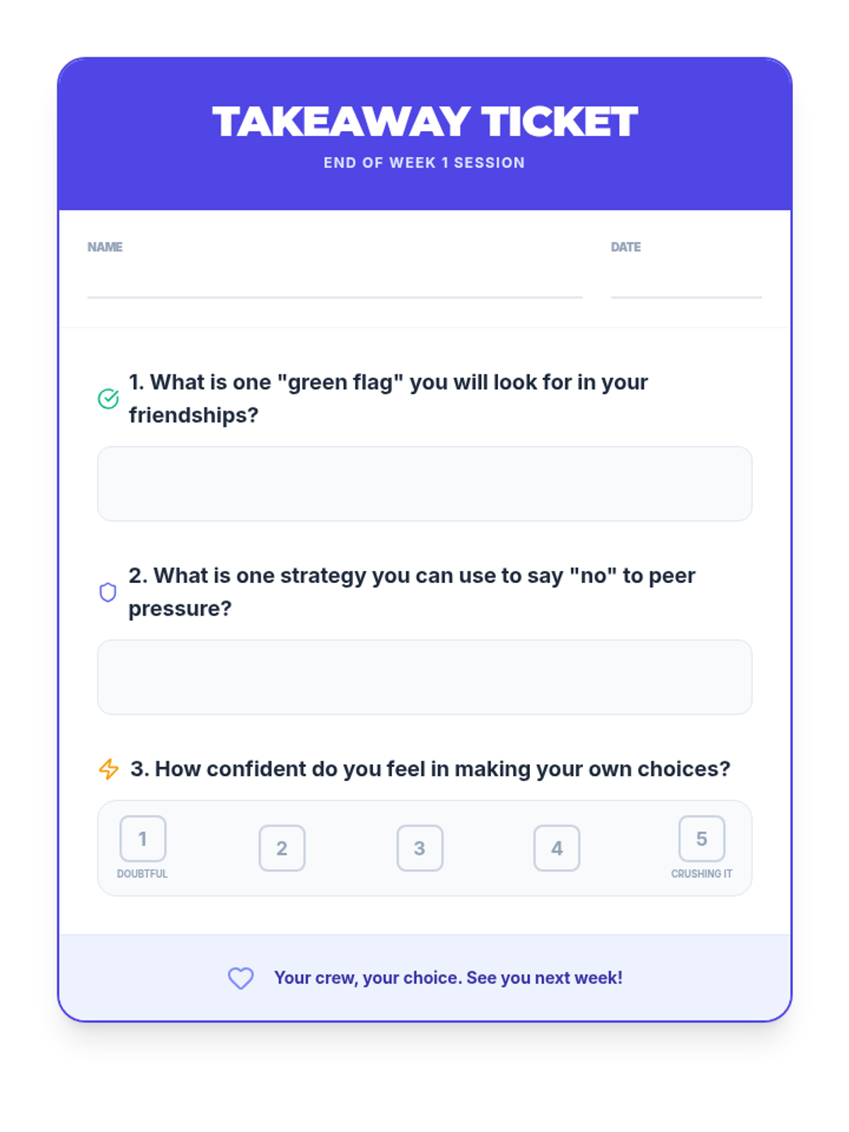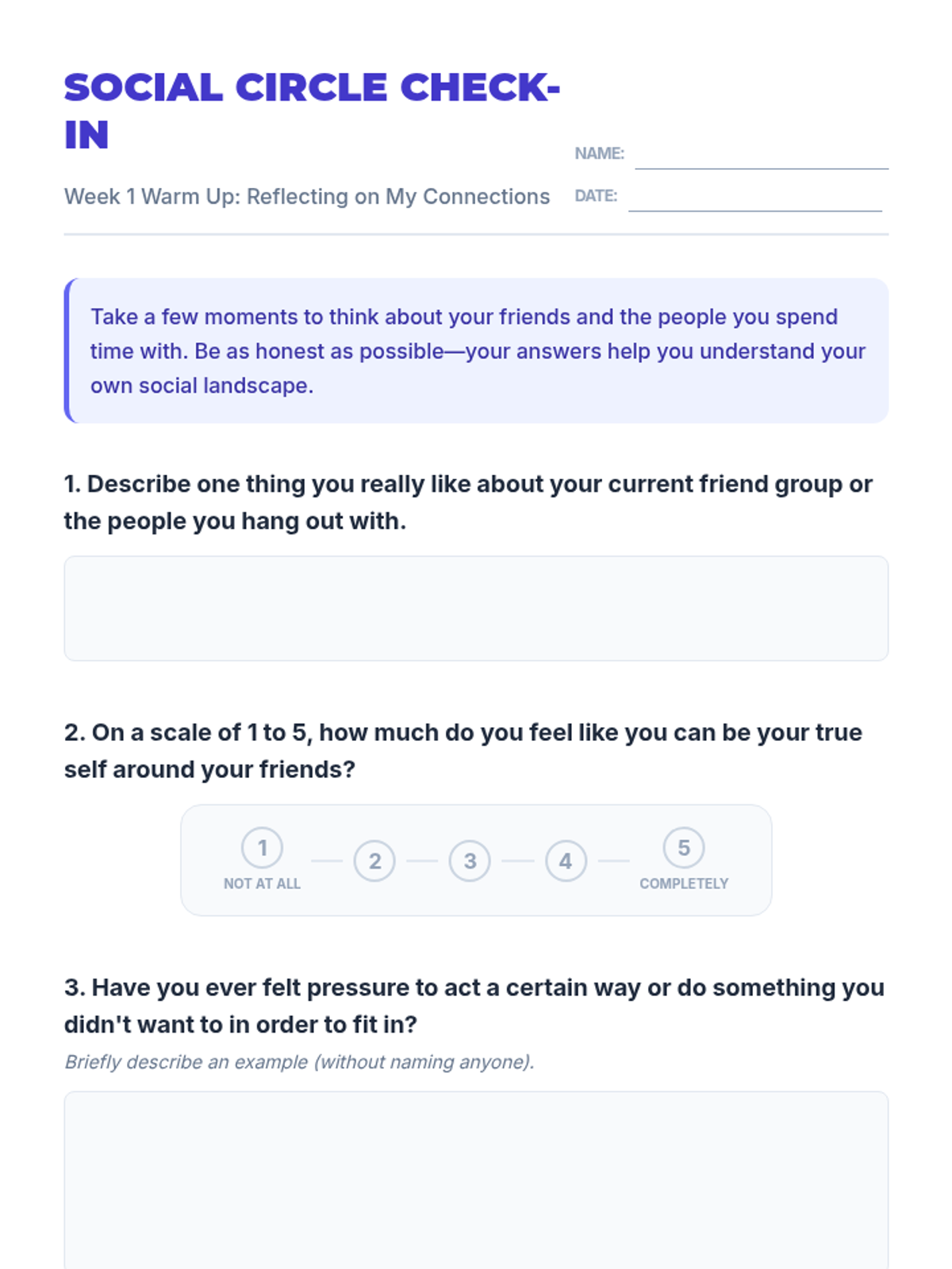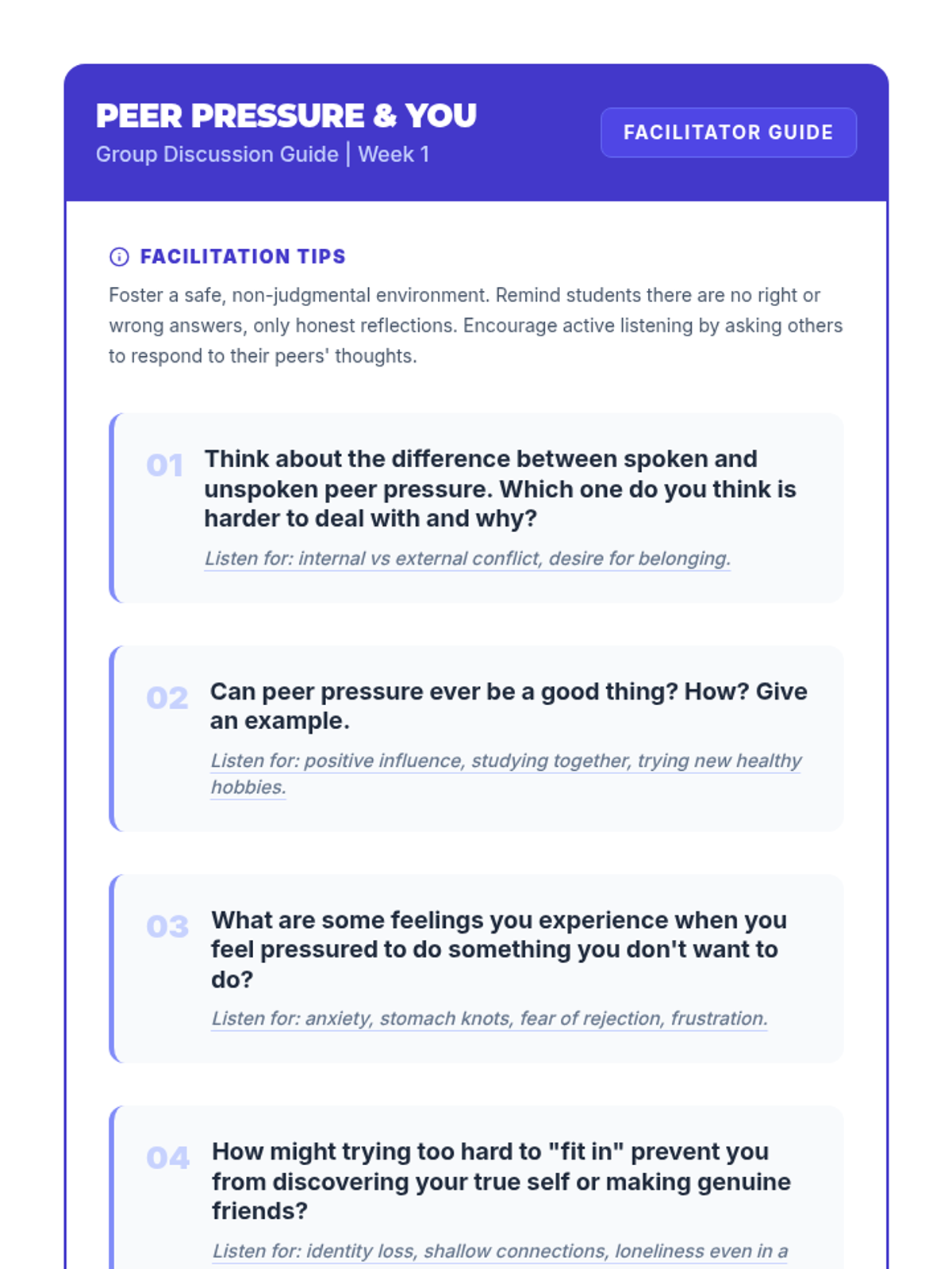 A 4-week Tier 2 intervention for 8th-grade students to navigate peer pressure, understand social dynamics, and build healthy relationships through interactive sessions and self-reflection.