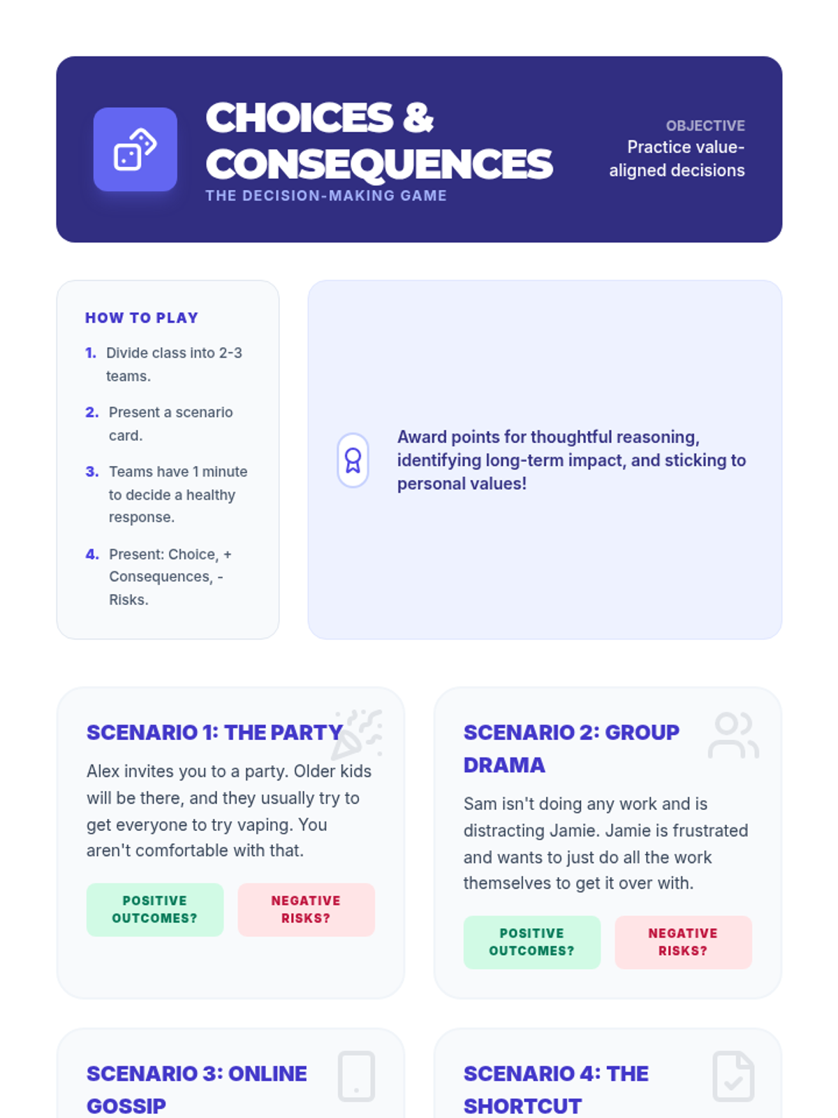 A comprehensive series of lessons focusing on social-emotional learning, health, and personal accountability, helping students navigate peer pressure and school expectations.