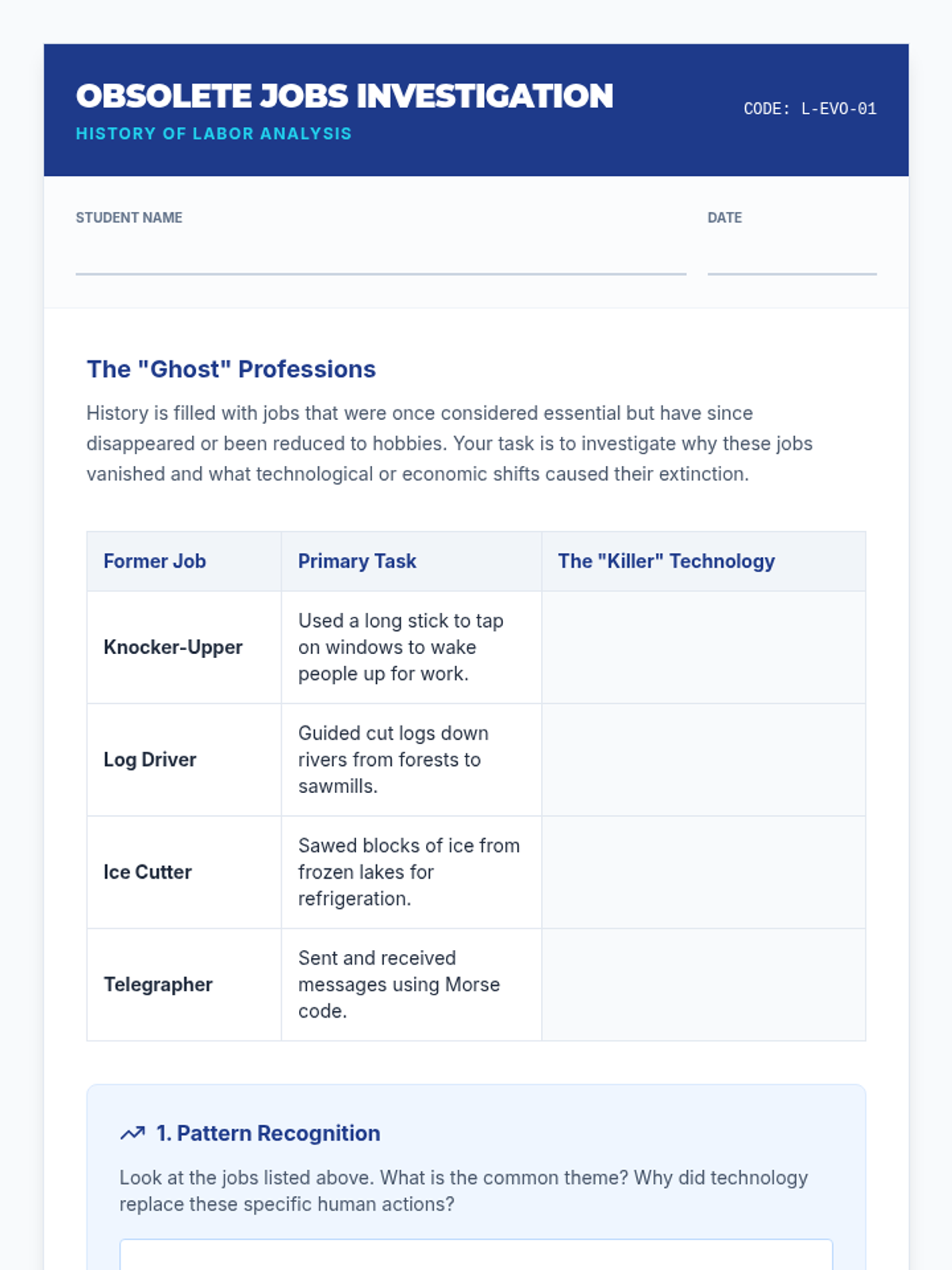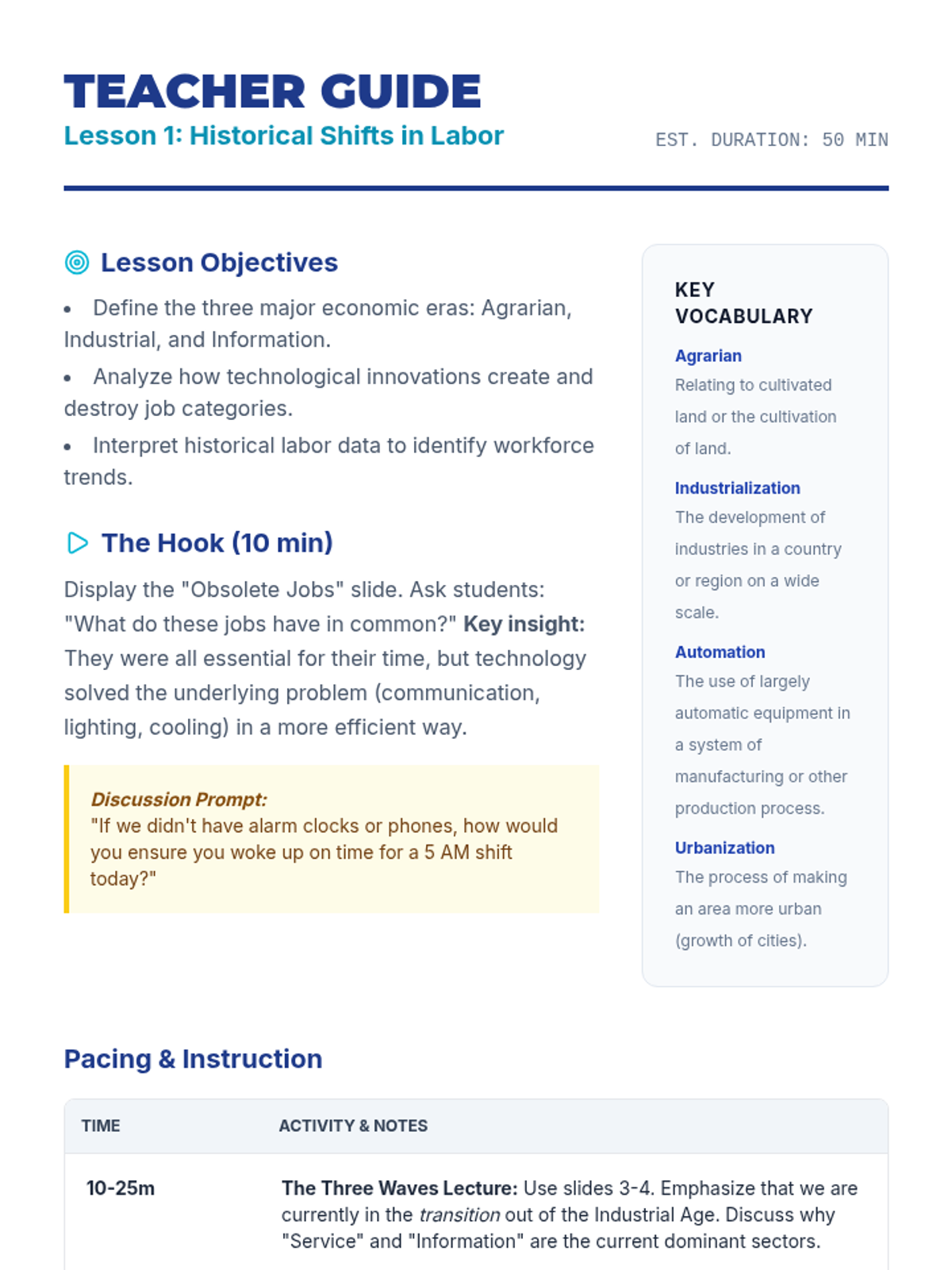 This sequence guides 8th-grade students through the evolution of the workplace, from historical industrial shifts to modern disruptors like AI, automation, and the gig economy. Students analyze data, participate in simulations, and forecast future skills needed for a globalized, digital workforce.