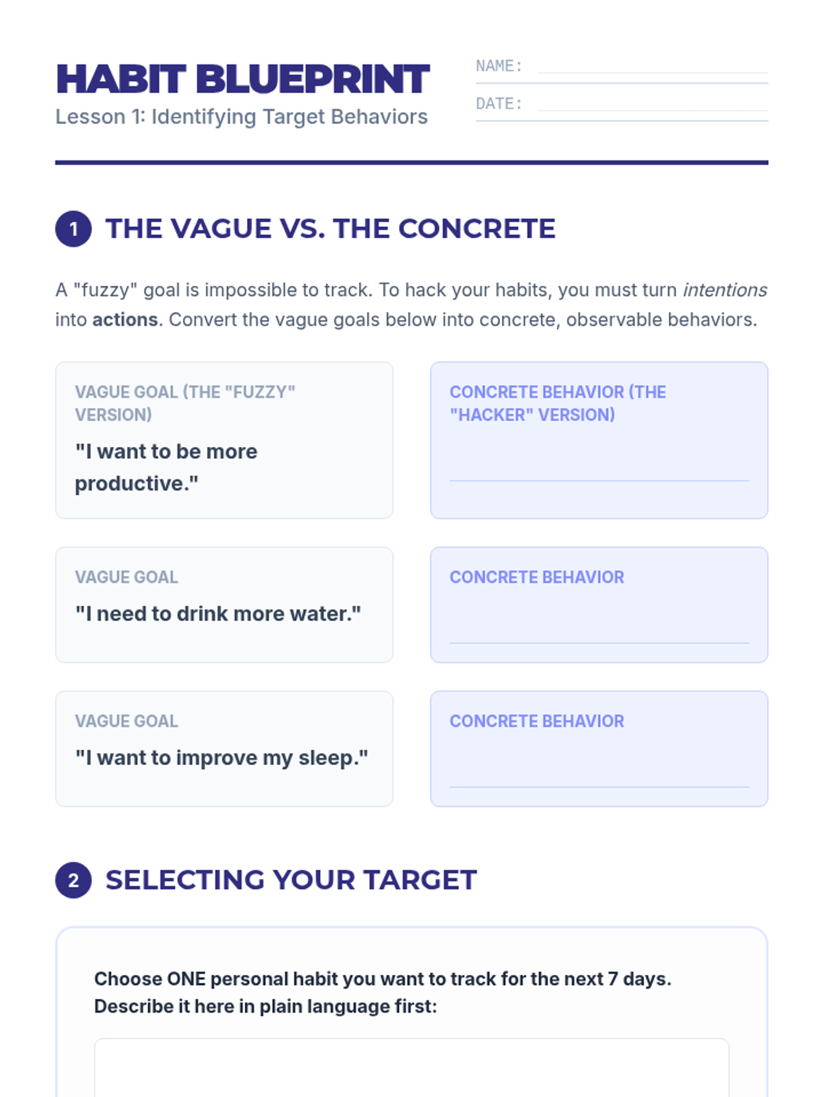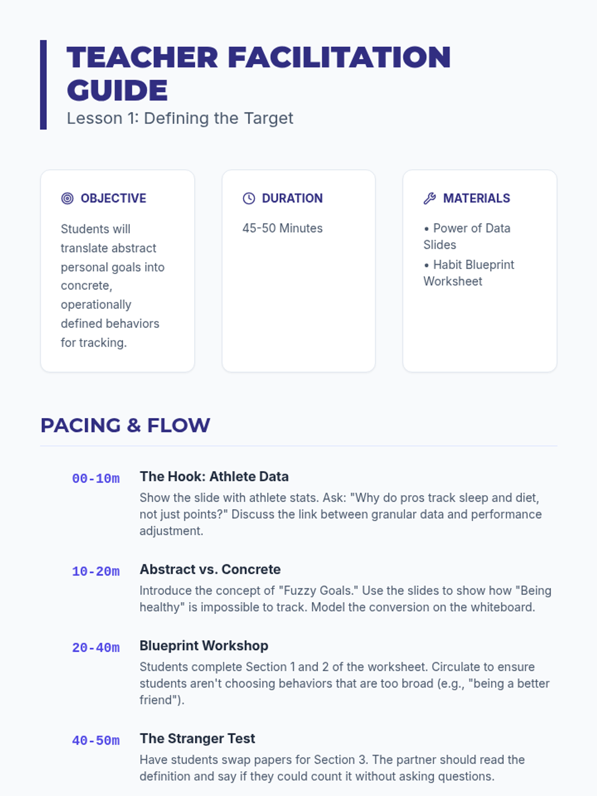 A sequence empowering students to apply the principles of behavior tracking to their own lives through the 'Quantified Self' movement. Students identify personal habits, explore data logging methods, create visual trackers, and analyze performance to understand how accountability impacts self-discipline.