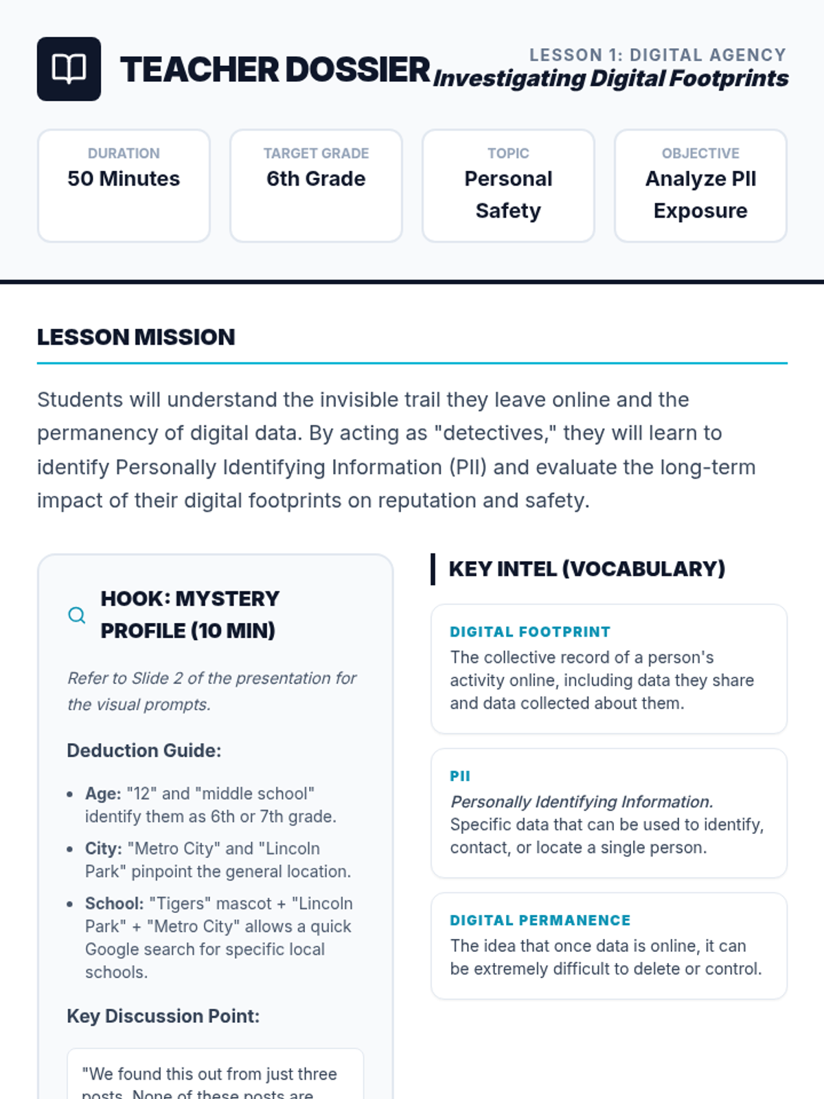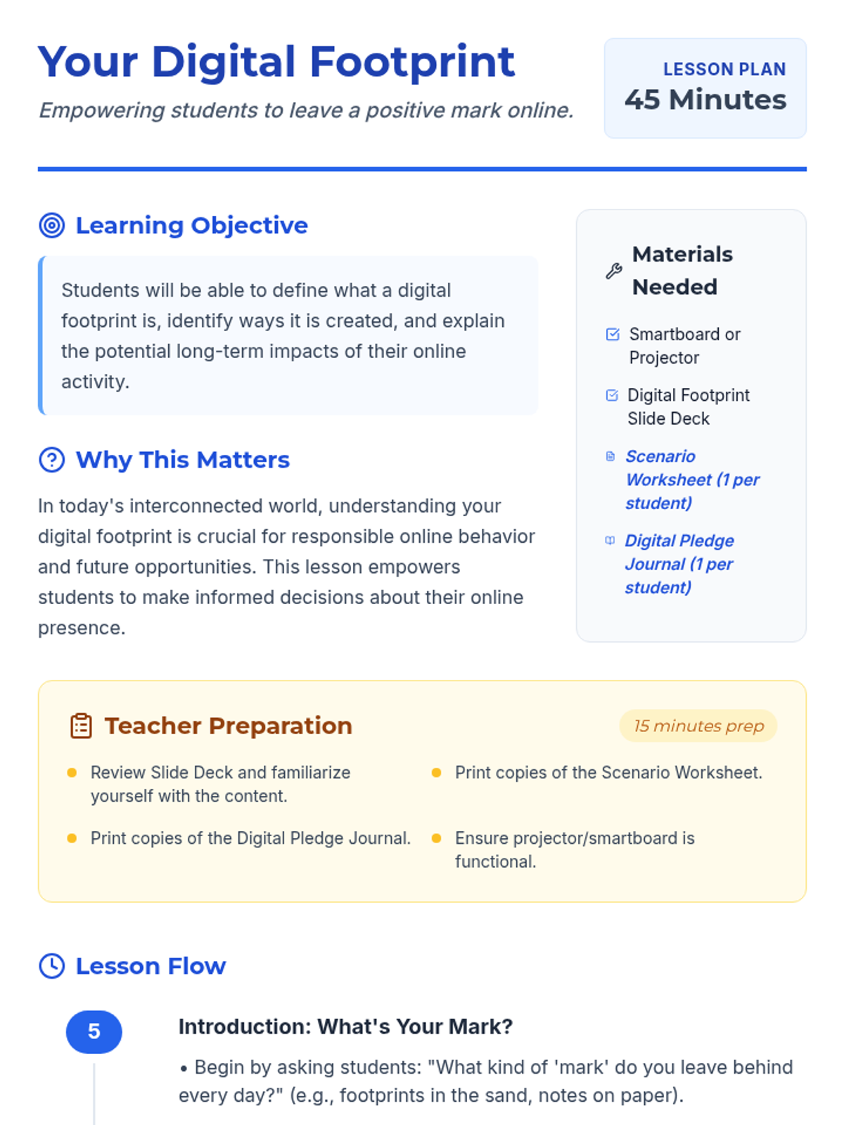 A comprehensive unit for 6th-grade students exploring the ethical, privacy, and career implications of emerging technologies like AI, deepfakes, and automation. Students move from understanding personal data footprints to creating a personal 'Future Readiness Charter' for safe and productive digital living.