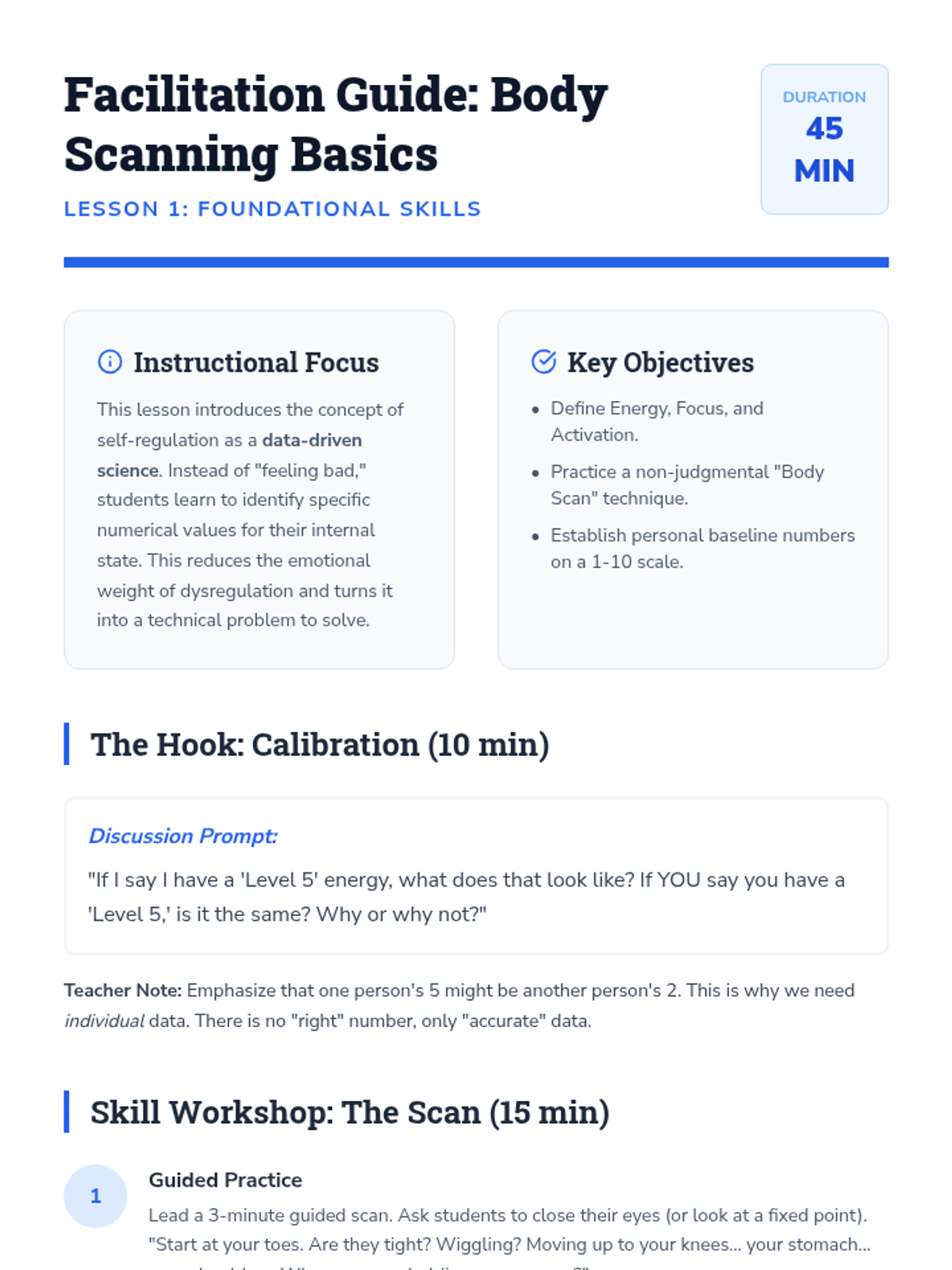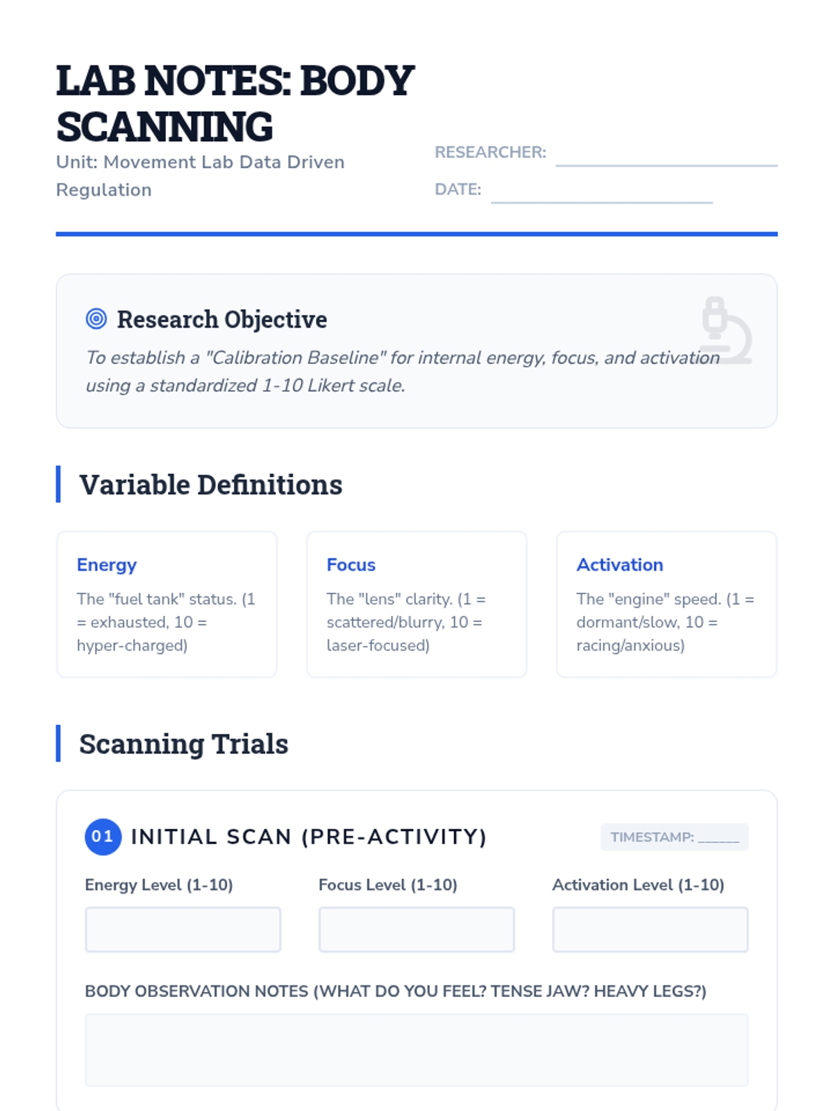 A metacognitive science-themed unit where 8th-grade students treat their sensory regulation as a scientific study. They collect and analyze data on movement breaks to build a personalized, evidence-based regulation menu for academic success.