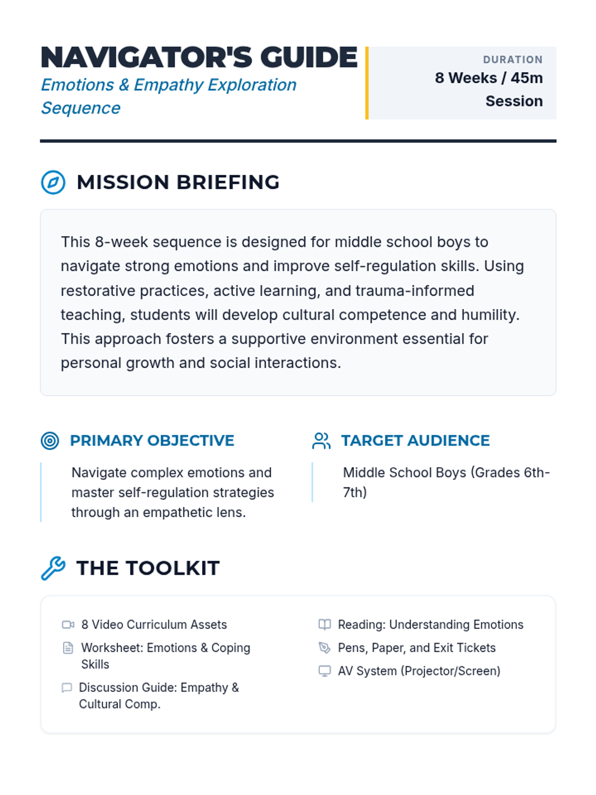An 8-week series designed for middle school boys to navigate strong emotions, improve self-regulation, and develop empathy through cultural competence and restorative practices.
