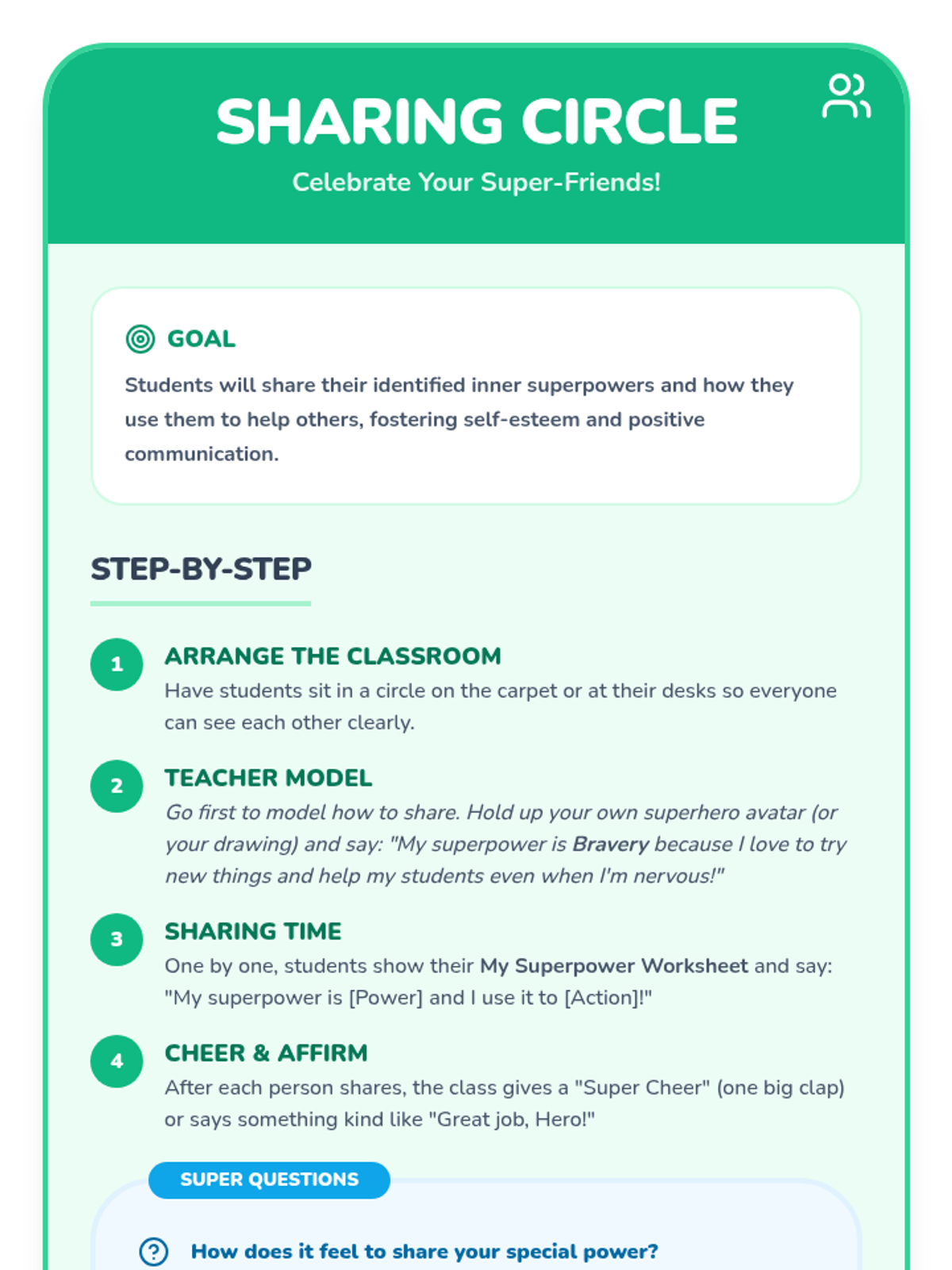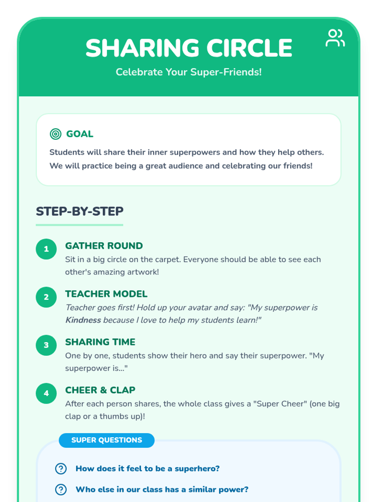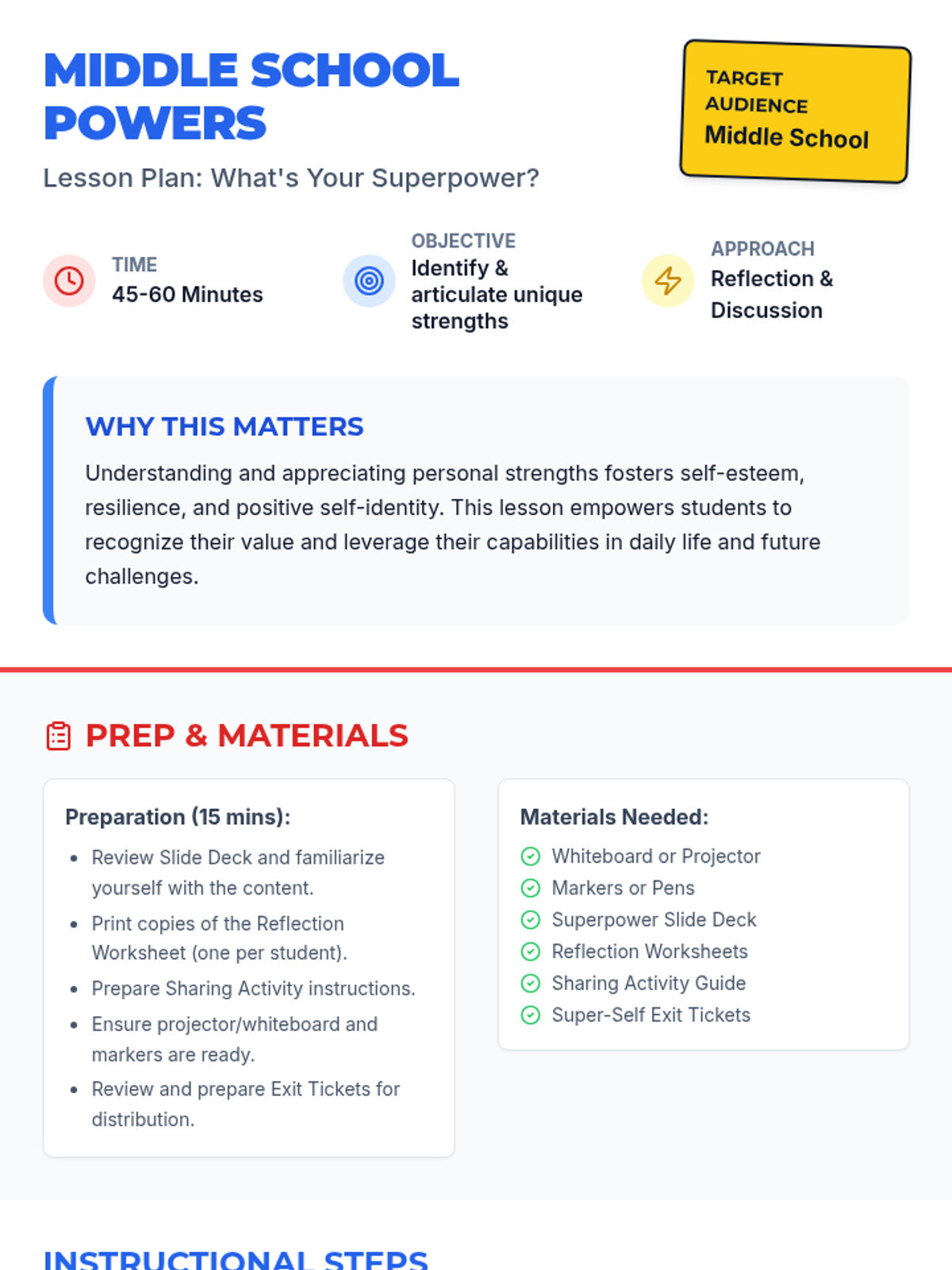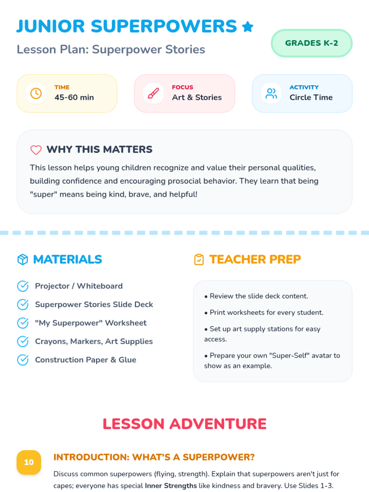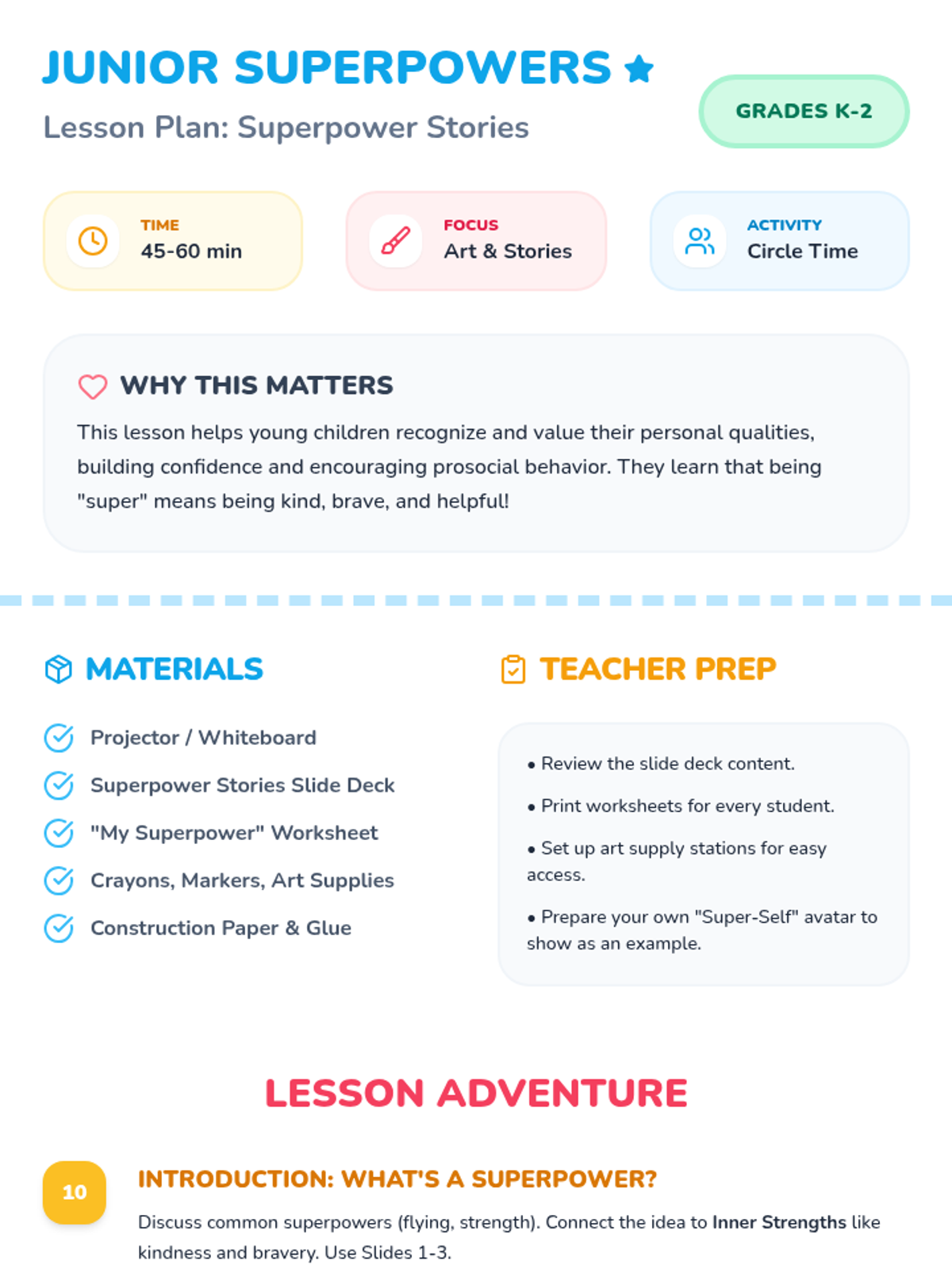 A sequence of lessons designed for different grade levels (K-2 and Middle School) to help students discover their inner strengths and "superpowers."