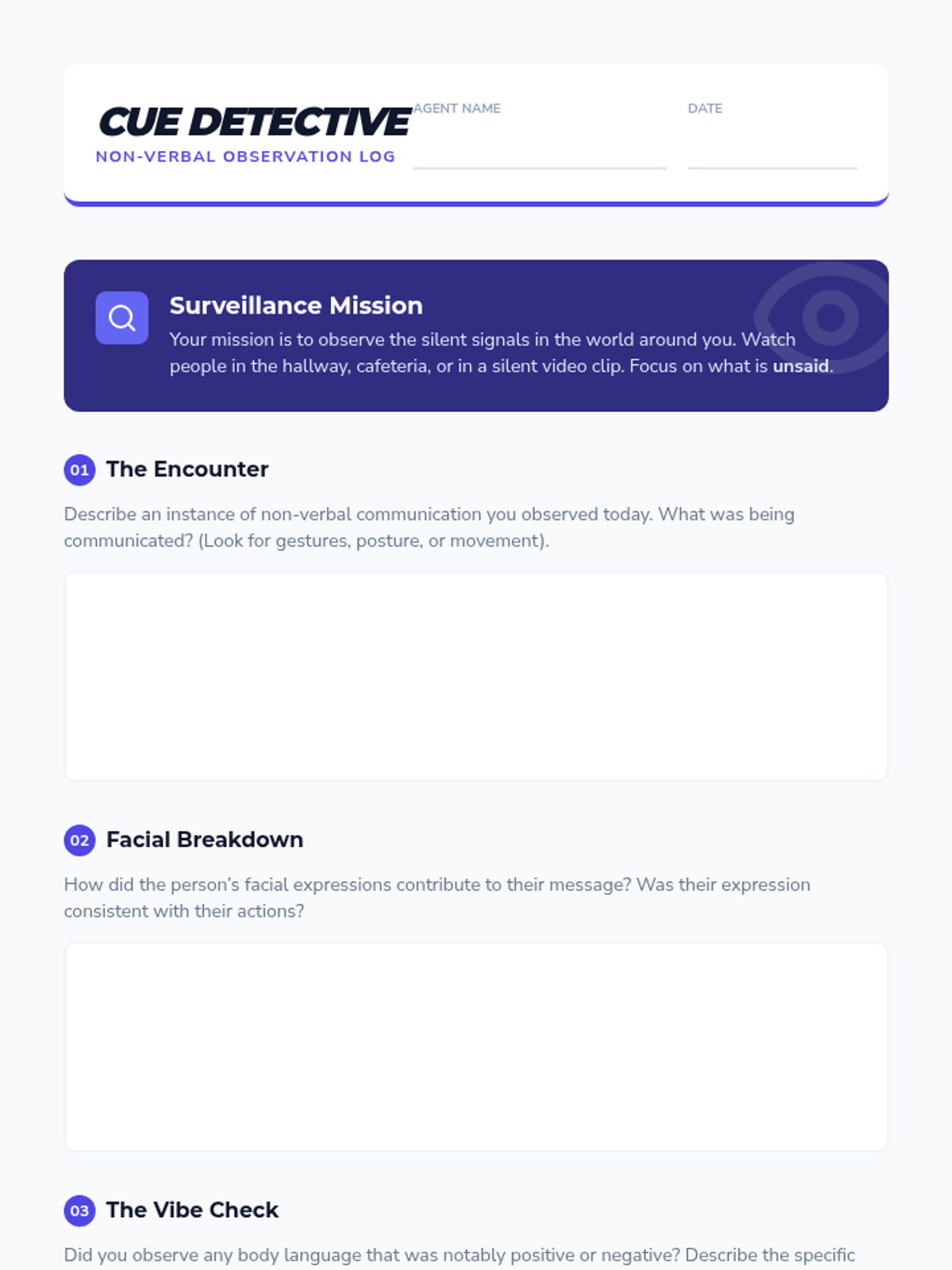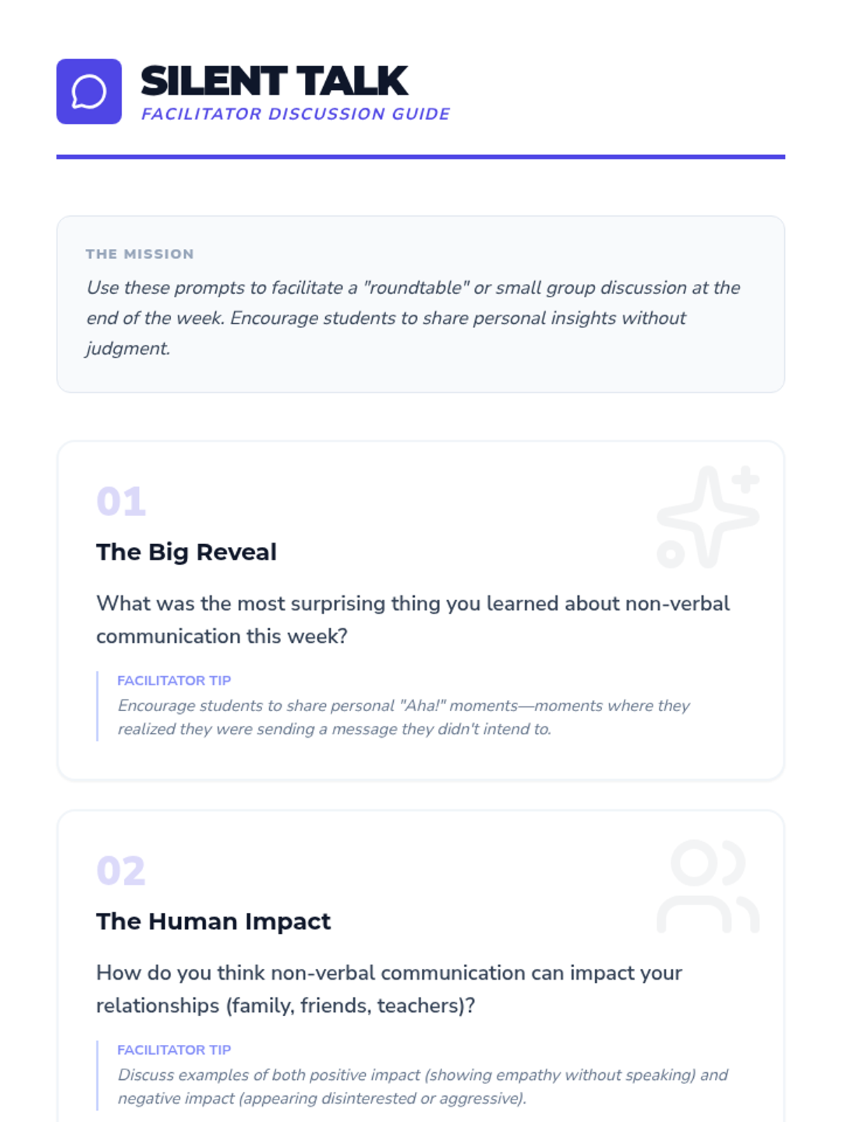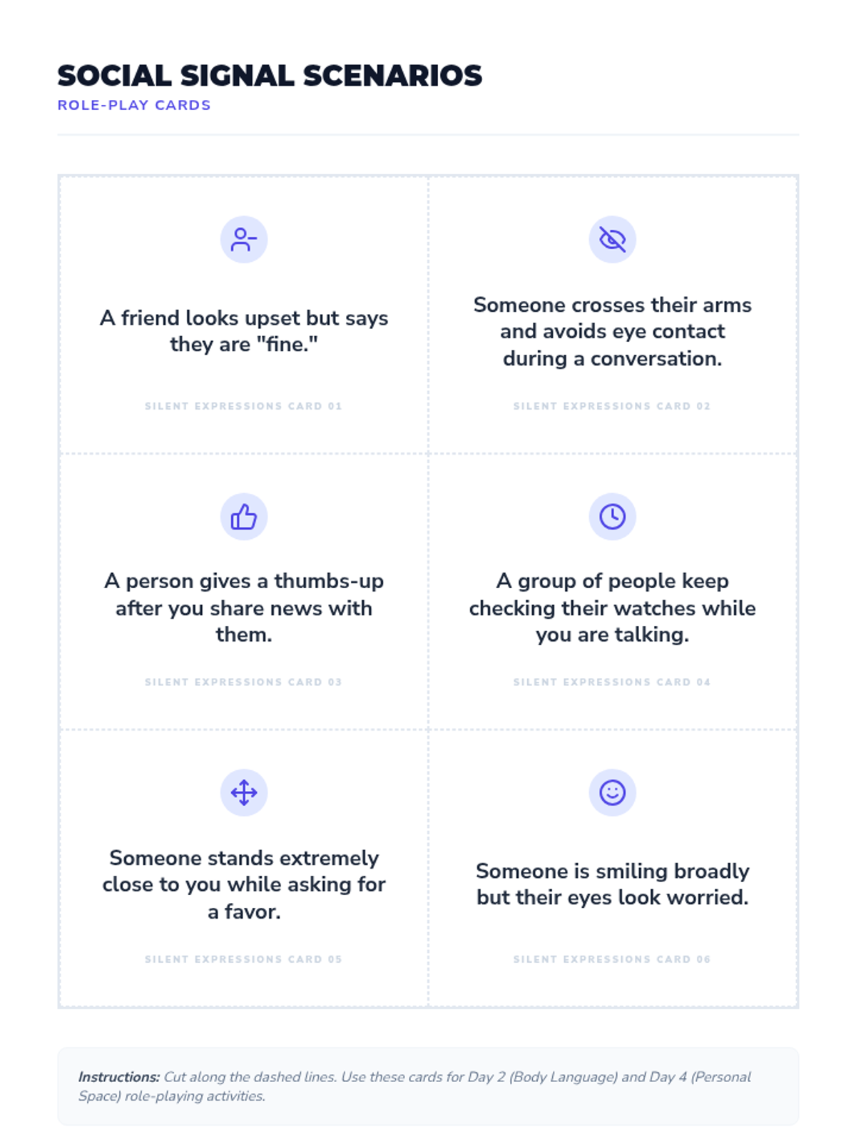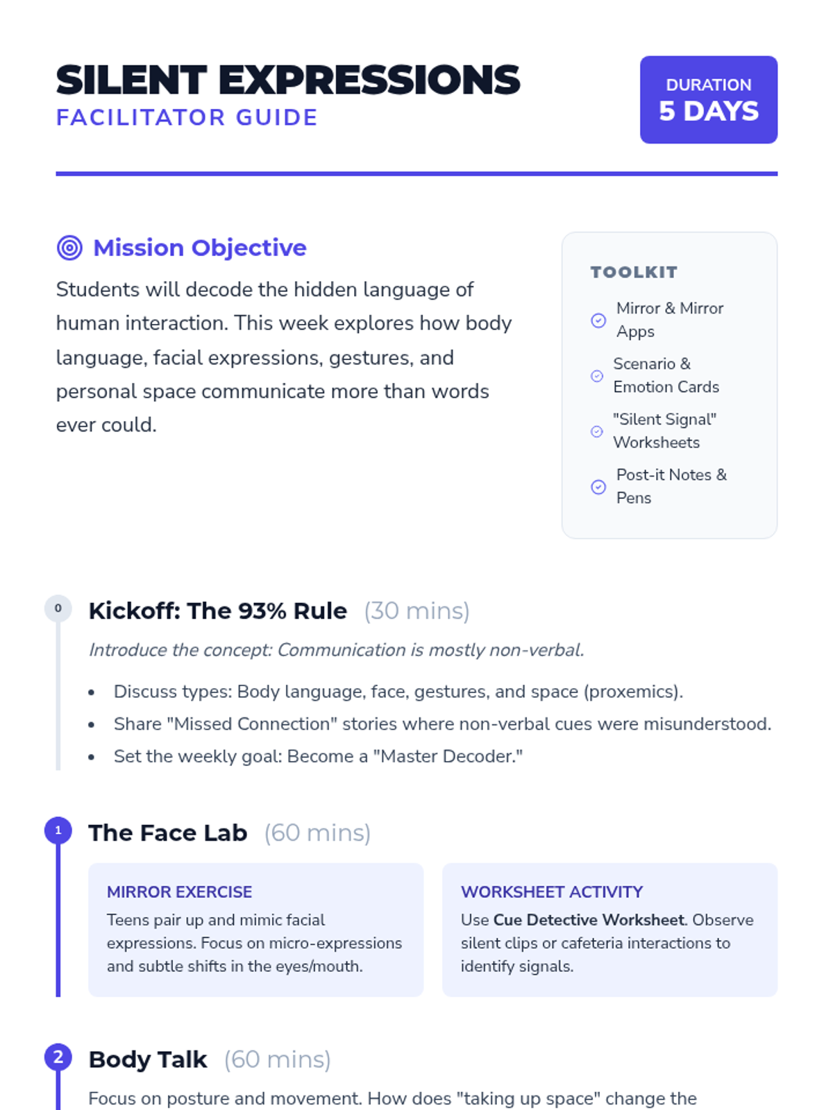 A week-long exploration of non-verbal communication, including body language, facial expressions, and personal space, designed for teens to enhance their social awareness.