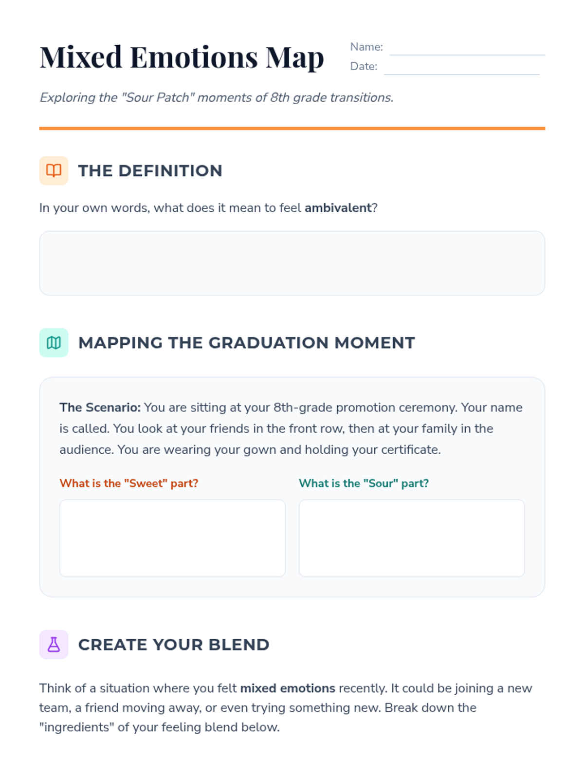 This sequence addresses the complexity of feeling multiple, often contradictory, emotions simultaneously. Students move from identifying mixed emotions to practicing dialectical thinking and developing strategies for sitting with emotional tension, specifically focusing on the 8th-grade transition experience.