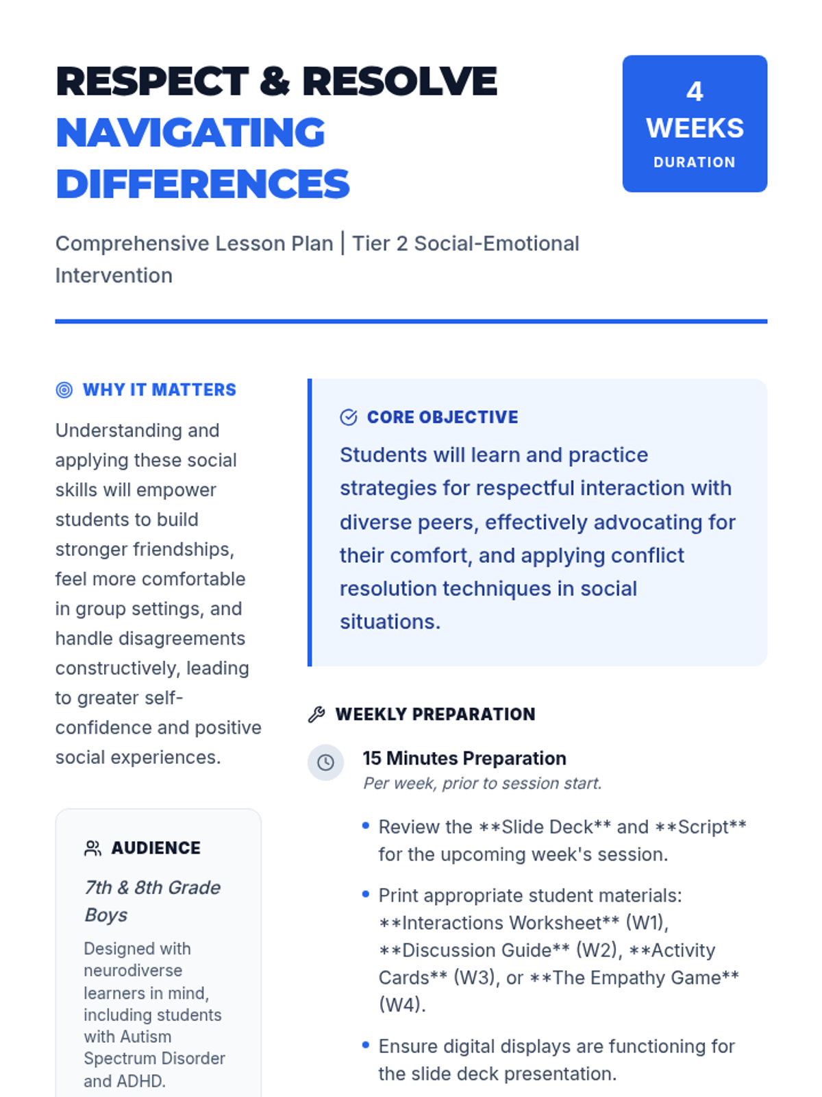 A 4-week Tier 2 intervention sequence for middle school boys to develop social-emotional skills in respectful interaction, self-advocacy, and conflict resolution.