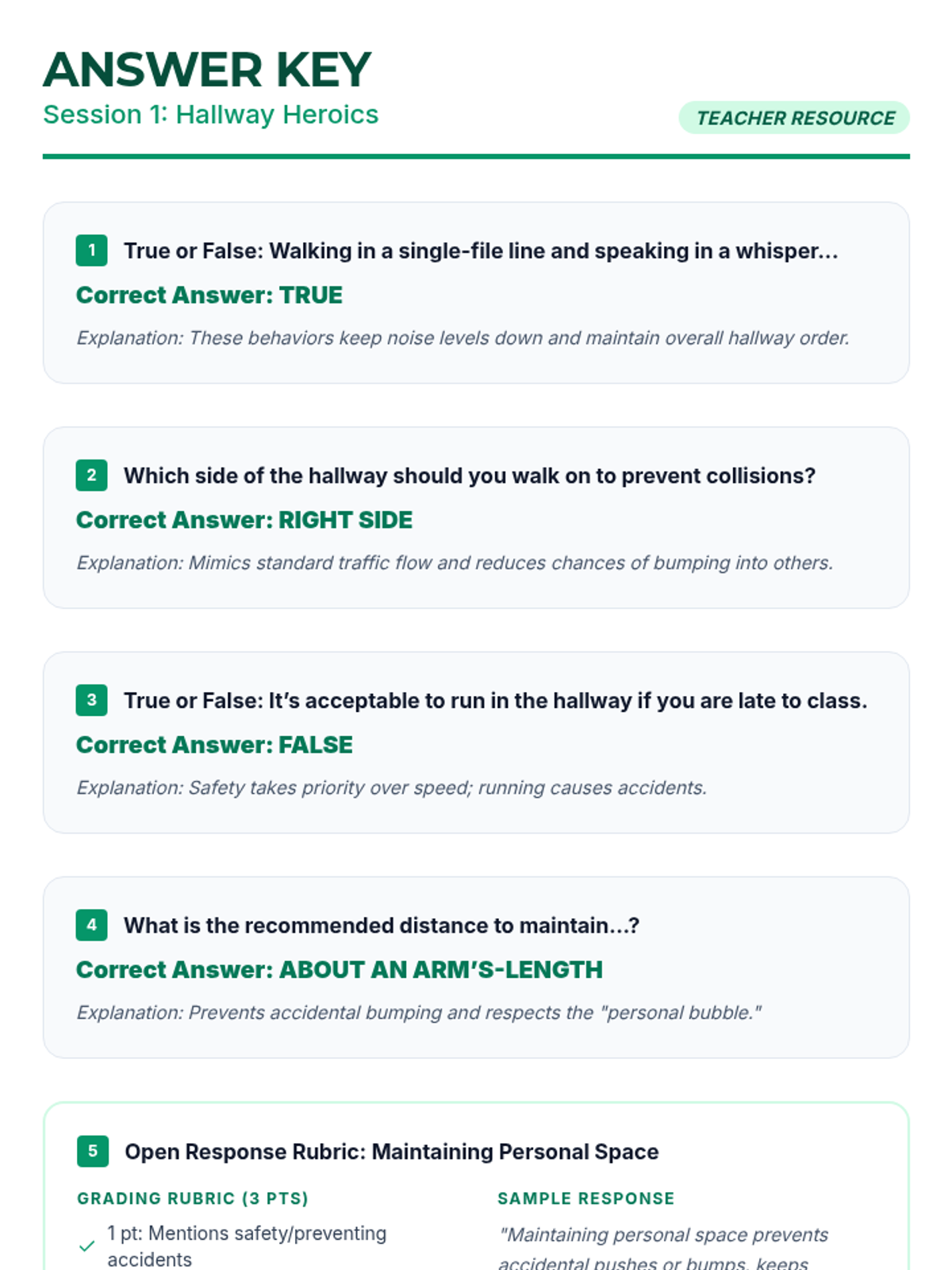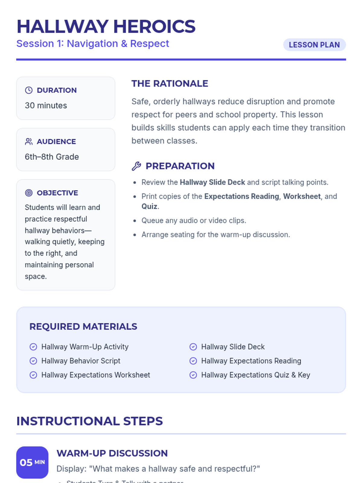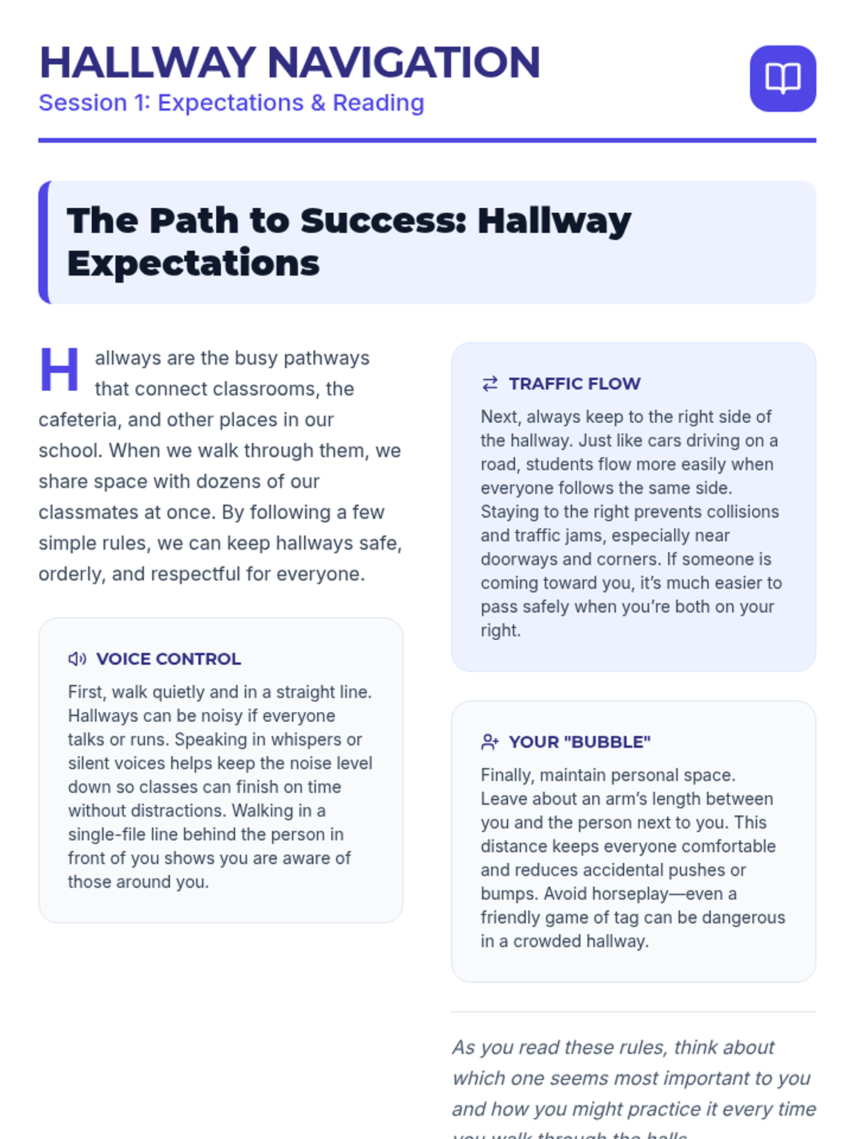 A three-session social-emotional learning series for middle schoolers focusing on school-wide behavior expectations in the hallway, cafeteria, and playground. Students learn to navigate common spaces with respect, safety, and responsibility through interactive discussions, reading, and practice.