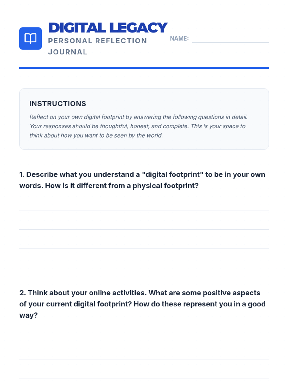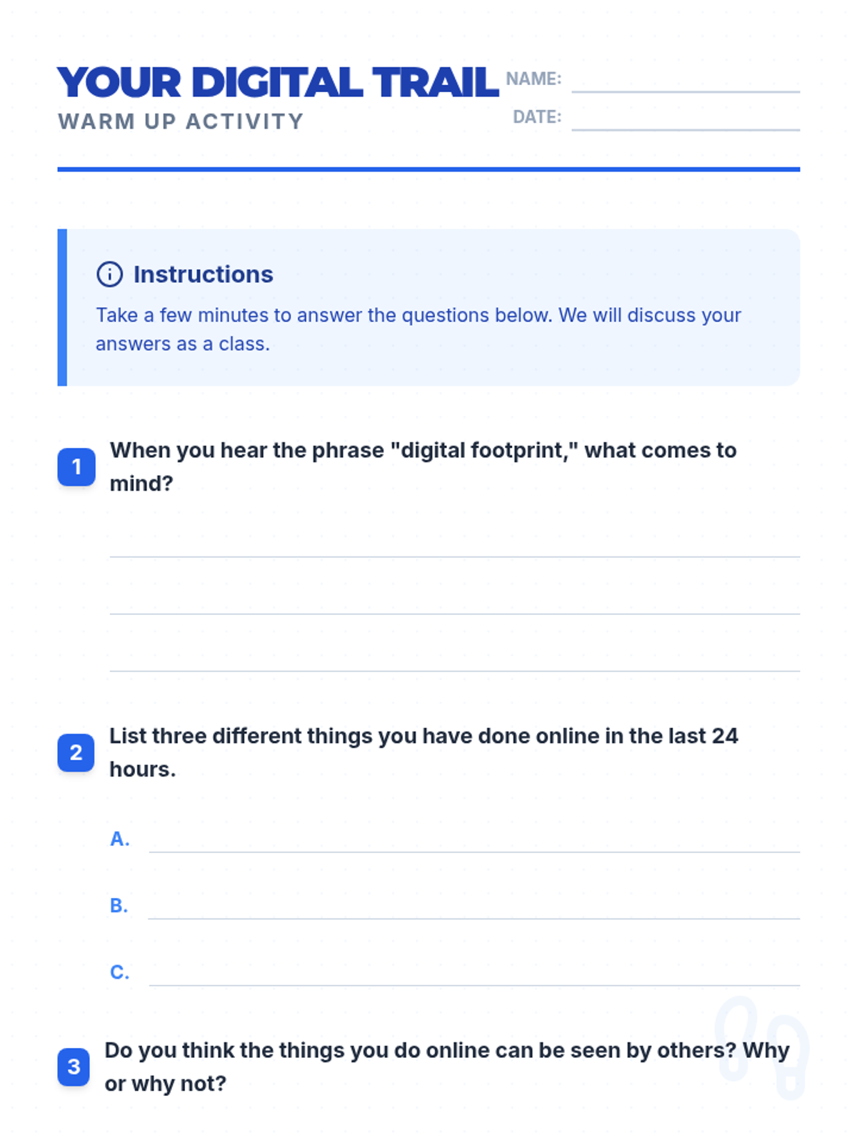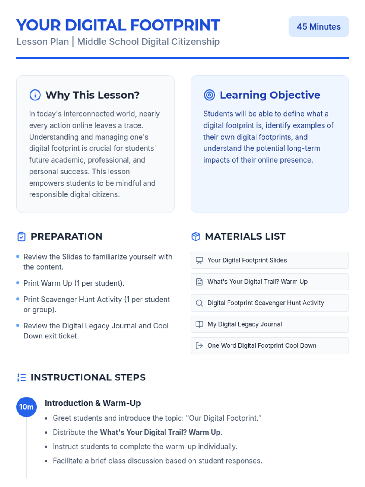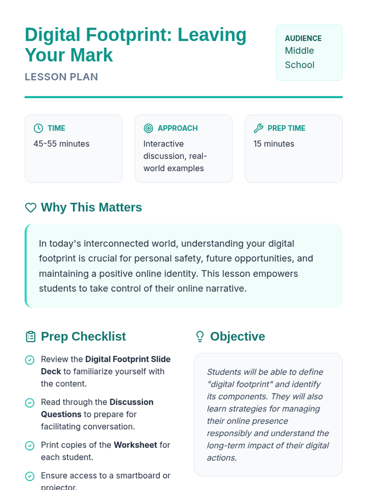 A two-part series designed for middle school students to develop a positive online presence and recognize their internal value. Students explore the concept of a digital footprint and then transition into identifying their unique personal strengths.