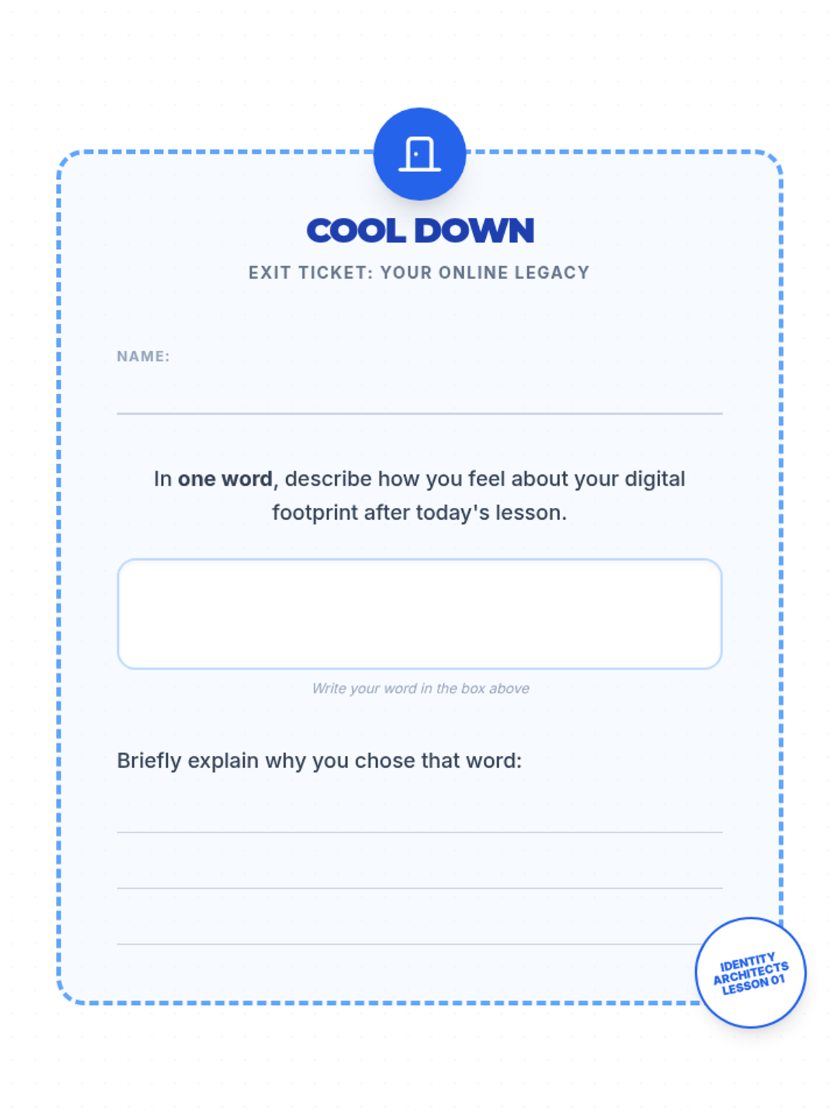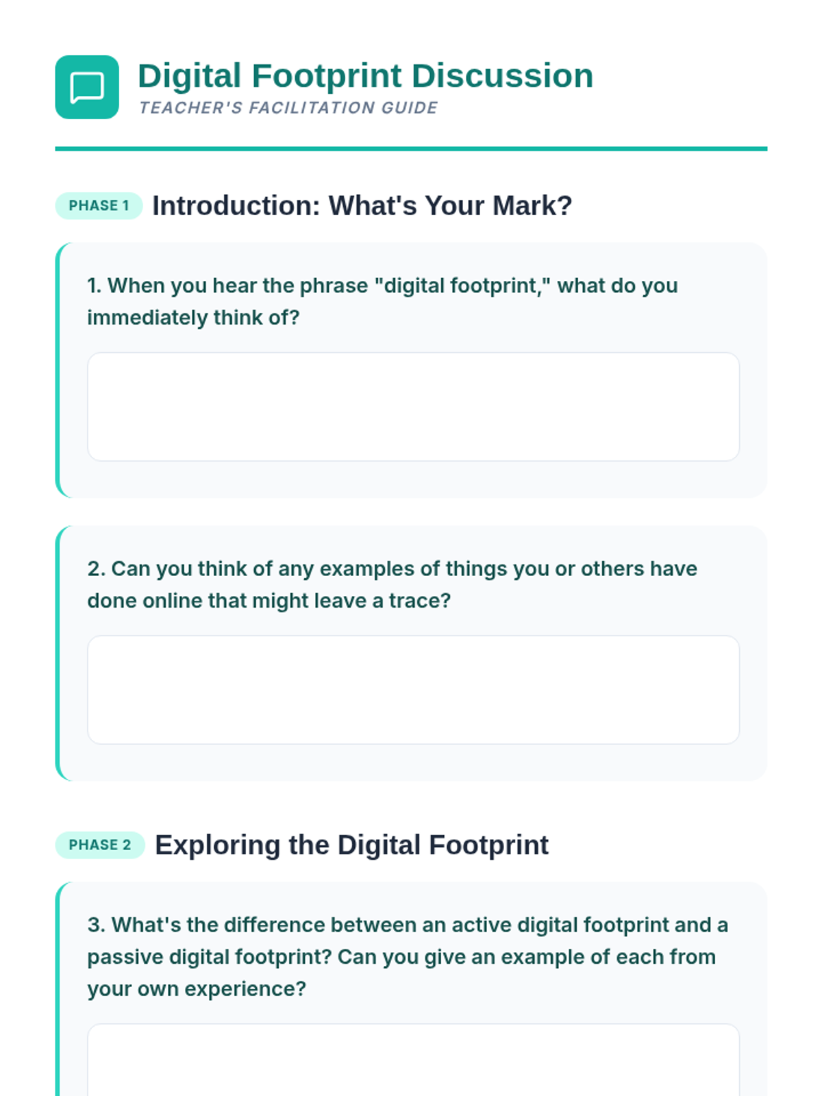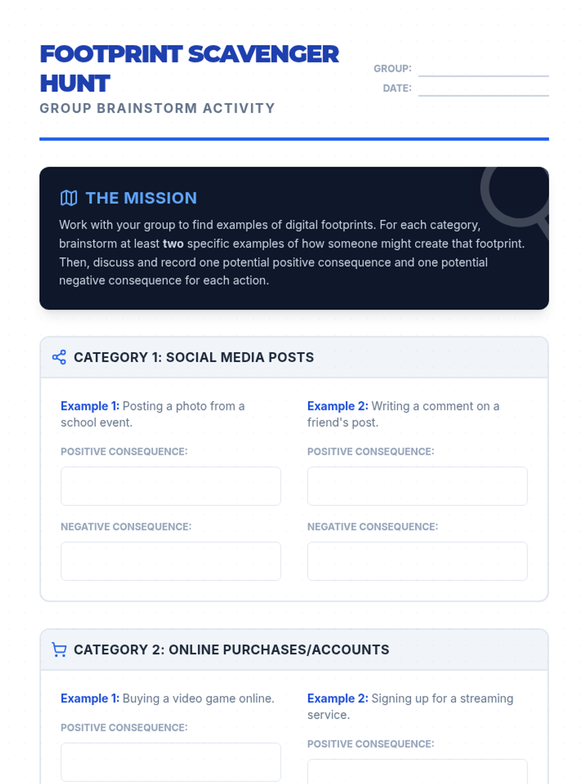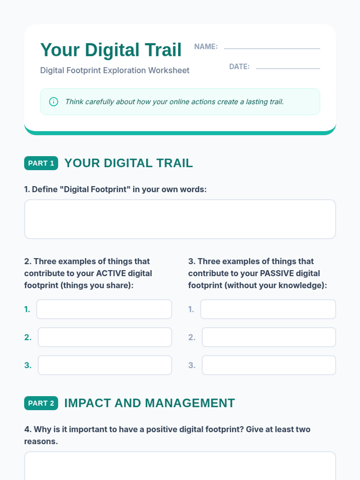 A two-part series designed for middle school students to develop a positive online presence and recognize their internal value. Students explore the concept of a digital footprint and then transition into identifying their unique personal strengths.
