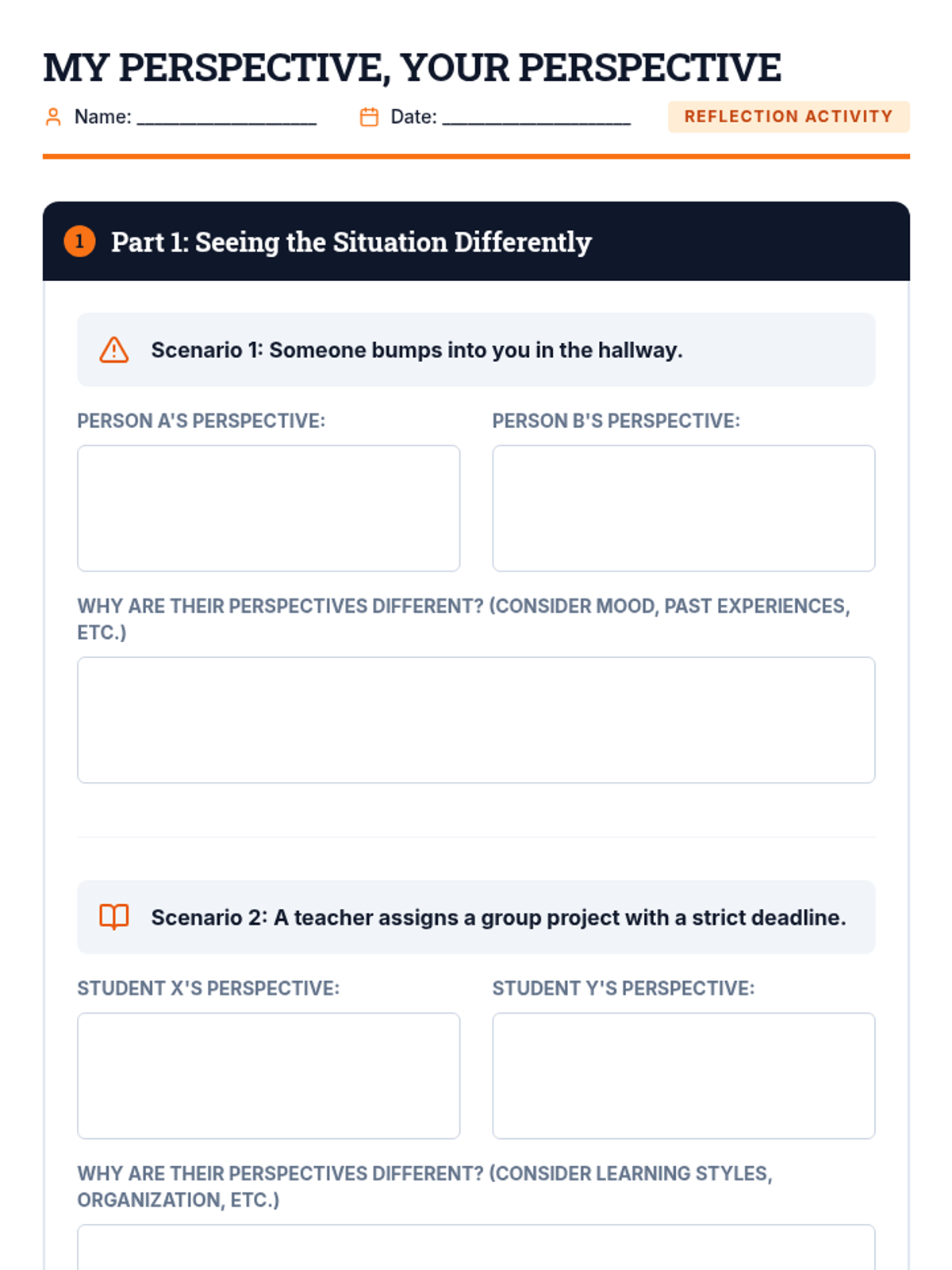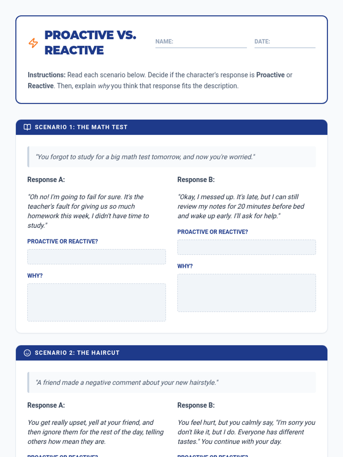 This sequence focuses on emotional intelligence and self-compassion through a case study approach. Students analyze hypothetical scenarios involving disappointment, anger, or anxiety, and apply mindfulness techniques to navigate them, shifting from reacting impulsively to responding thoughtfully.