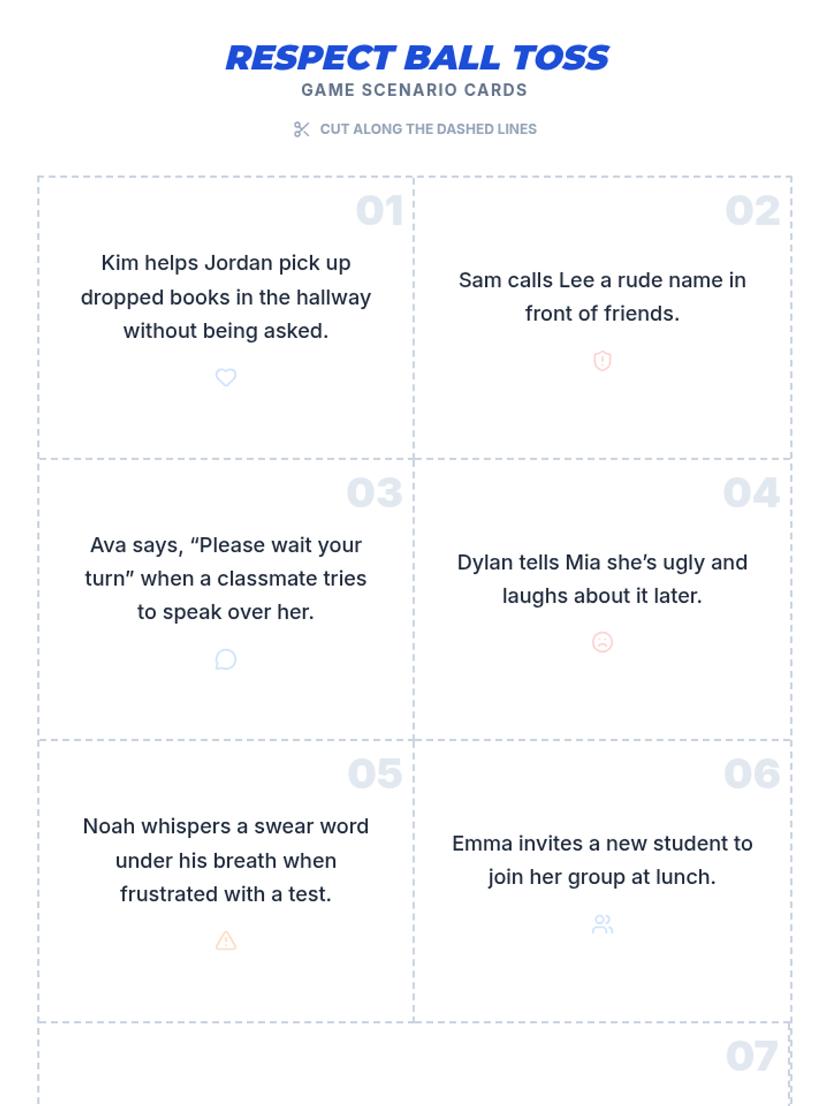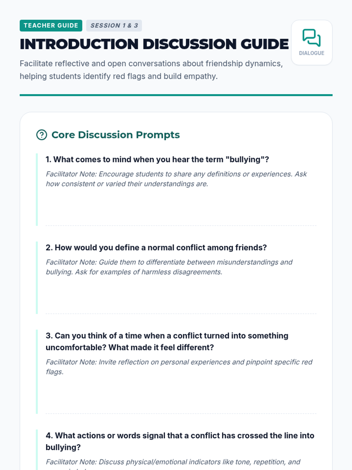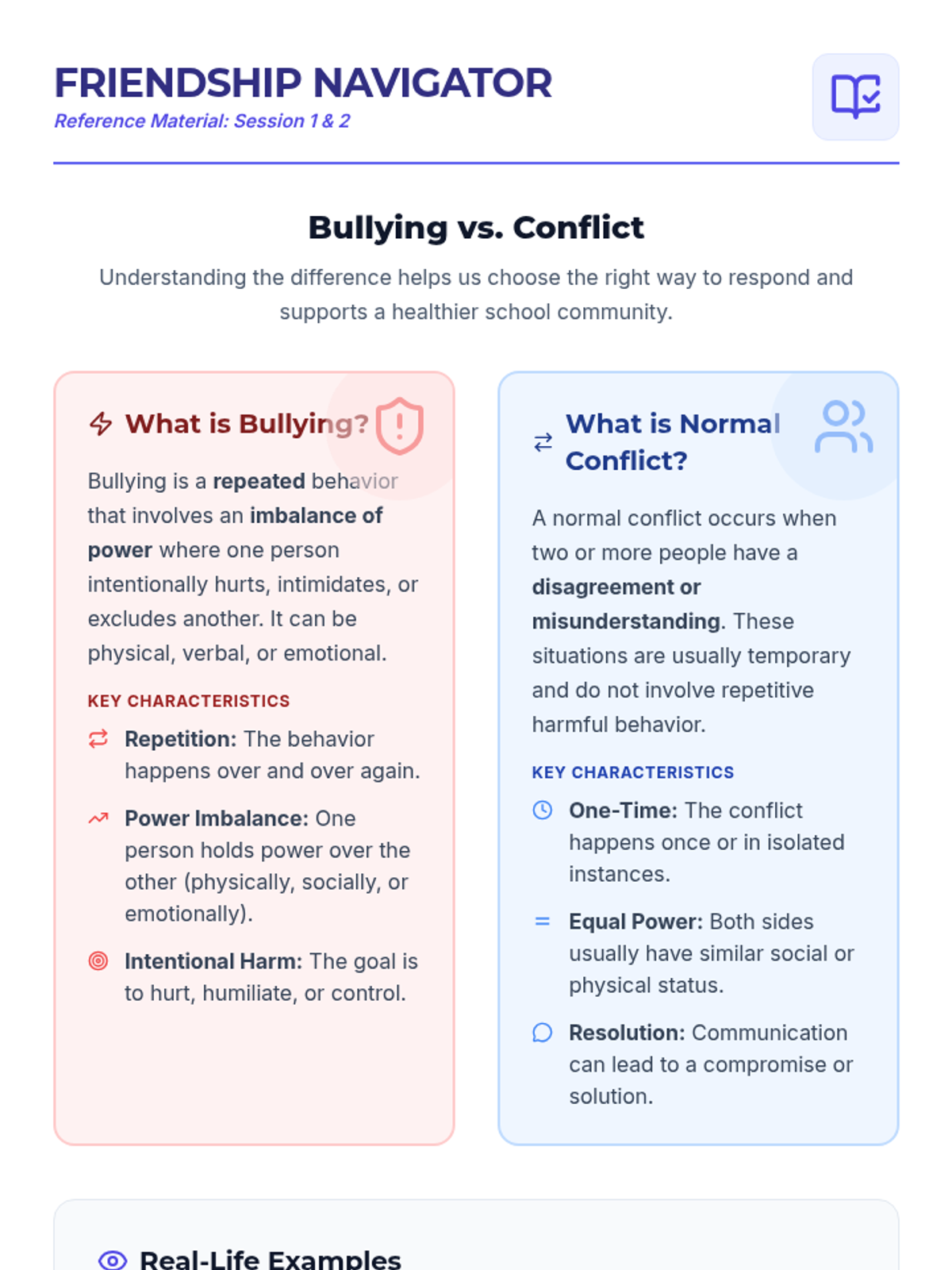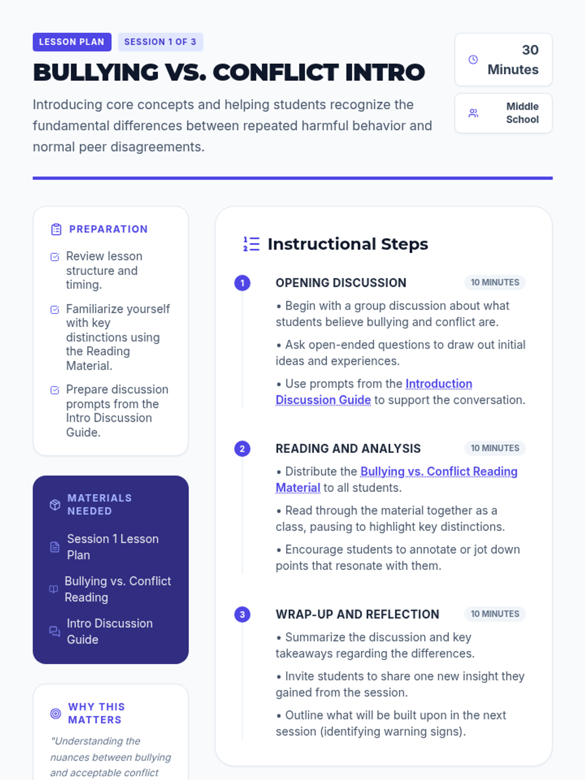 This 3-session sequence helps middle school students differentiate between bullying and normal conflict. It provides students with definitions, real-life scenarios, role-play activities, and reflection tools to foster a safer school environment.