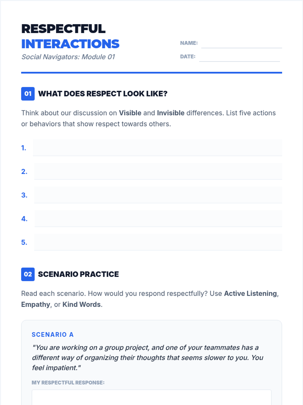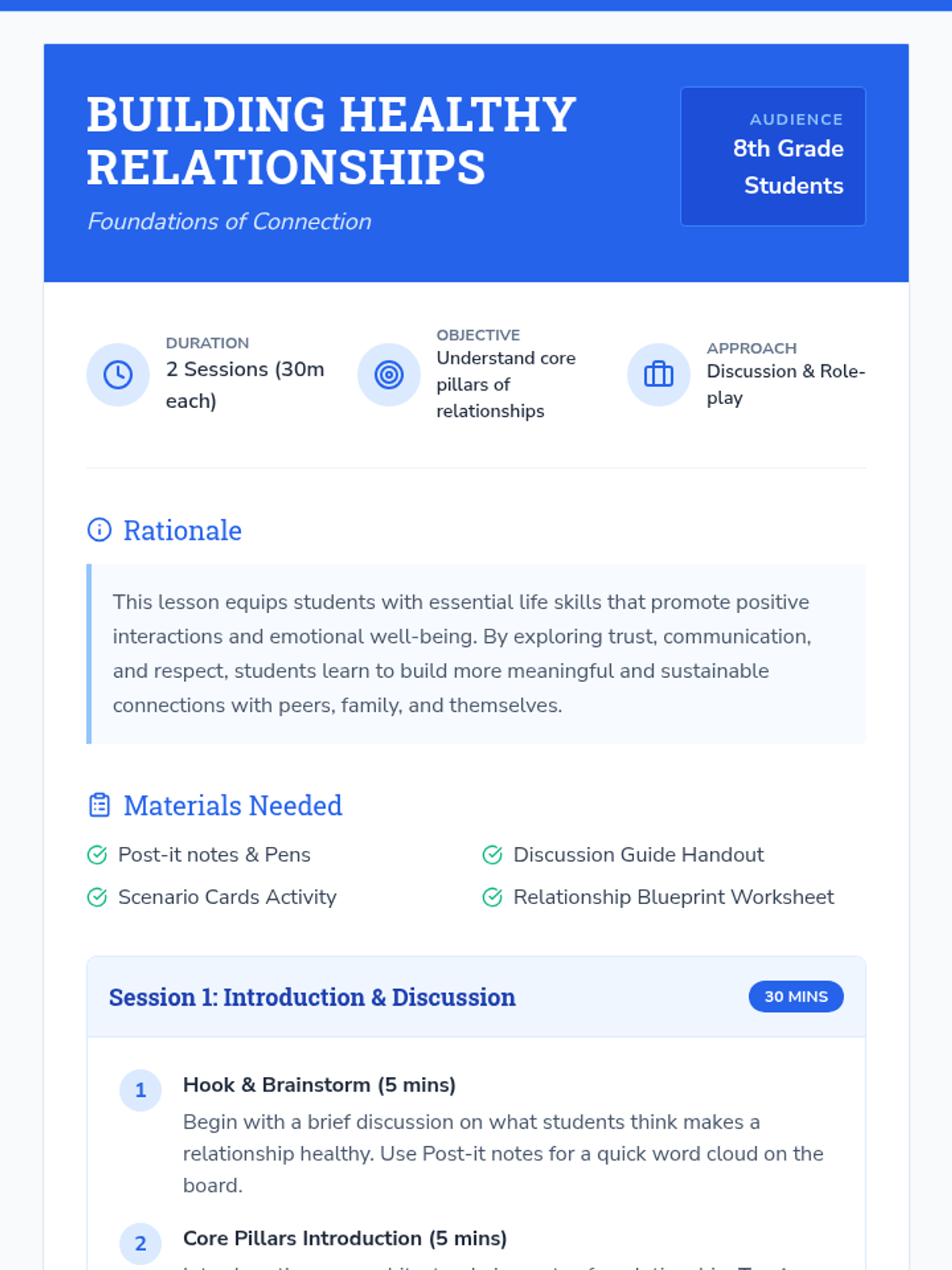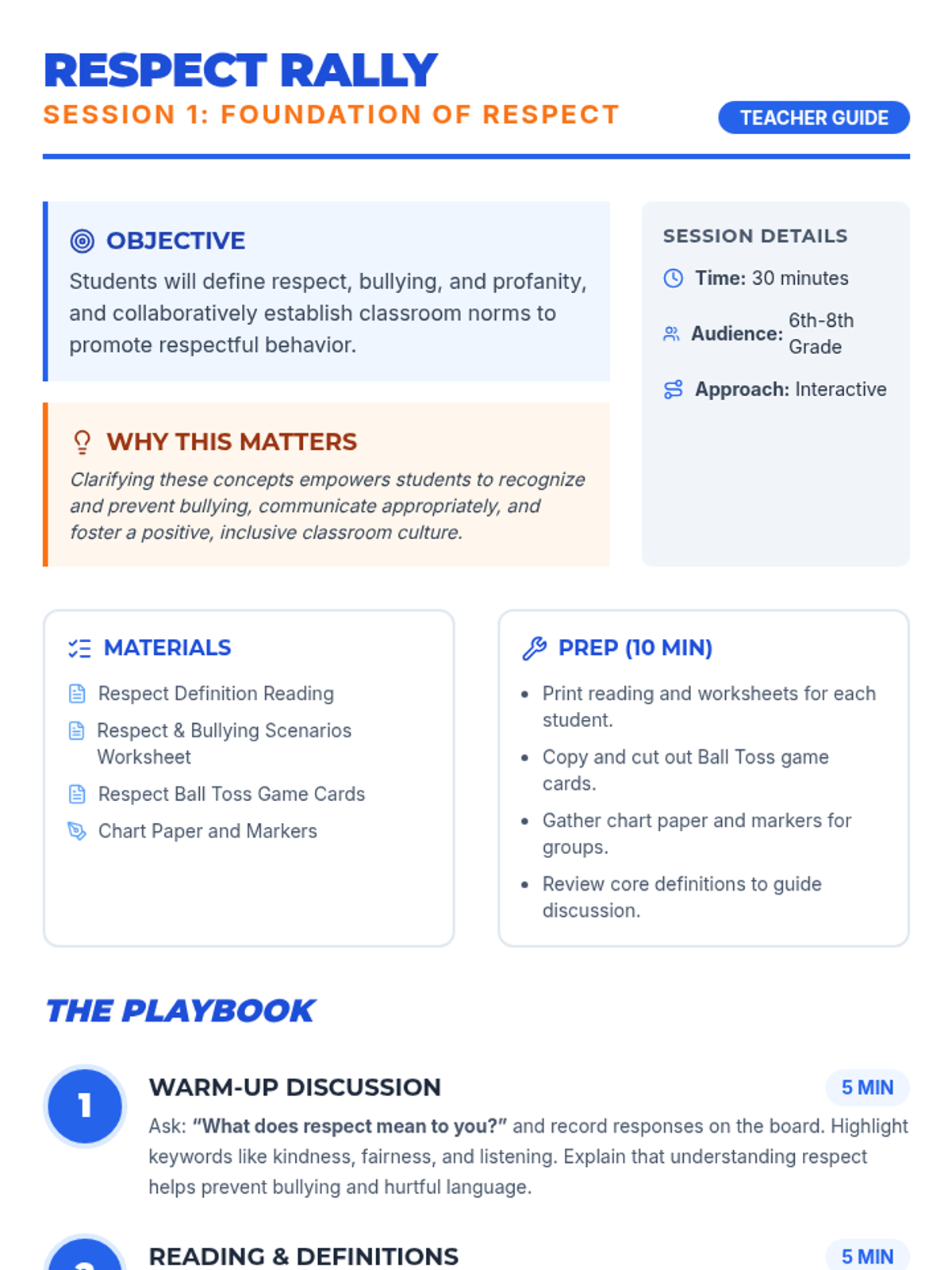 A two-session sequence for middle schoolers focused on defining respect, preventing bullying, and mastering conflict resolution through interactive games and role-play.