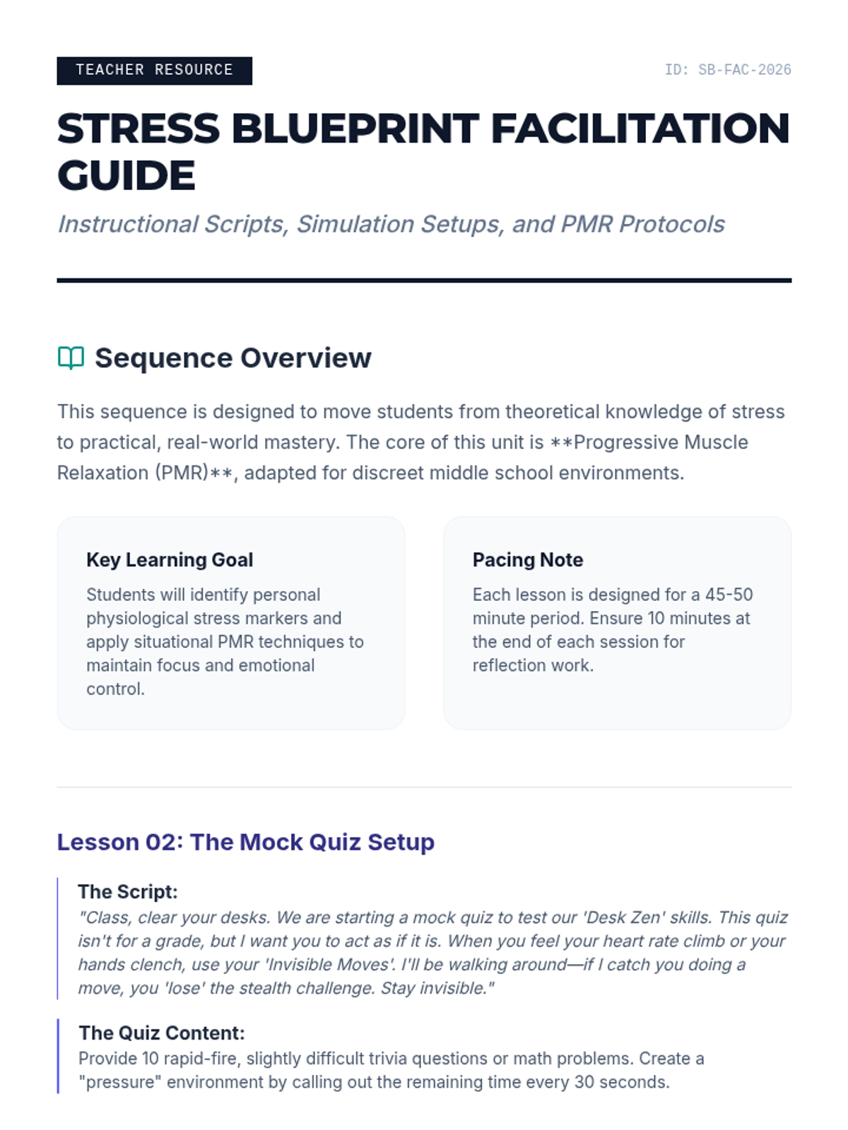 This 7th-grade sequence teaches Progressive Muscle Relaxation (PMR) through real-world applications. Students move from identifying physiological stress triggers to mastering discreet relaxation techniques for tests, social conflicts, and sports performance, culminating in a personalized mental health 'User Manual'.