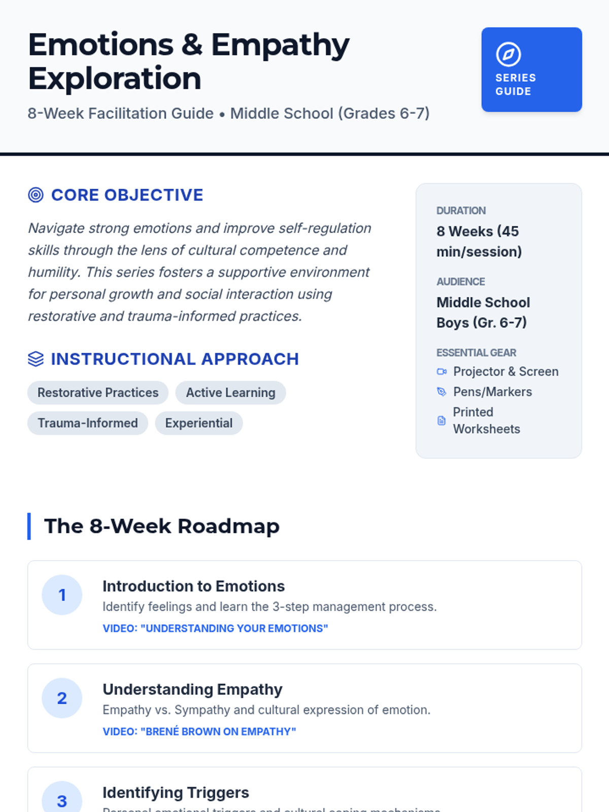 An 8-week social-emotional learning series for middle school boys focusing on emotional regulation, empathy, and cultural competence through restorative practices and active learning.