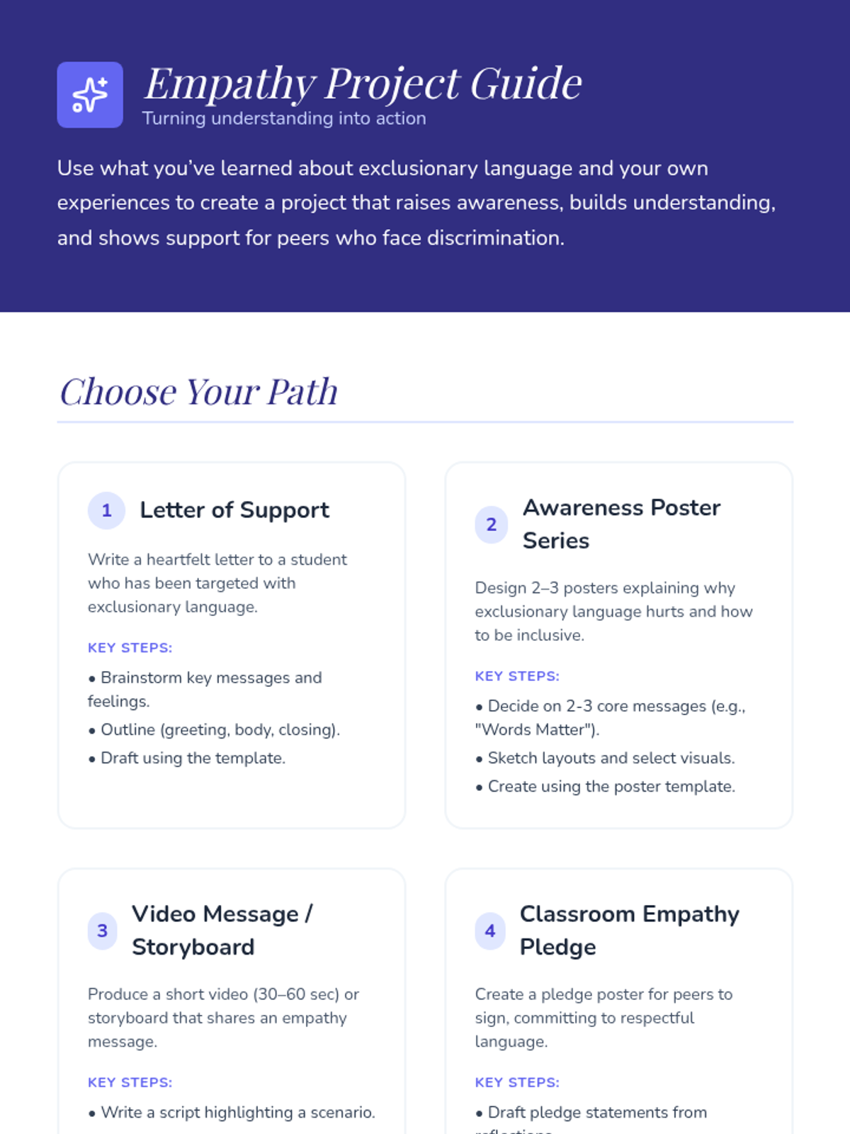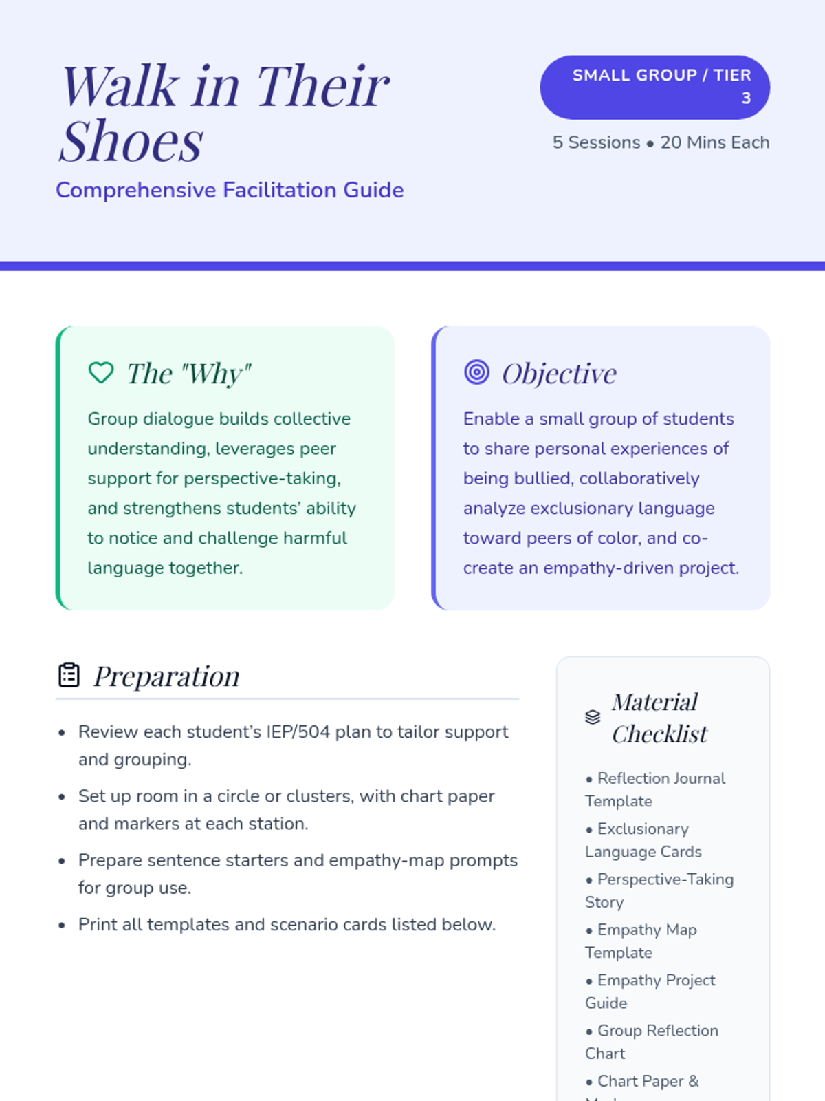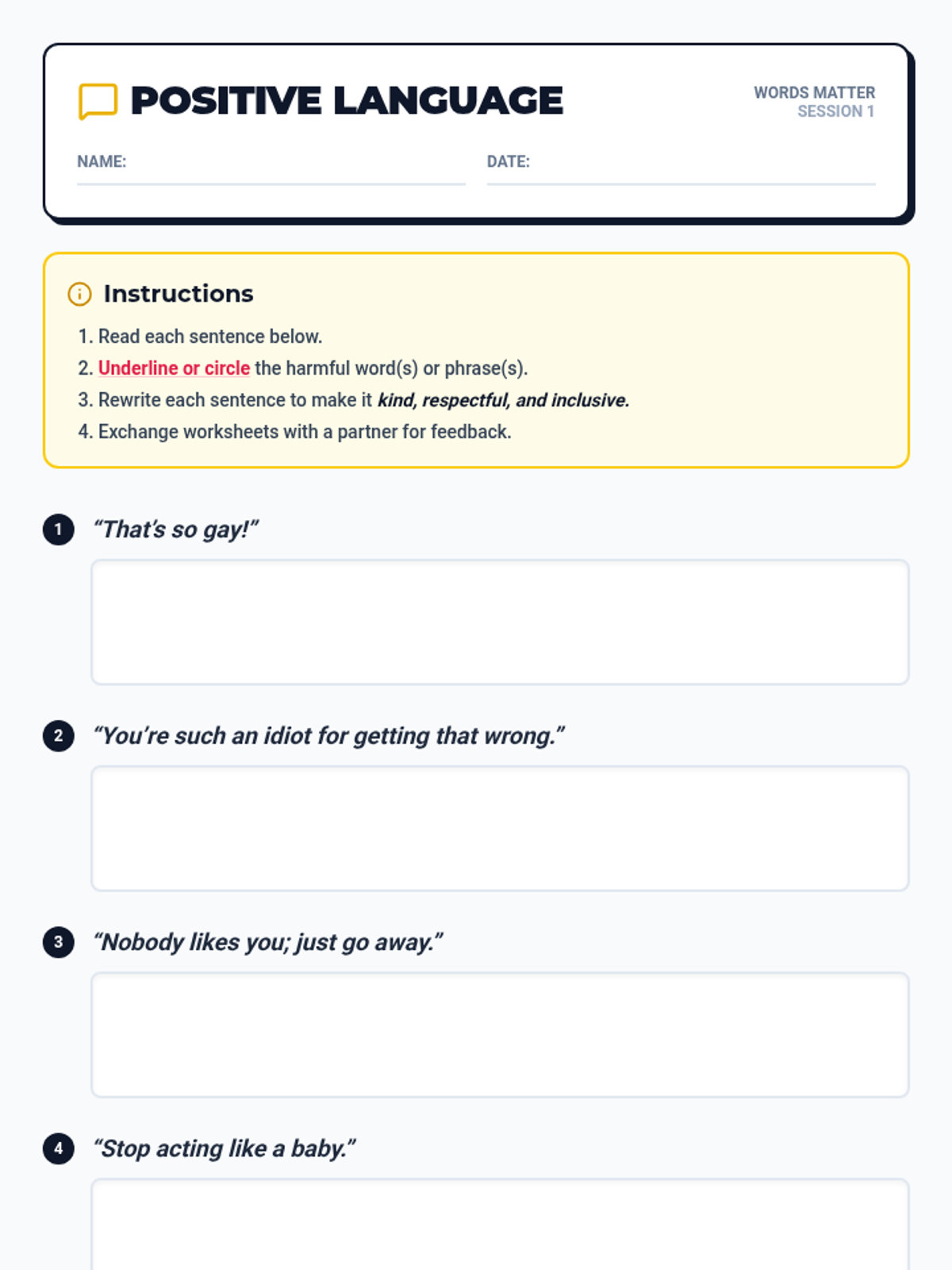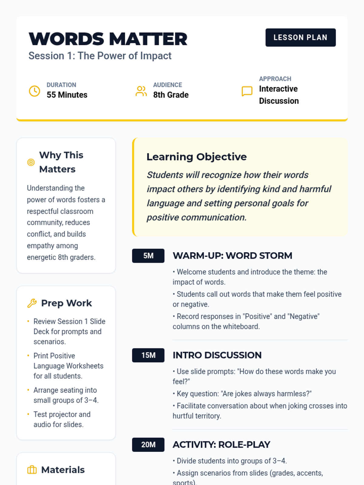A four-session Tier 1 lesson sequence for 8th graders focused on the impact of words, empathy, and building a kind classroom community. Students explore harmful language, practice positive communication, and culminate in a kindness project.