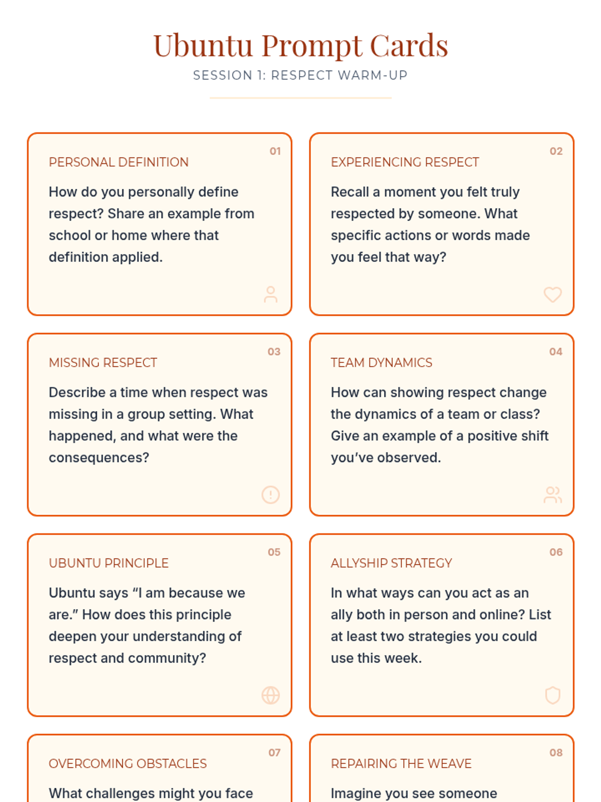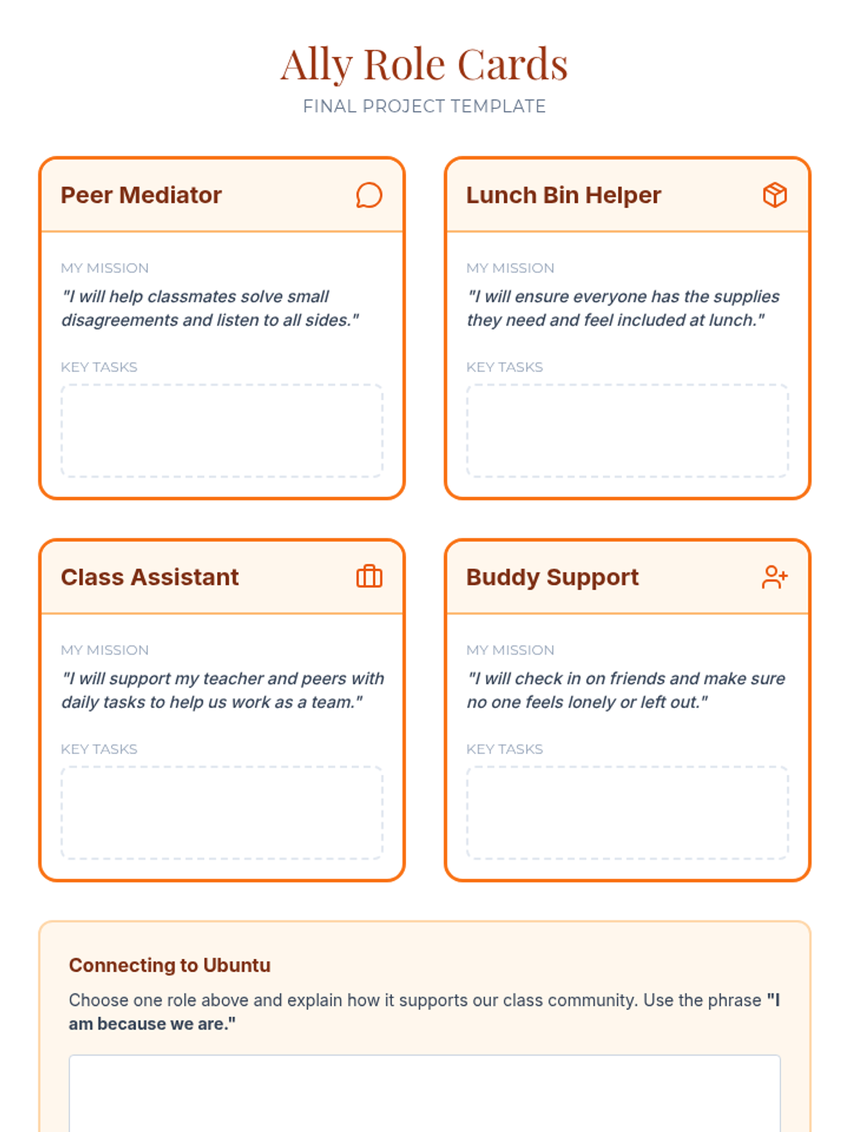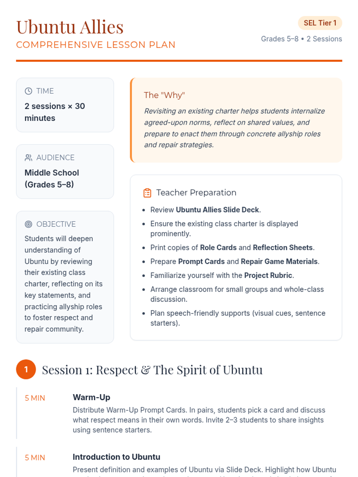A two-session unit for middle school students exploring the African value of Ubuntu. Students build community, practice respect through a class charter, and learn to repair harm using specific allyship roles.