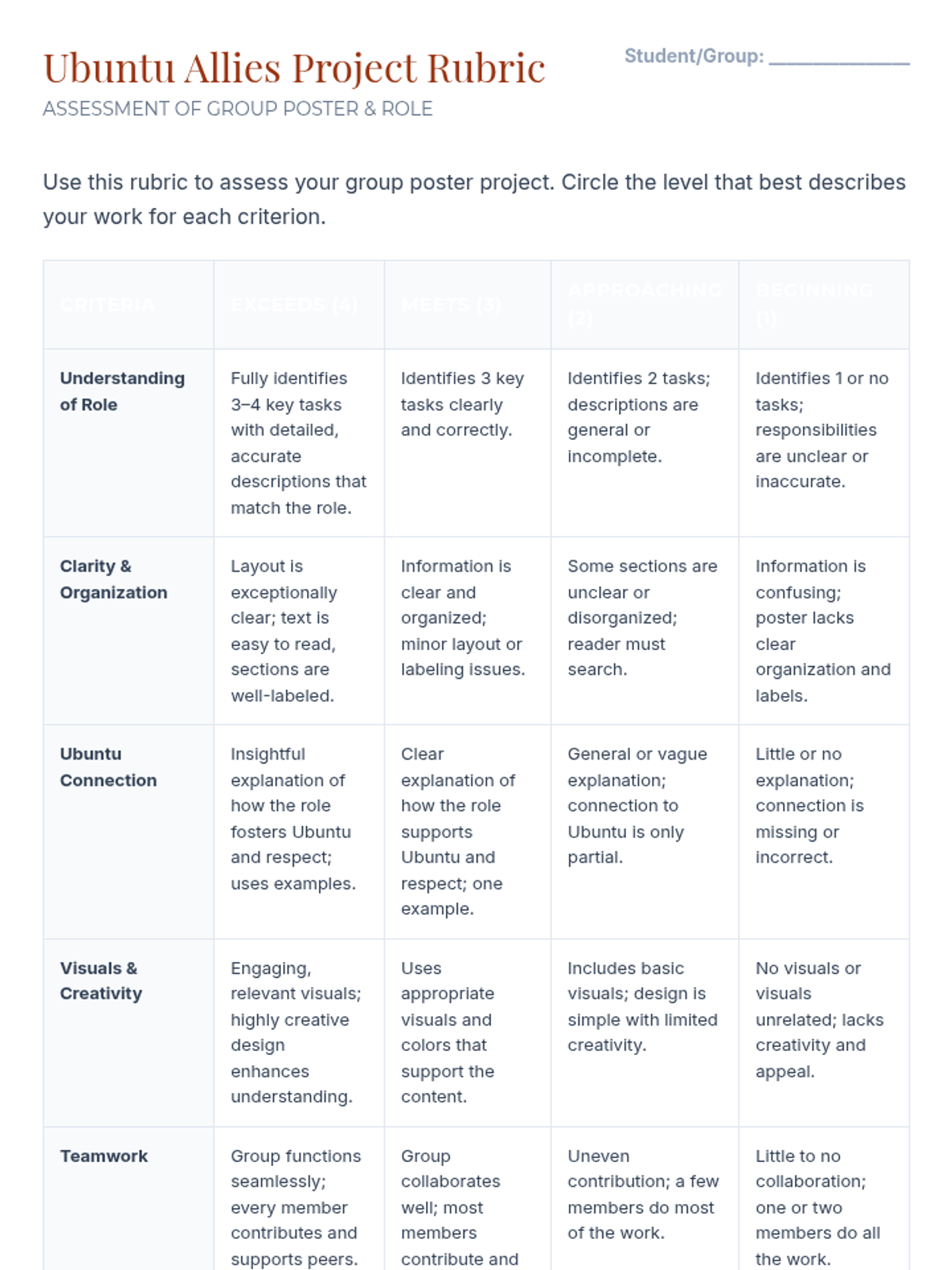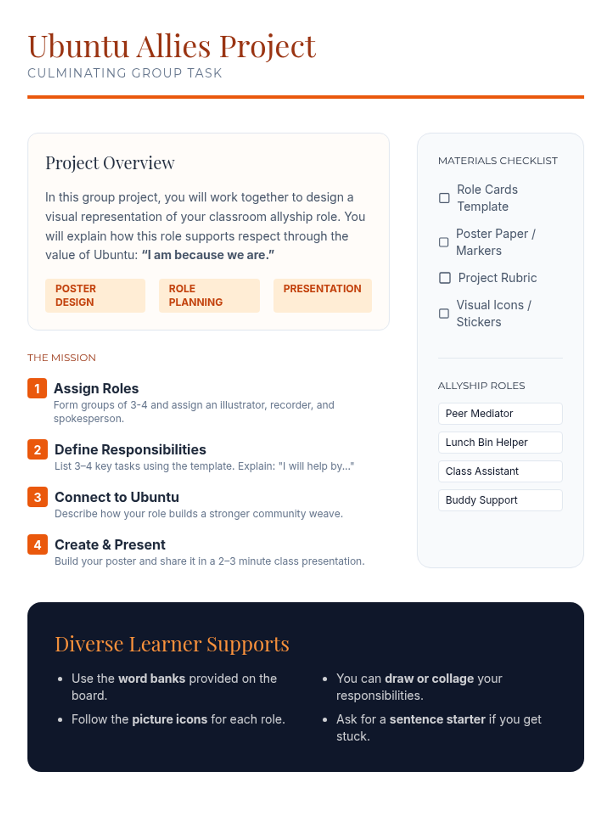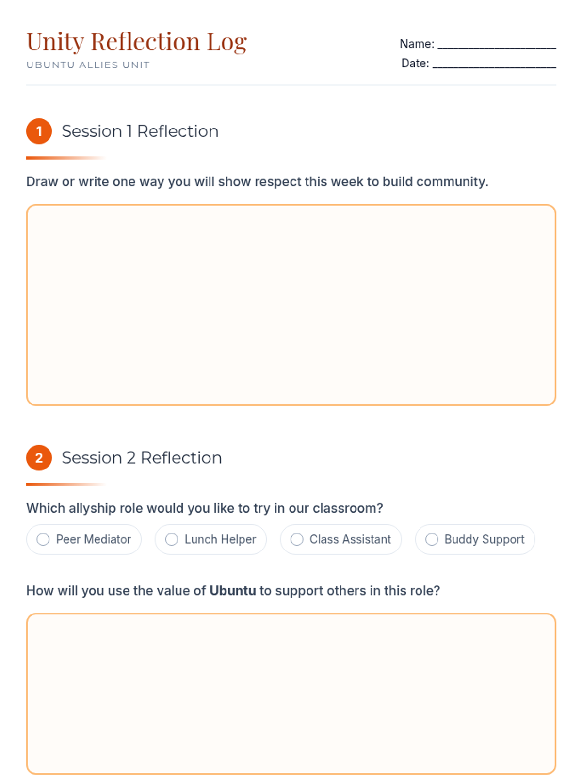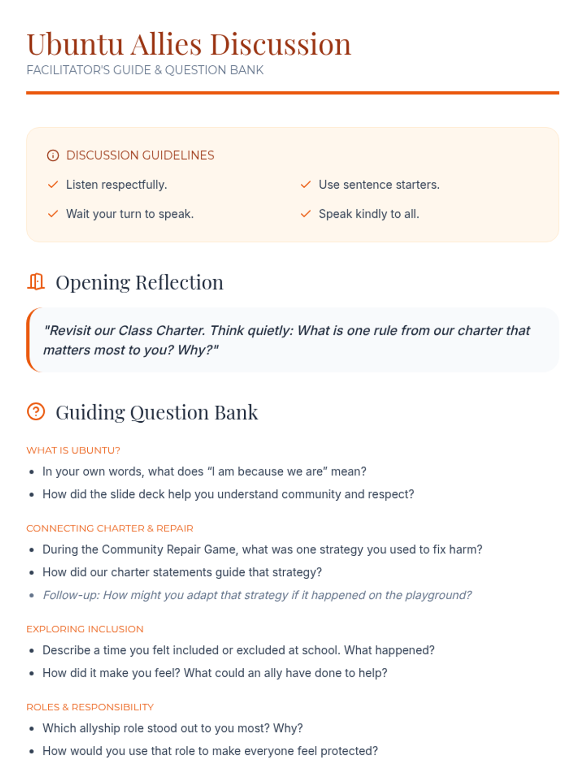A two-session unit for middle school students exploring the African value of Ubuntu. Students build community, practice respect through a class charter, and learn to repair harm using specific allyship roles.