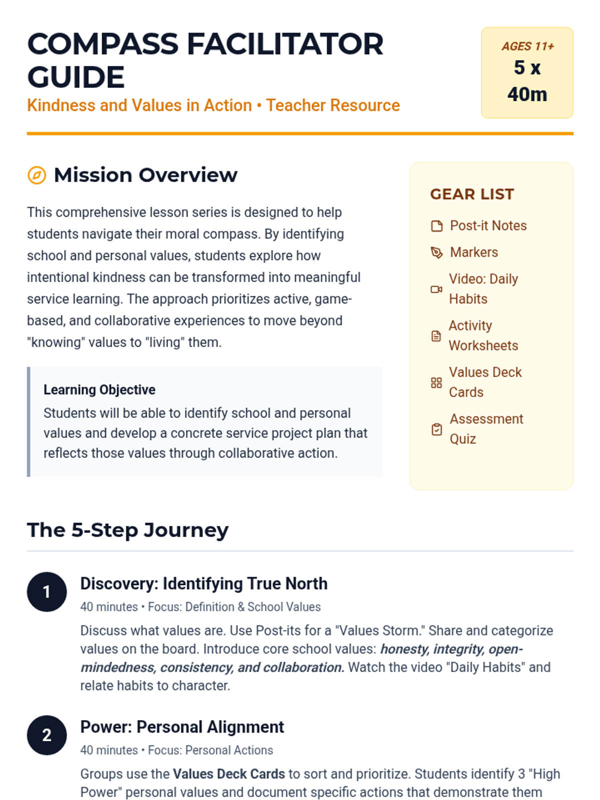 A 5-part lesson series focused on helping students identify personal and school values while developing service learning projects rooted in kindness. Students use active learning and collaboration to transform abstract values into concrete community actions.