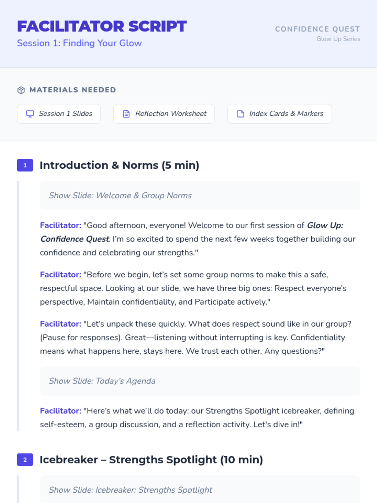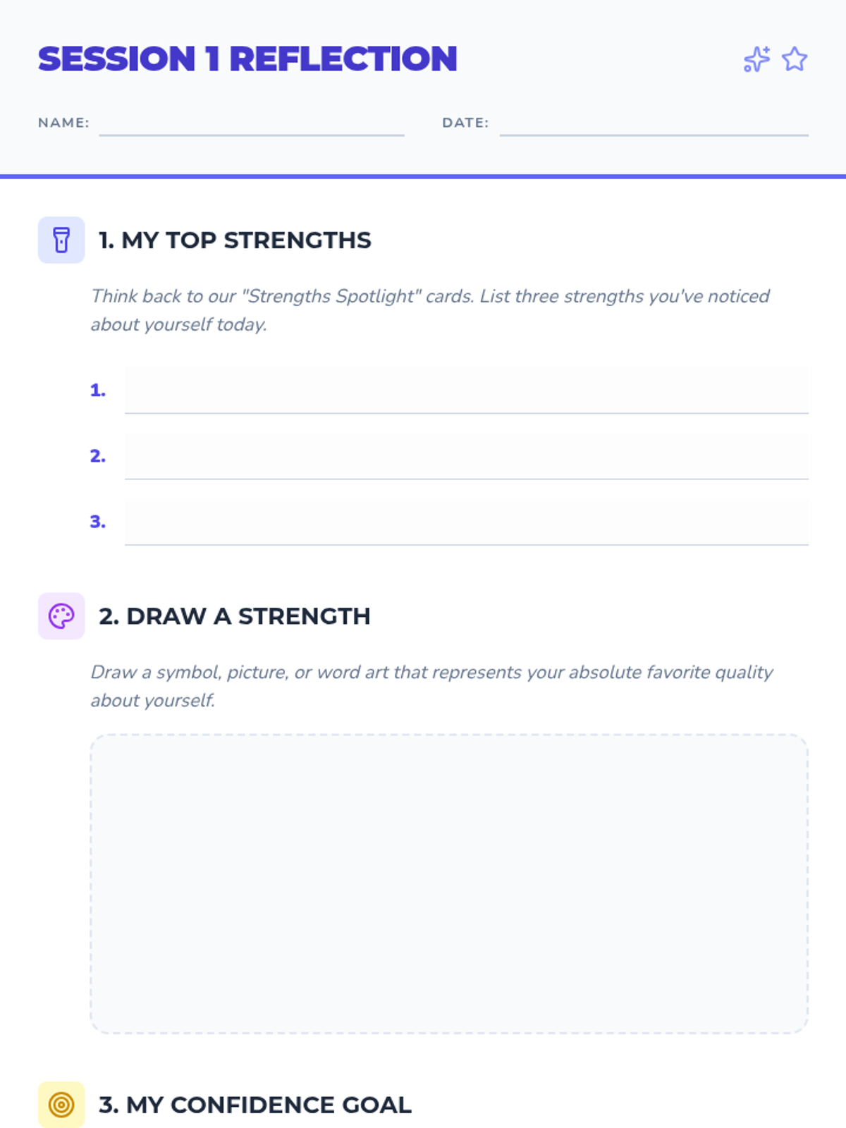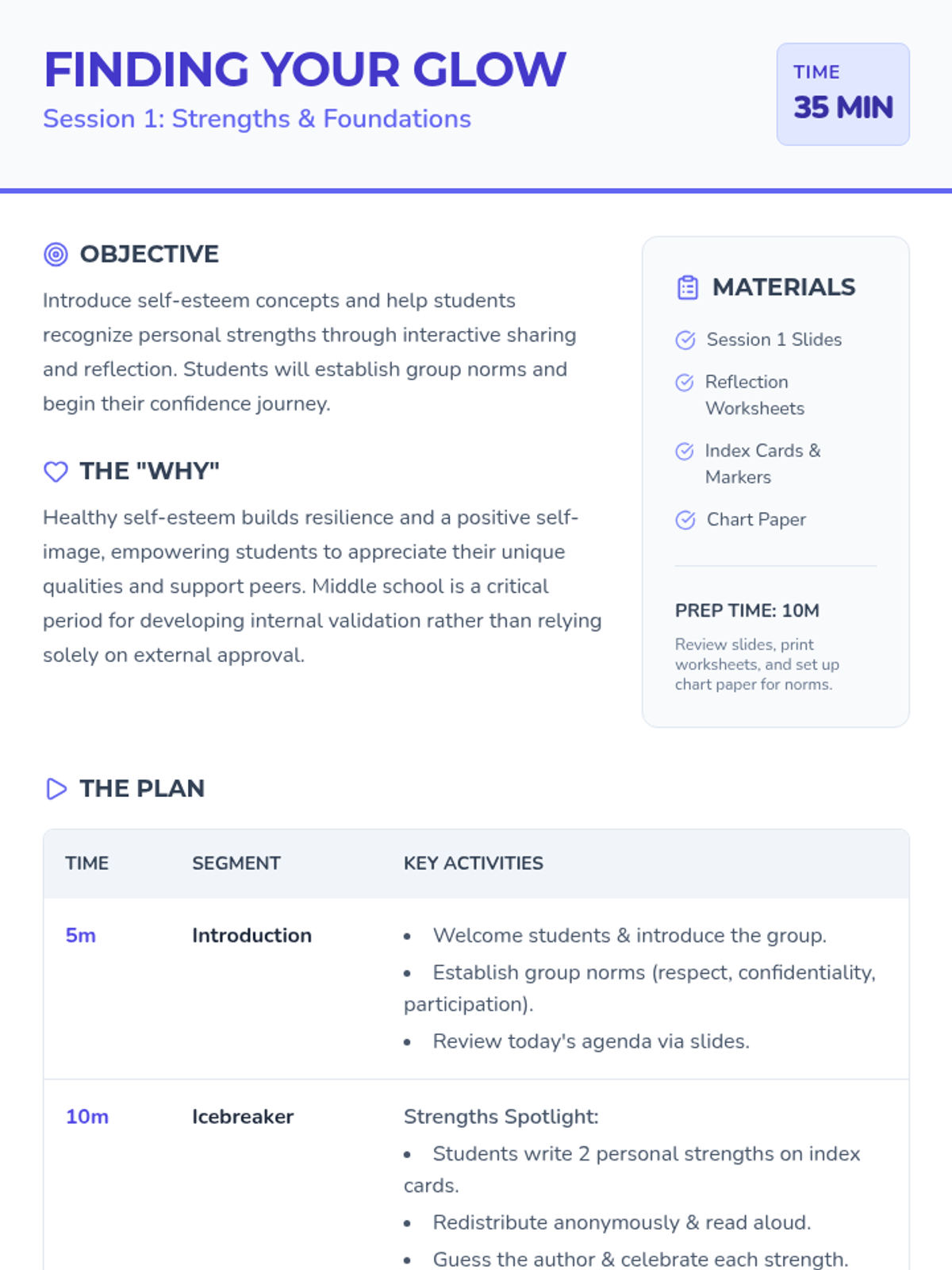 A 6-session self-esteem group for middle school girls focused on building confidence, recognizing strengths, and fostering a positive self-image through interactive discussions and reflective activities.
