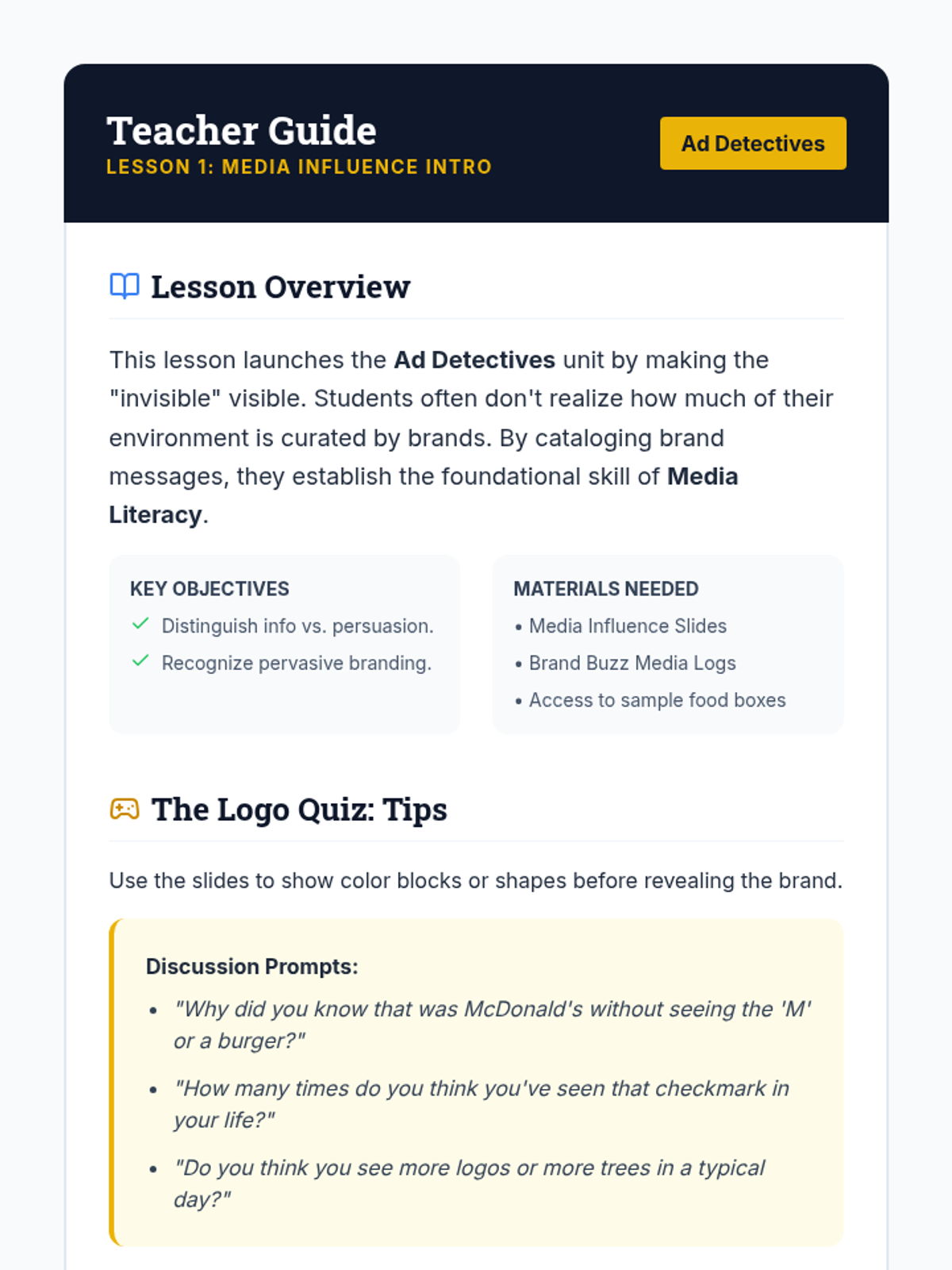 A comprehensive media literacy unit for 7th graders that teaches students to identify, analyze, and deconstruct persuasive advertising techniques across various media platforms. Students progress from recognizing the frequency of ads to critiquing the psychological and visual strategies used to influence consumer behavior.