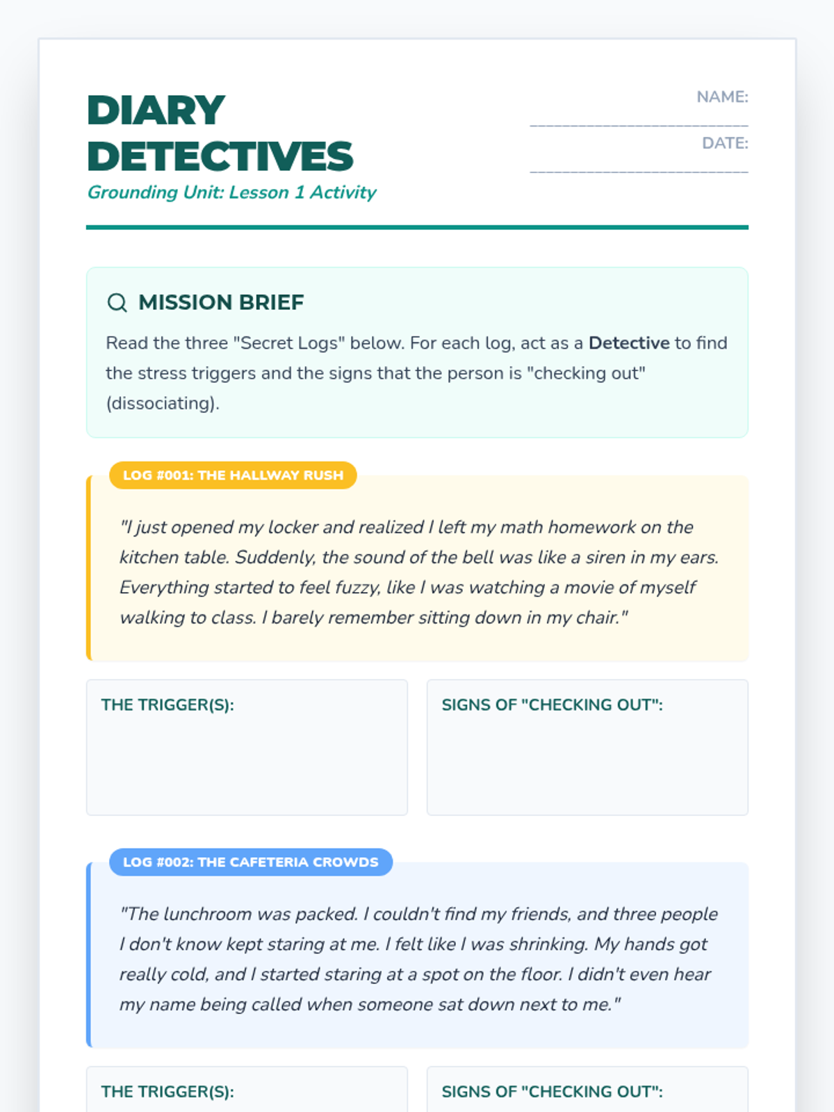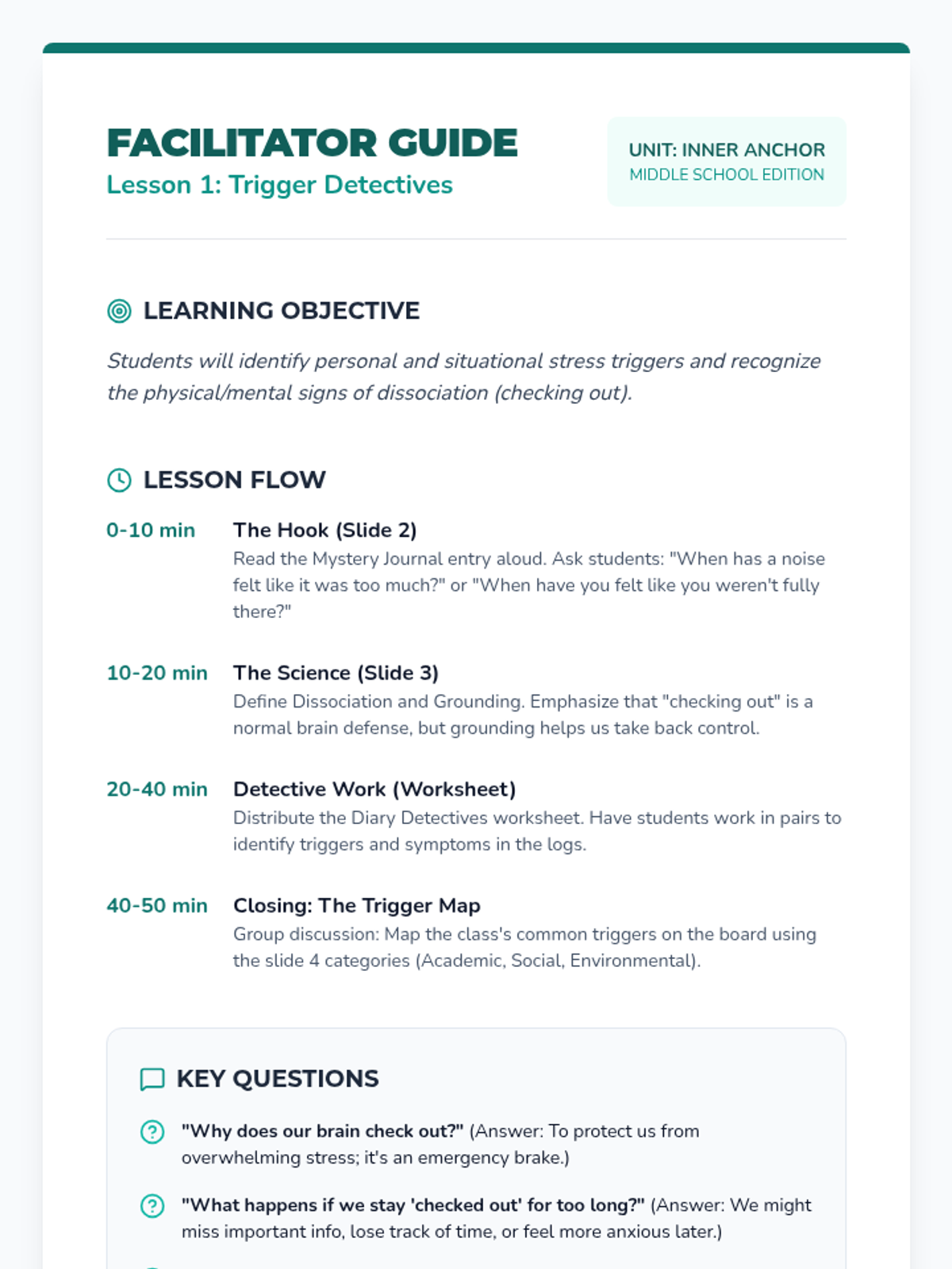 A comprehensive 5-lesson unit helping middle schoolers identify stressors and apply specific grounding techniques to academic, social, and digital contexts through simulation and case studies.