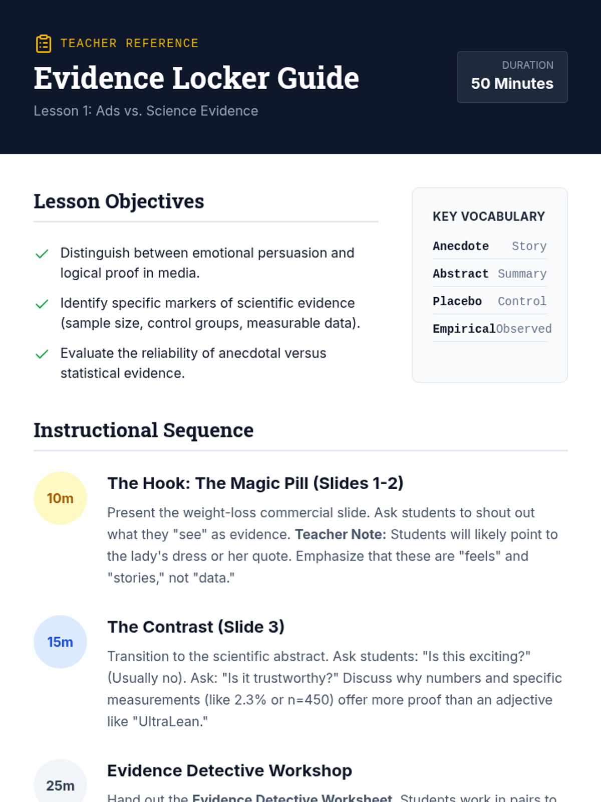 A comprehensive sequence for 8th-grade students to master the art of detecting media bias and evaluating information credibility. Students move from identifying basic bias to deconstructing rhetorical choices, uncovering omitted information, and verifying expert authority.