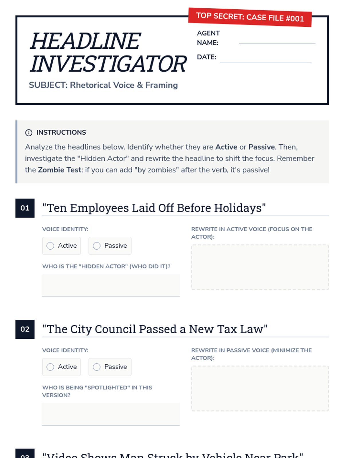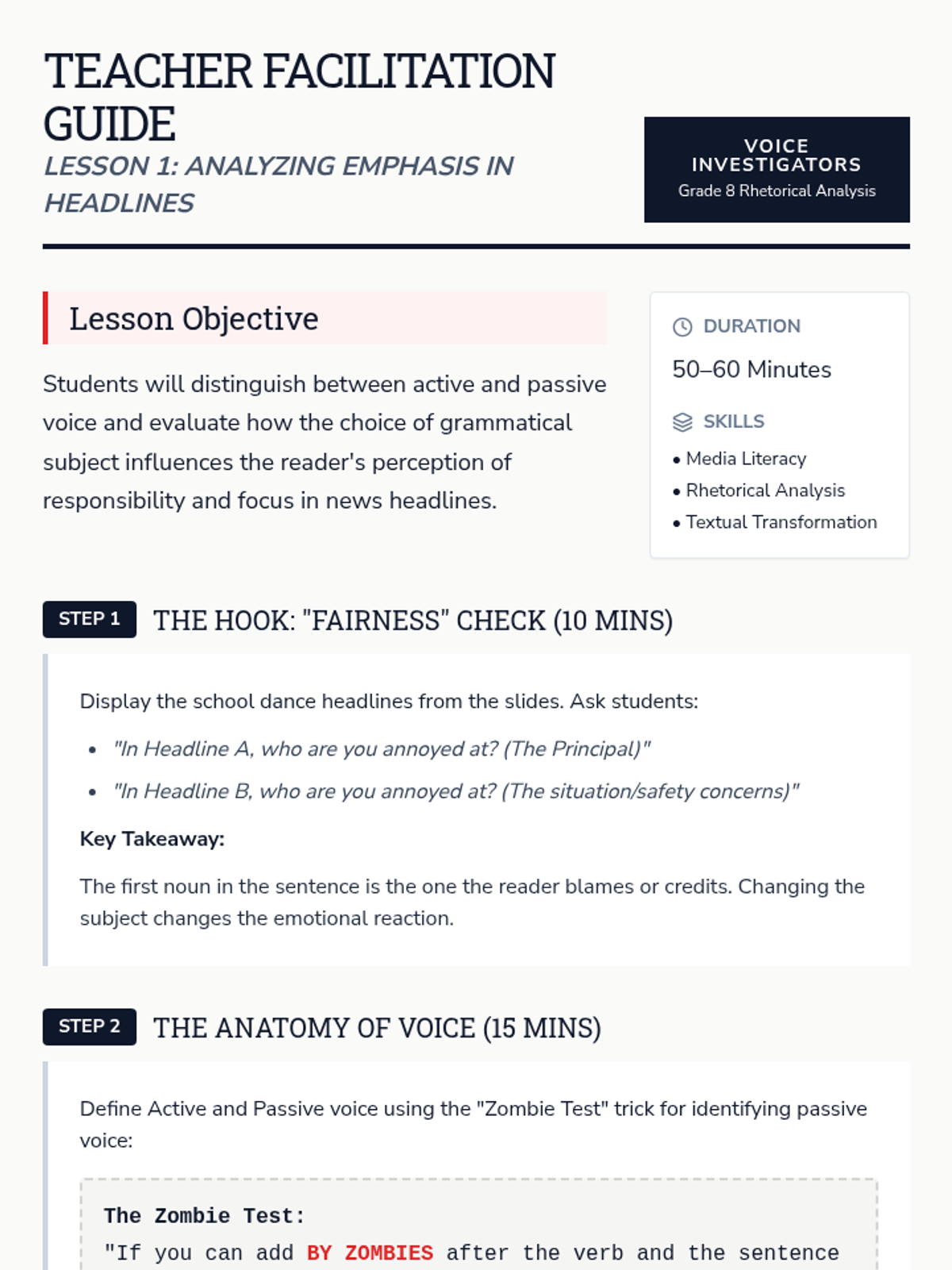 An inquiry-based exploration of active and passive voice through the lens of media literacy, political accountability, and historical agency for 8th-grade students. Students investigate how grammatical choices influence public perception and the ethics of linguistic transparency.