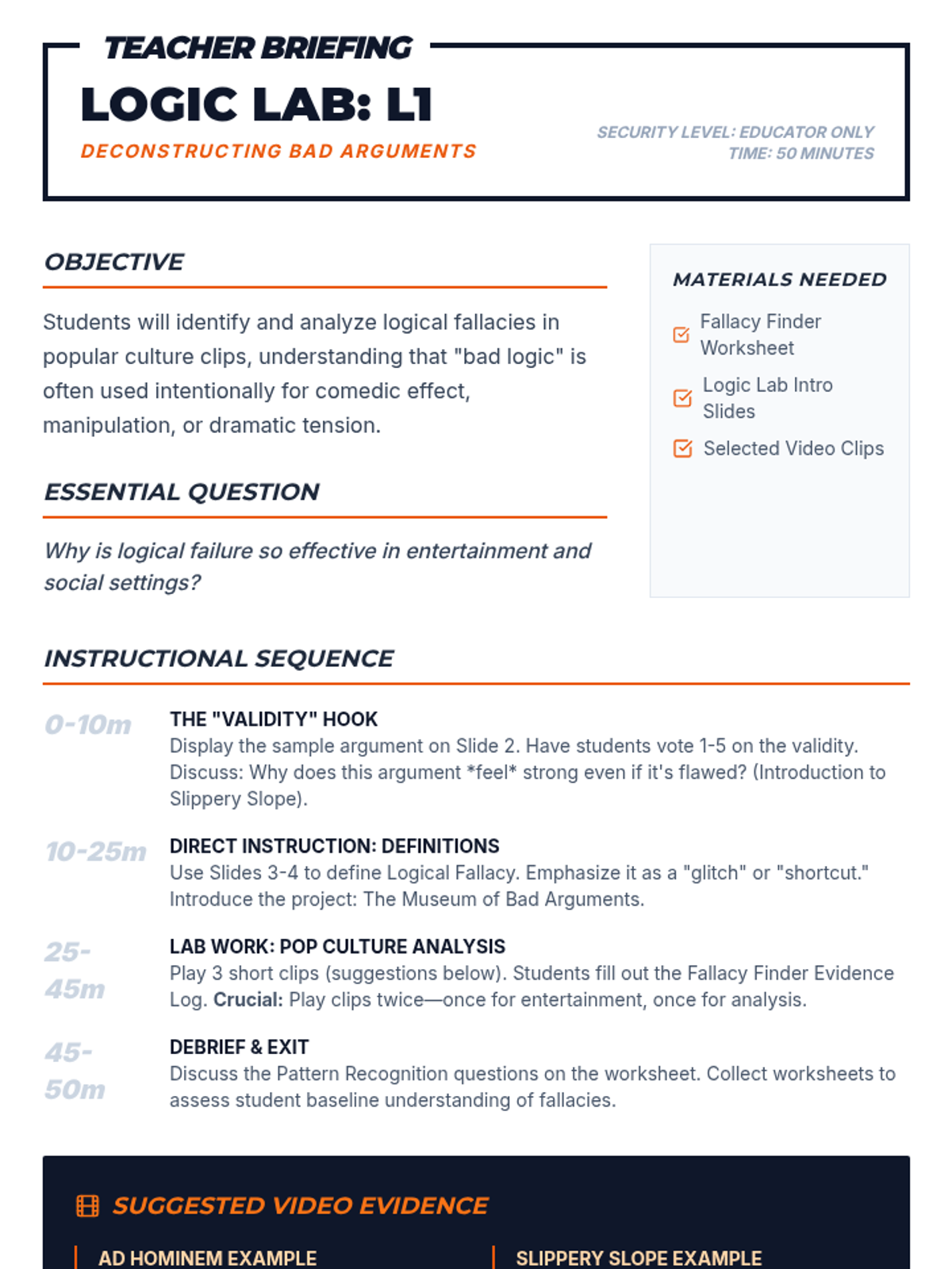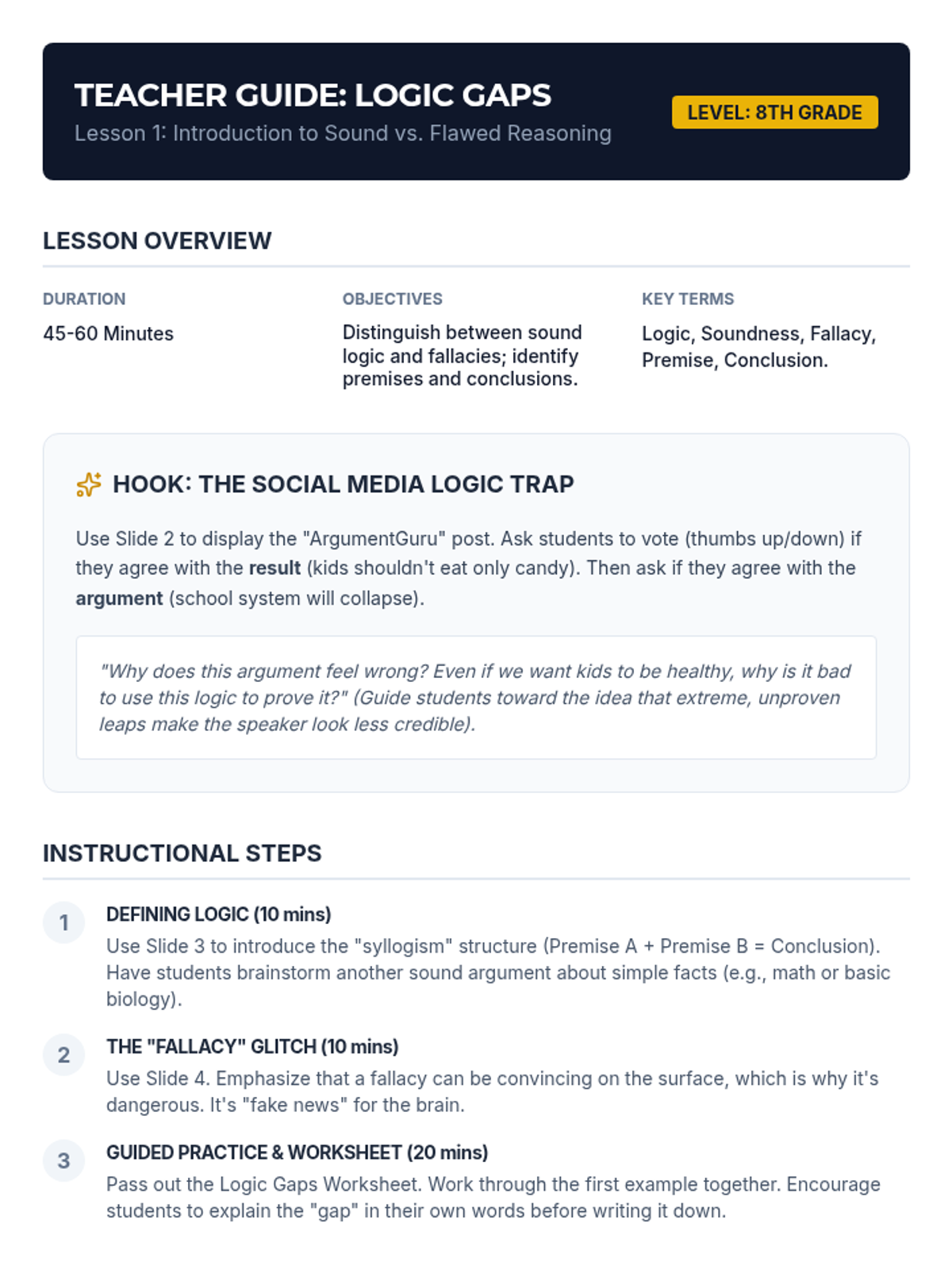 A game-based sequence that trains 8th-grade students to identify and counter logical fallacies in real-time. Students move from analyzing transcripts to participating in high-speed 'Logic Gauntlet' debates where fallacy detection is the key to winning.
