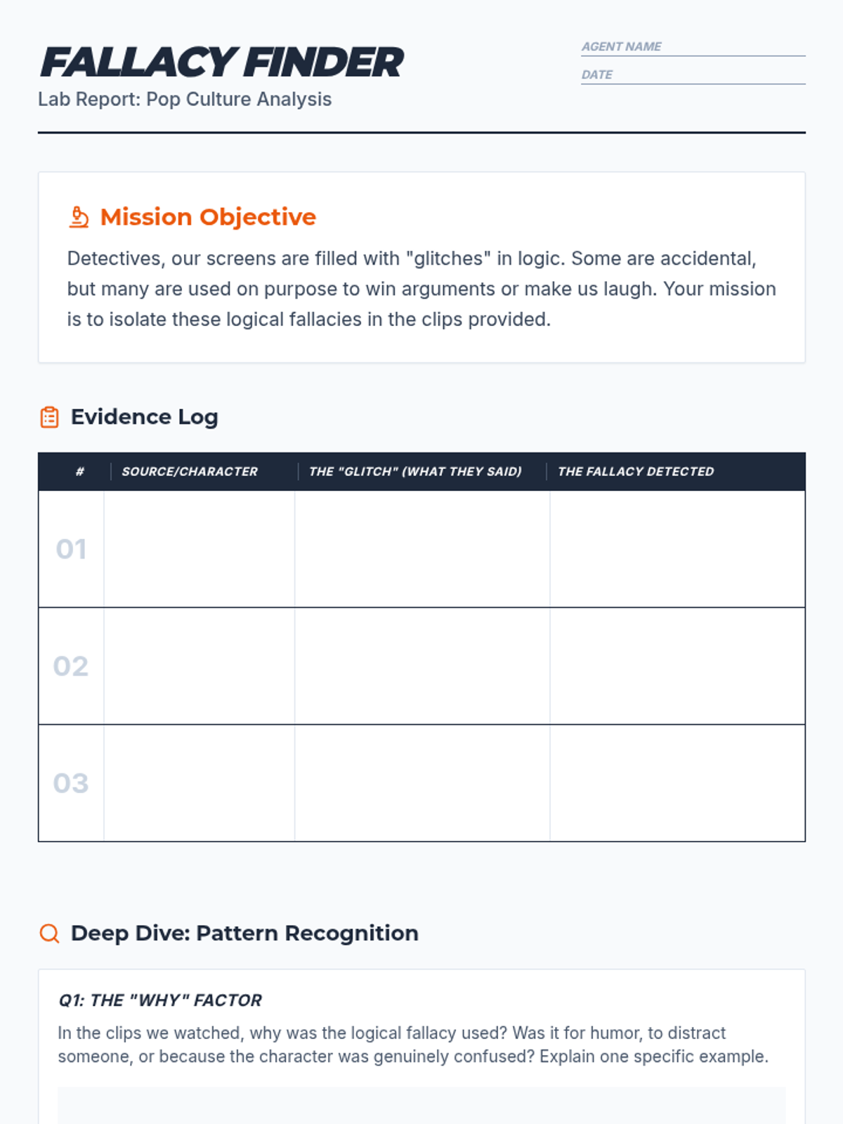 A middle school ELA sequence focused on identifying and deconstructing logical fallacies in modern media, culminating in a critical analysis project. Students learn to distinguish between ethical persuasion and manipulative tactics like False Authority, False Dilemmas, and Straw Man arguments.