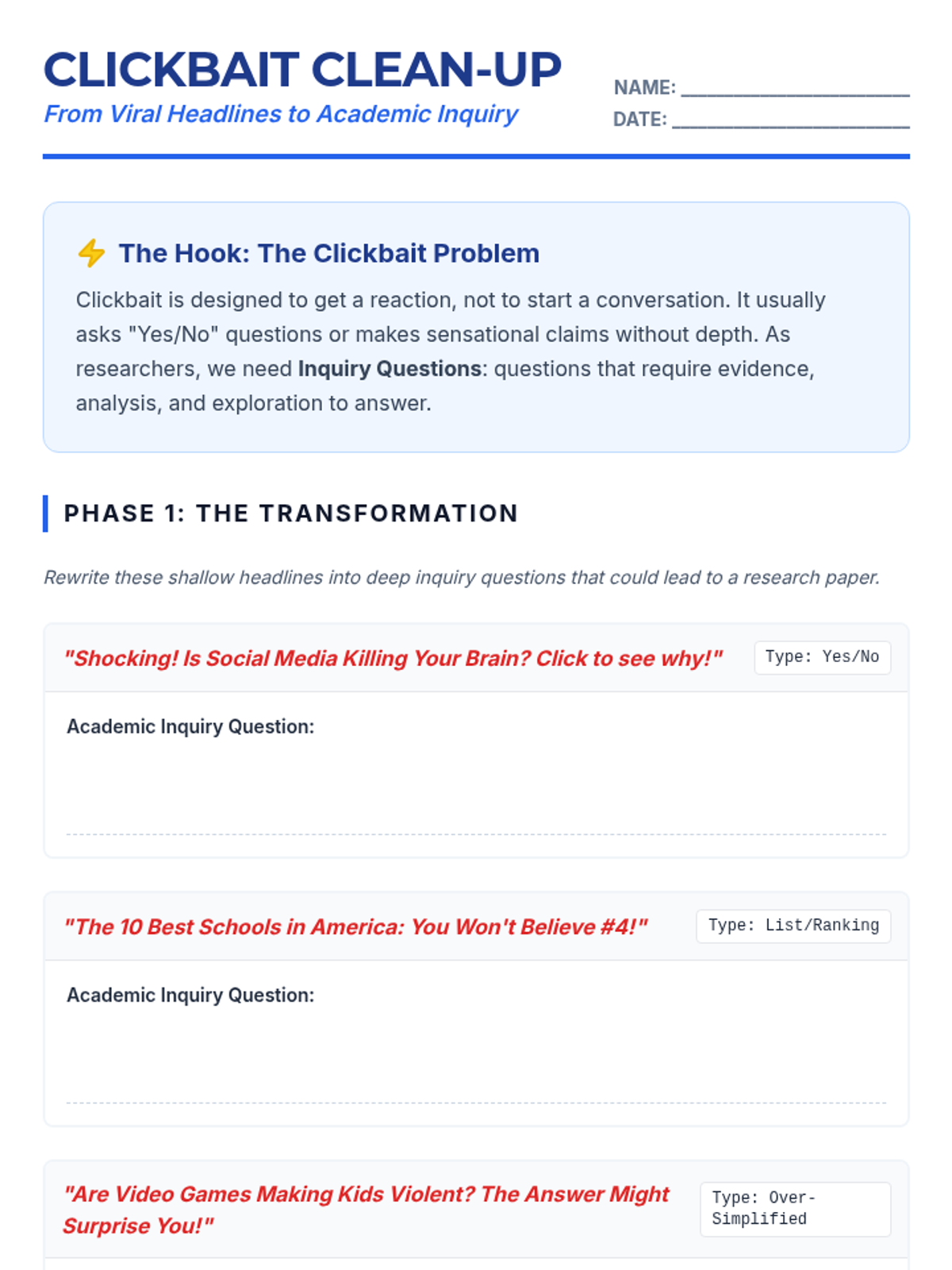 This 8th-grade ELA sequence guides students through the inquiry-based process of transforming a broad research topic into a nuanced, evidence-backed thesis statement. Students progress from initial curiosity to structured inquiry, learning that a thesis is the final destination of a research journey, not just a starting point.
