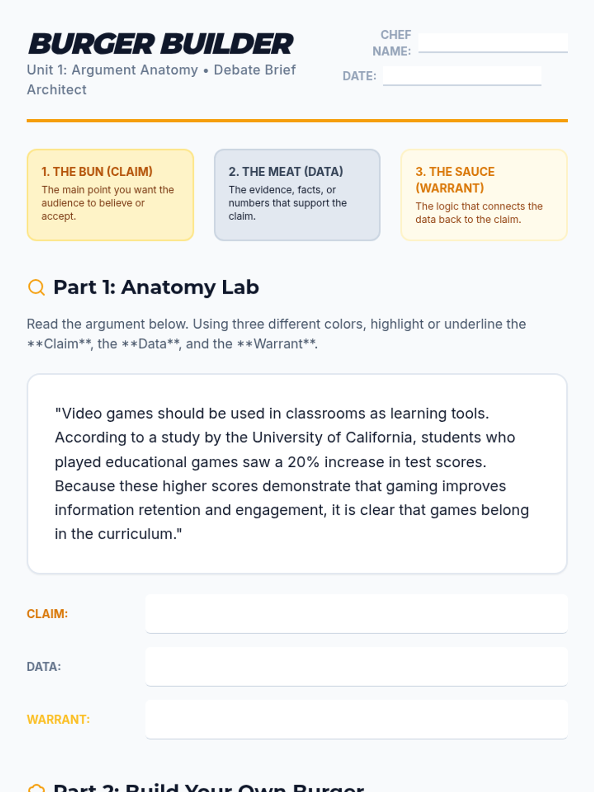 Students learn to research, synthesize, and organize evidence into a structured debate brief, moving from broad curiosity to targeted logical arguments.