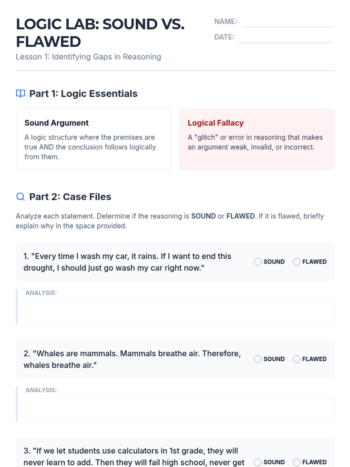A comprehensive unit for 8th-grade students on identifying and analyzing common logical fallacies. Students progress from basic logical structures to specific fallacies like ad hominem, straw man, and slippery slope, culminating in a full-text analysis assessment.