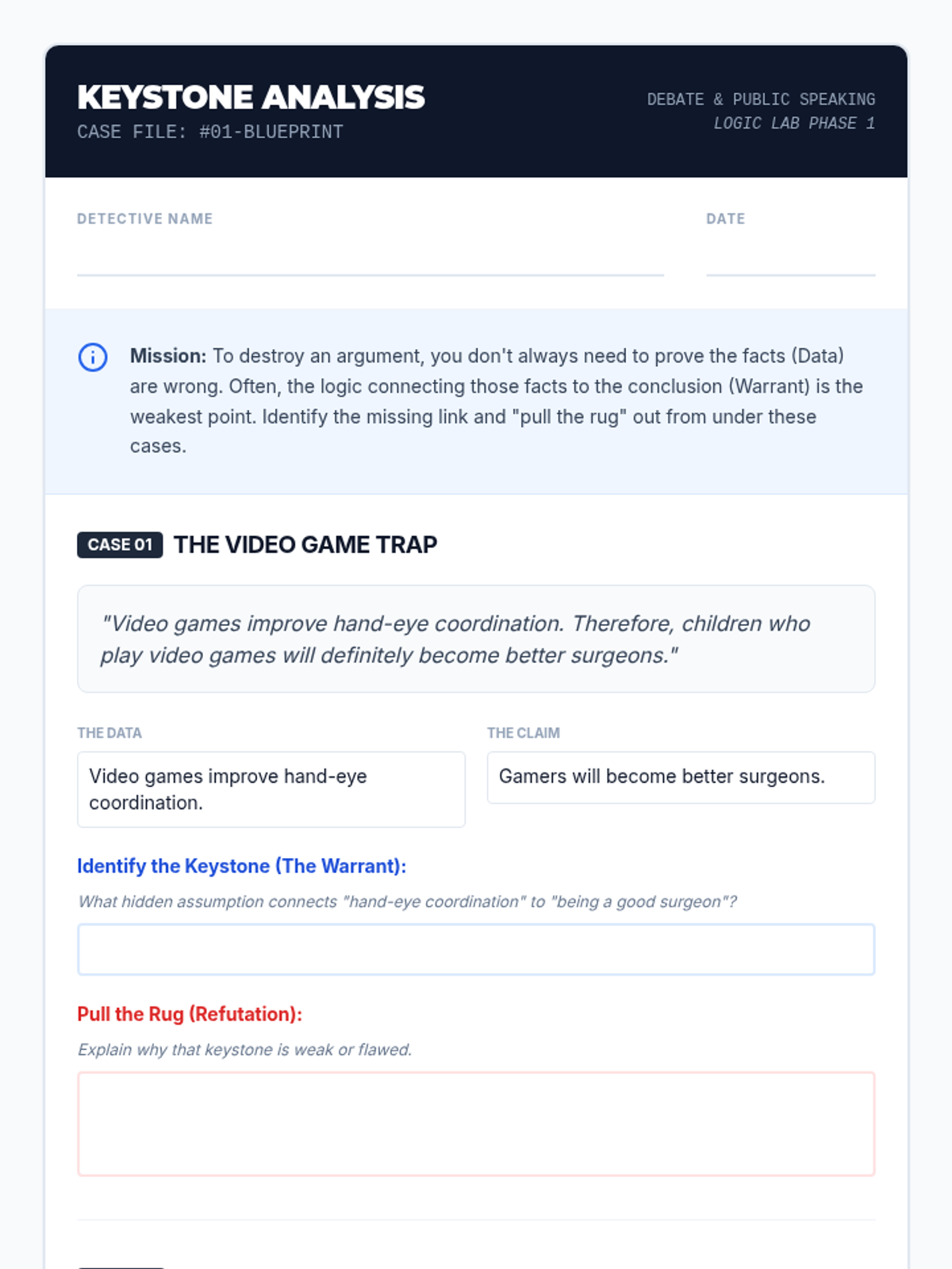 A workshop-style series designed to help 7th grade students strengthen their persuasive writing and speaking by identifying and eliminating logical fallacies. Students learn the Claim-Evidence-Warrant model and focus on avoiding Hasty Generalizations, Red Herrings, and Circular Reasoning.