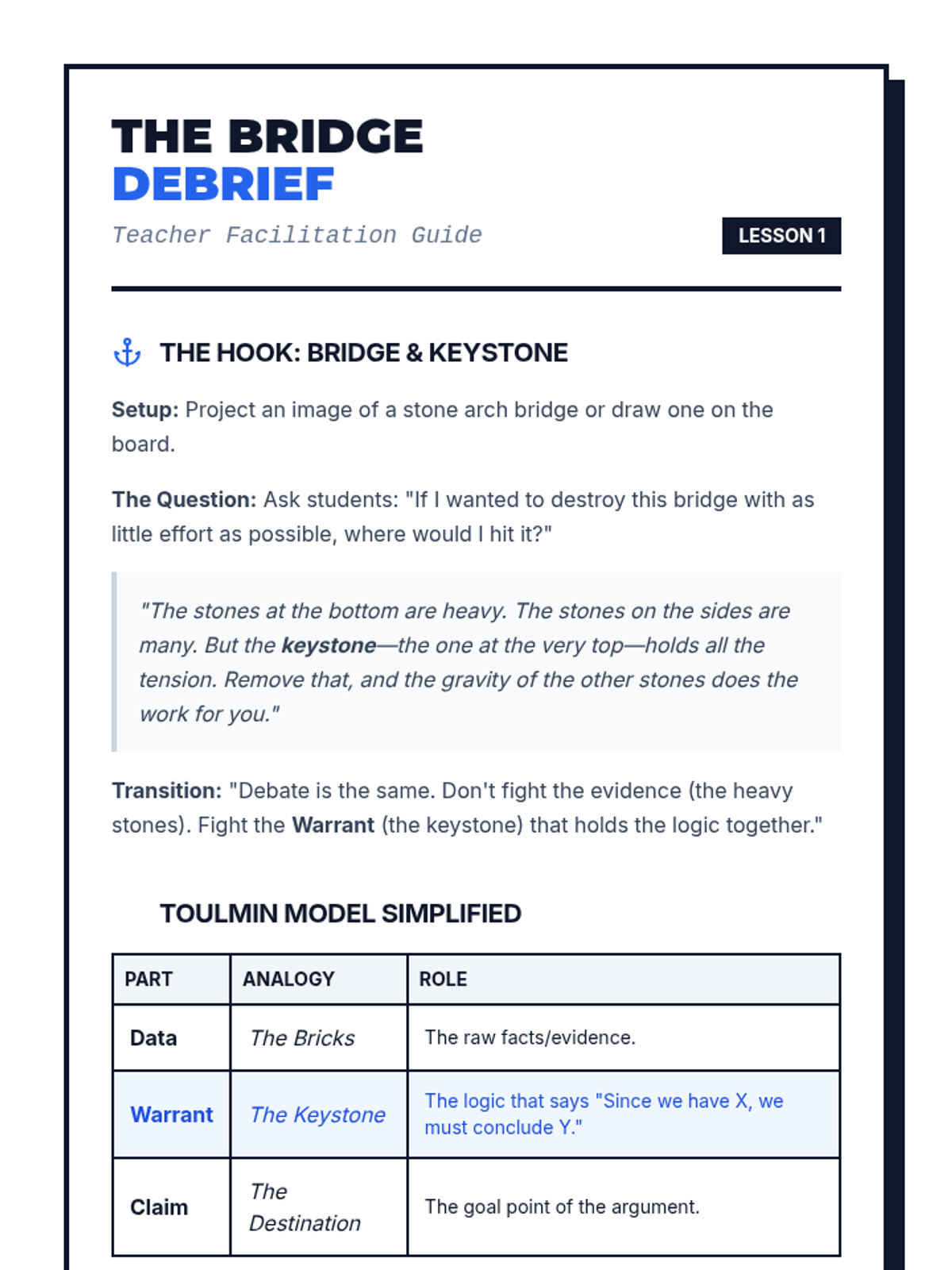 A sequence for 6th-grade students focused on transforming raw research into organized debate briefs using the 'Tag and Cite' method and the SEP categorization framework. Students learn to structure arguments through the Claim-Warrant-Data-Impact model and practice rapid information retrieval.