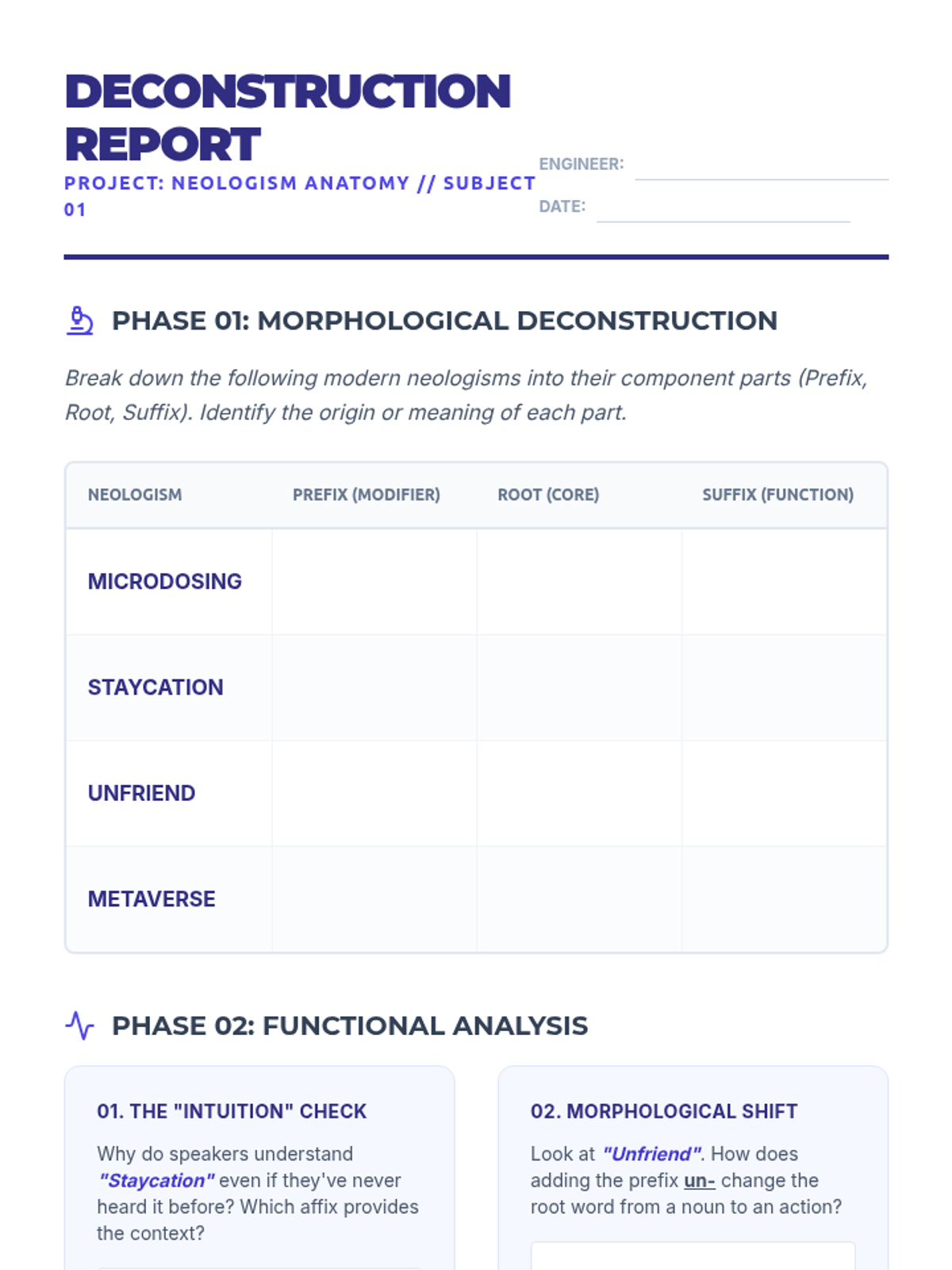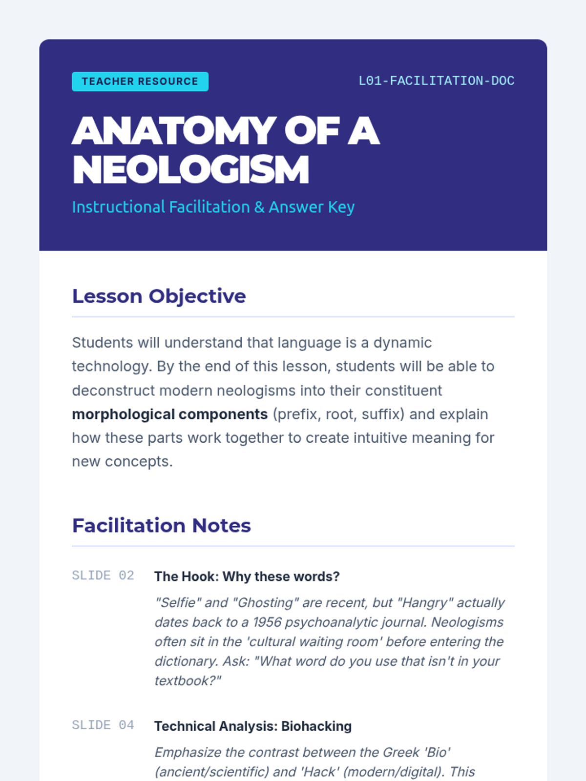 An 8th-grade ELA sequence where students act as linguistic engineers, exploring etymology and morphology to construct original neologisms for modern concepts. Students move from analyzing current linguistic trends to designing, defining, and pitching their own invented terms.